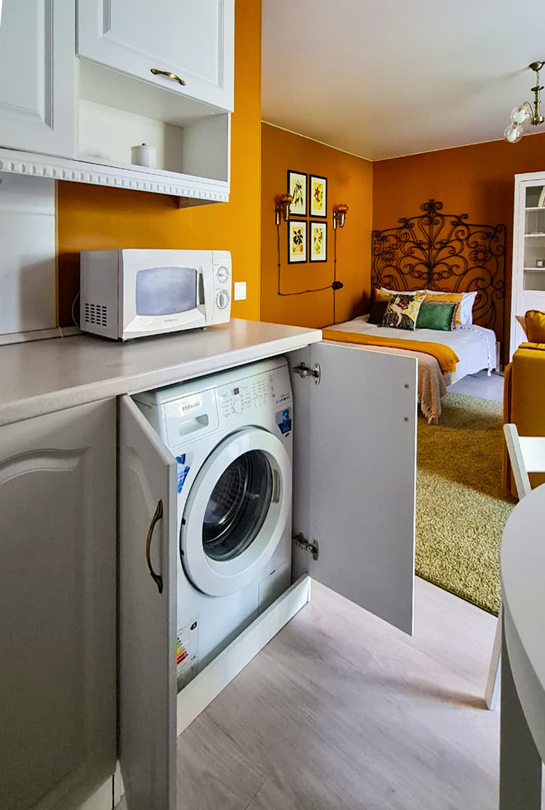 - Микроволновка, чайник, посуда и всё для готовки.