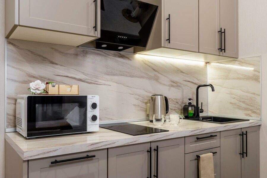 - полностью оборудованная кухня (плита, холодильник, чайник, микроволновая печь и посуда);