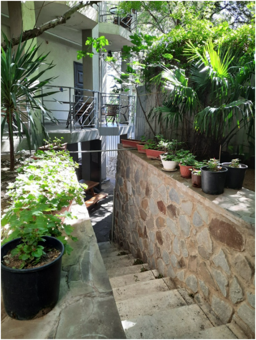 Во дворе мангальная зона, огороженный двор, смотровая крыша со столиками.