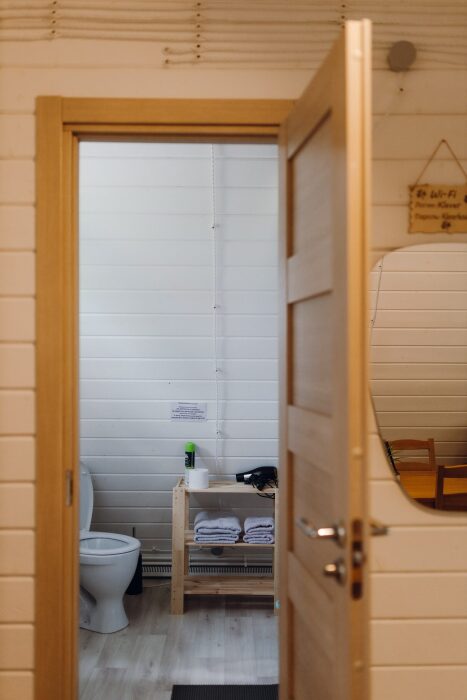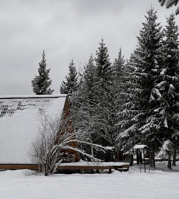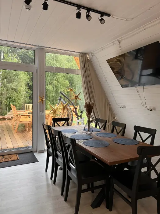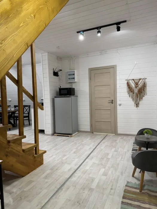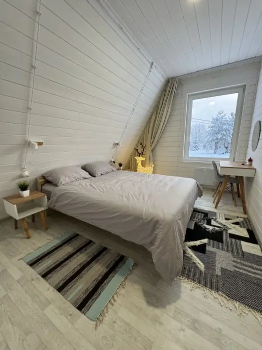 Из удобств в каждом домике: мини-кухня со всем необходимым (микроволновка, холодильник, варочная панель, посуда, чайник); санузел с душем (полотенца, средства гигиены, фен); отдельная спальня на 1м этаже, двуспальный матрас под крышей и двуспальный диван внизу; бесплатный Wi-Fi, телевизор; отопление; ортопедические удобные матрасы, хлопковое постельное белье; собственная терраса с качелью, мангал.