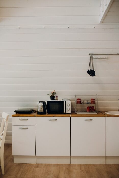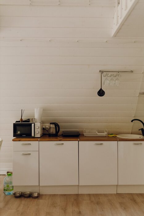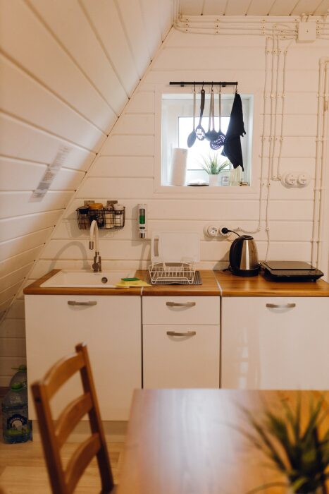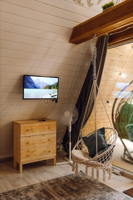 Из удобств в каждом домике: мини-кухня со всем необходимым (микроволновка, холодильник, варочная панель, посуда, чайник); санузел с душем (полотенца, мыло и гель для душа, фен); бесплатный Wi-Fi, телевизор; отопление; двуспальный диван на 1 этаже и двуспальный матрас под крышей, ортопедические удобные матрасы, хлопковое постельное белье; собственная терраса с качелью, мангал.