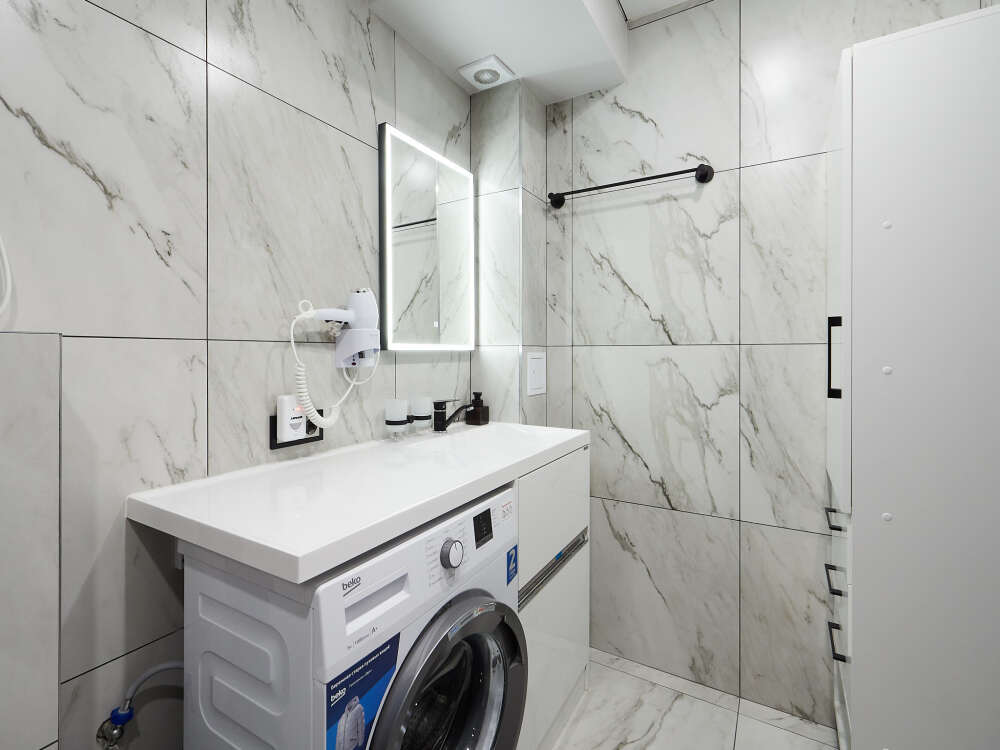 - Современная техника: Полностью оборудованная кухня с бытовой техникой (холодильник, плита, микроволновая печь, чайник). Также имеется стиральная машина и большой телевизор для приятного досуга.