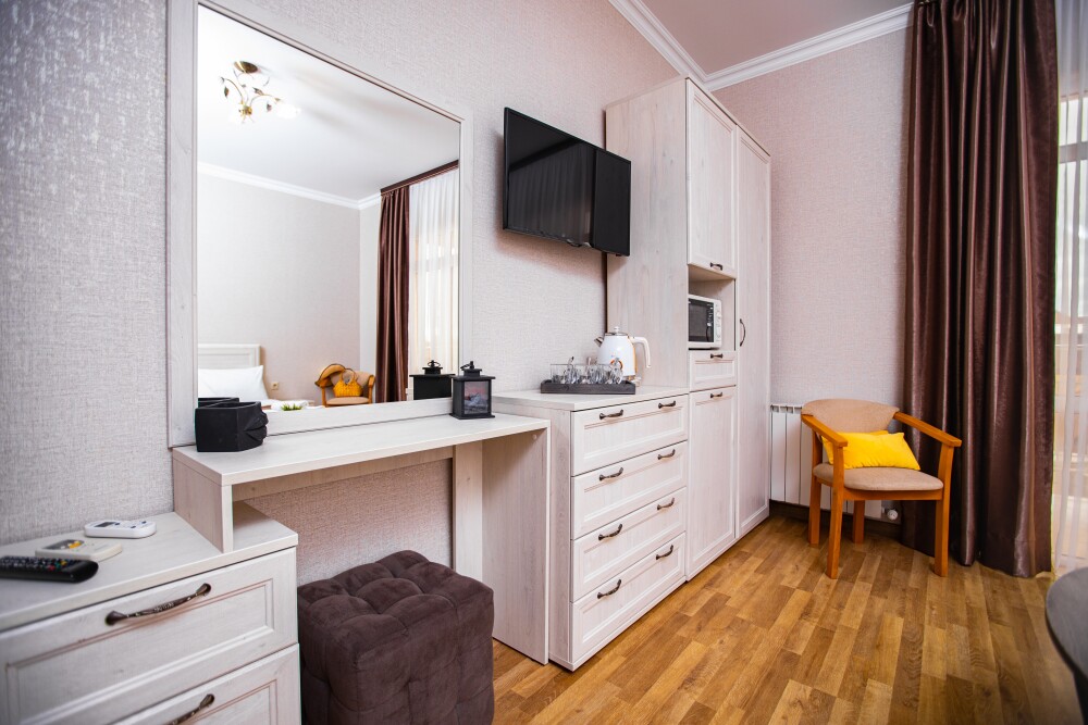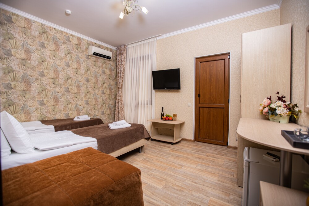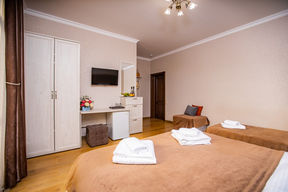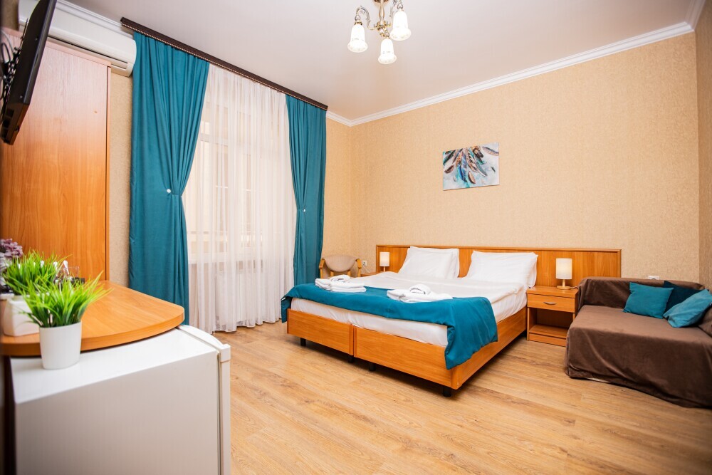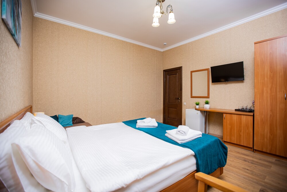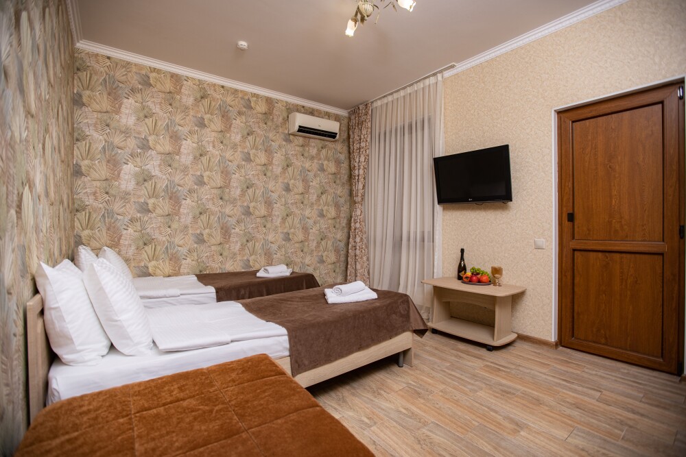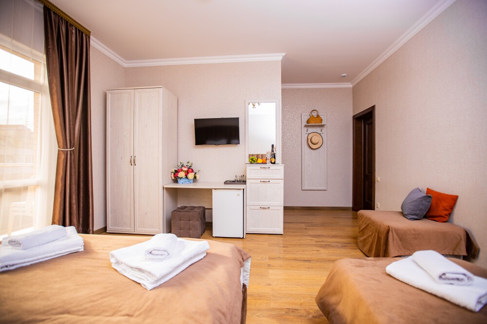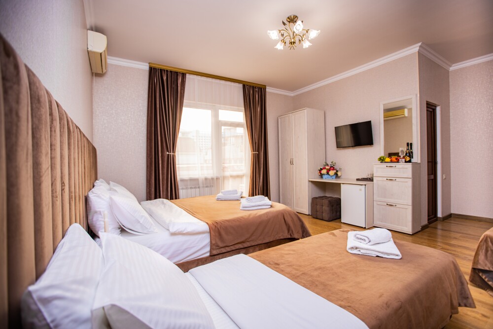 Просторный стандартный номер (20 м2) идеально подходит для размещения четырёх гостей. Продуманная планировка включает: удобную двуспальную кровать для полноценного отдыха, односпальную кровать и мягкую софу — два дополнительных спальных места. В номере есть всё необходимое для комфорта: кондиционер поддерживает оптимальную температуру, телевизор создаёт настроение для вечернего досуга, а собственный балкон приглашает насладиться свежим воздухом. Фен и прочие удобства уже на месте — остаётся только заселяться и чувствовать себя как дома.