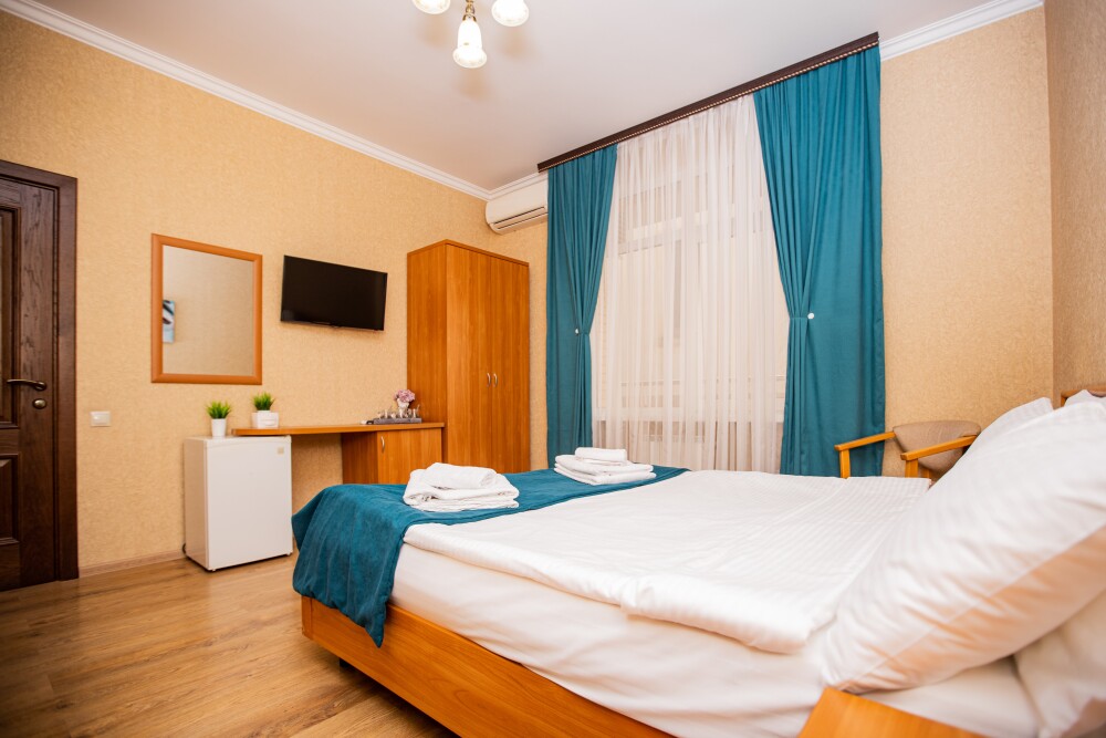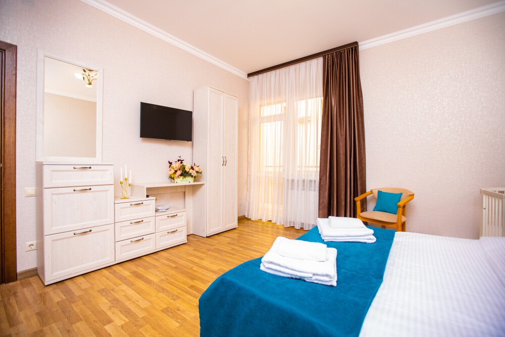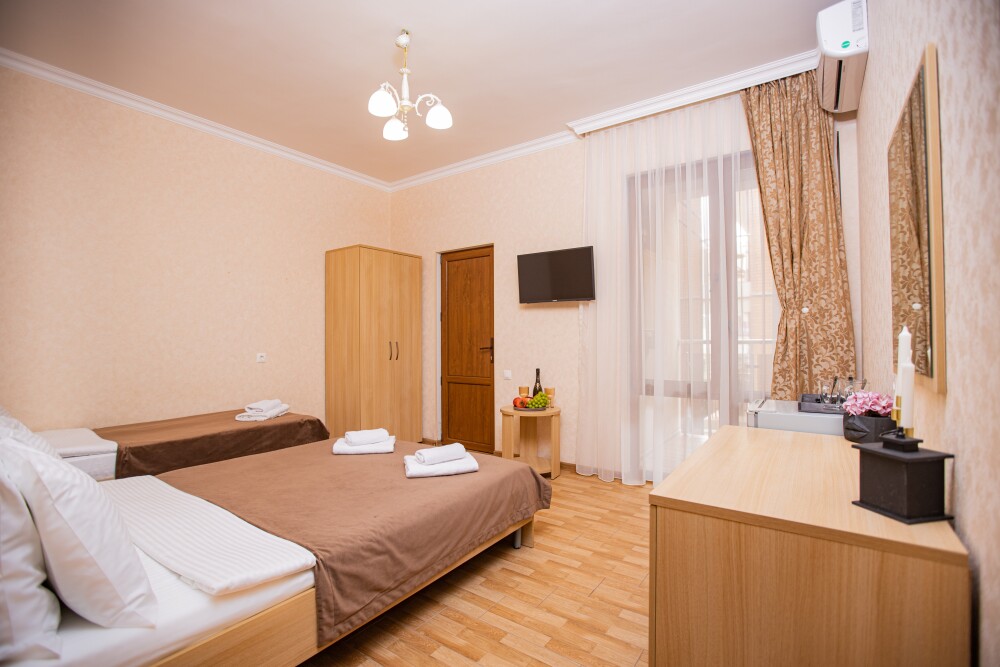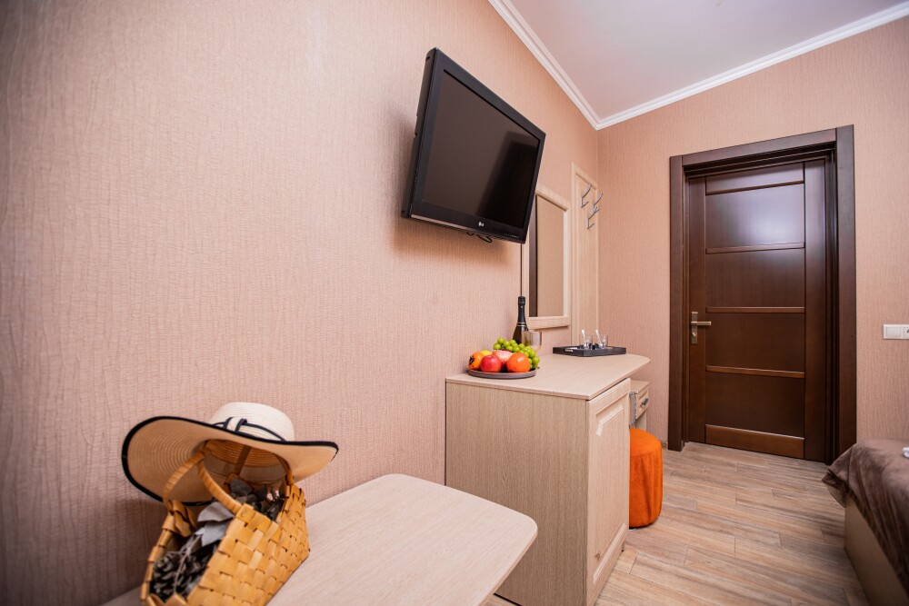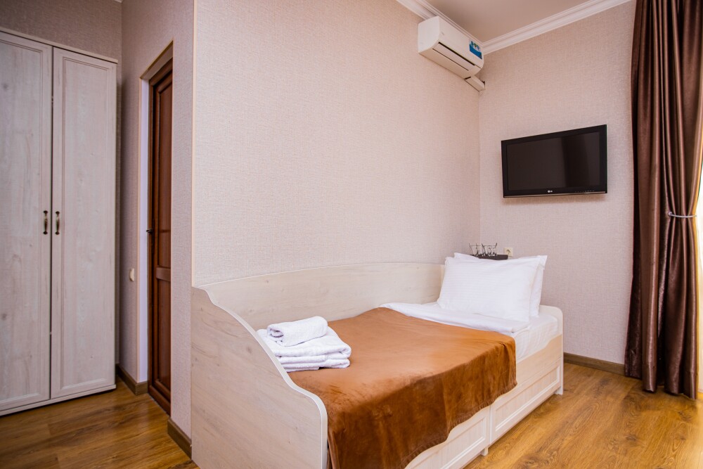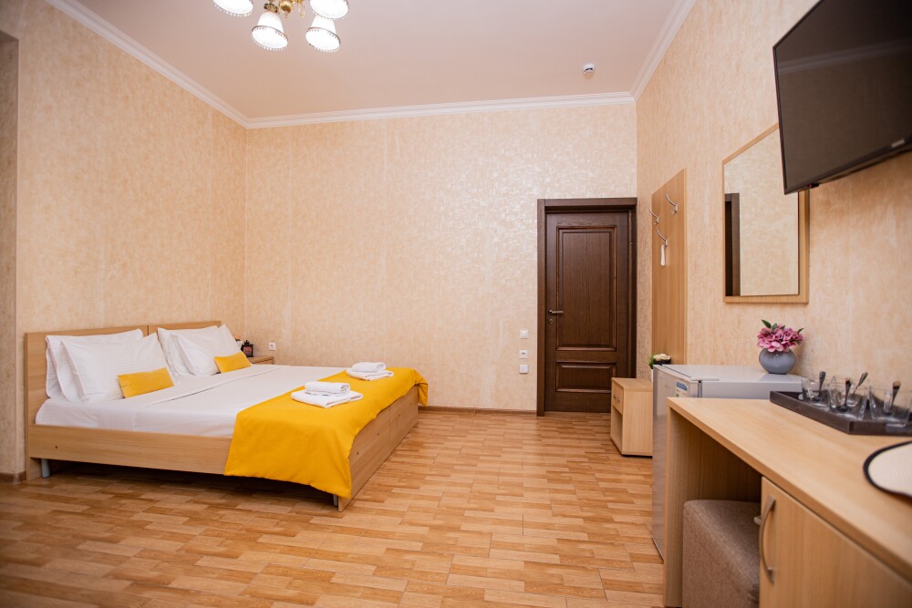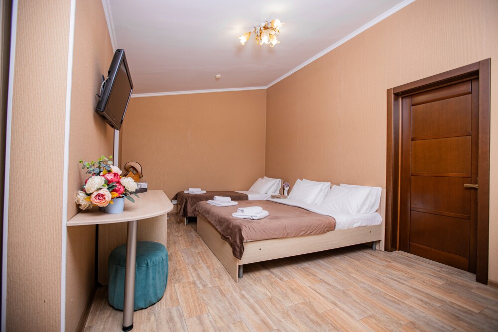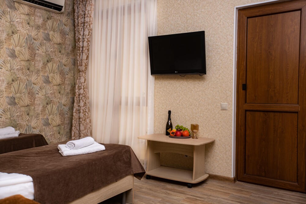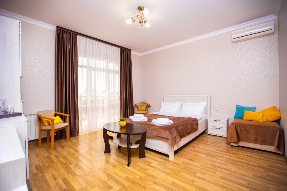 Просторный стандартный номер (20 м2) идеально подходит для размещения четырёх гостей. Продуманная планировка включает: удобную двуспальную кровать для полноценного отдыха, односпальную кровать и мягкую софу — два дополнительных спальных места. В номере есть всё необходимое для комфорта: кондиционер поддерживает оптимальную температуру, телевизор создаёт настроение для вечернего досуга, а собственный балкон приглашает насладиться свежим воздухом. Фен и прочие удобства уже на месте — остаётся только заселяться и чувствовать себя как дома.