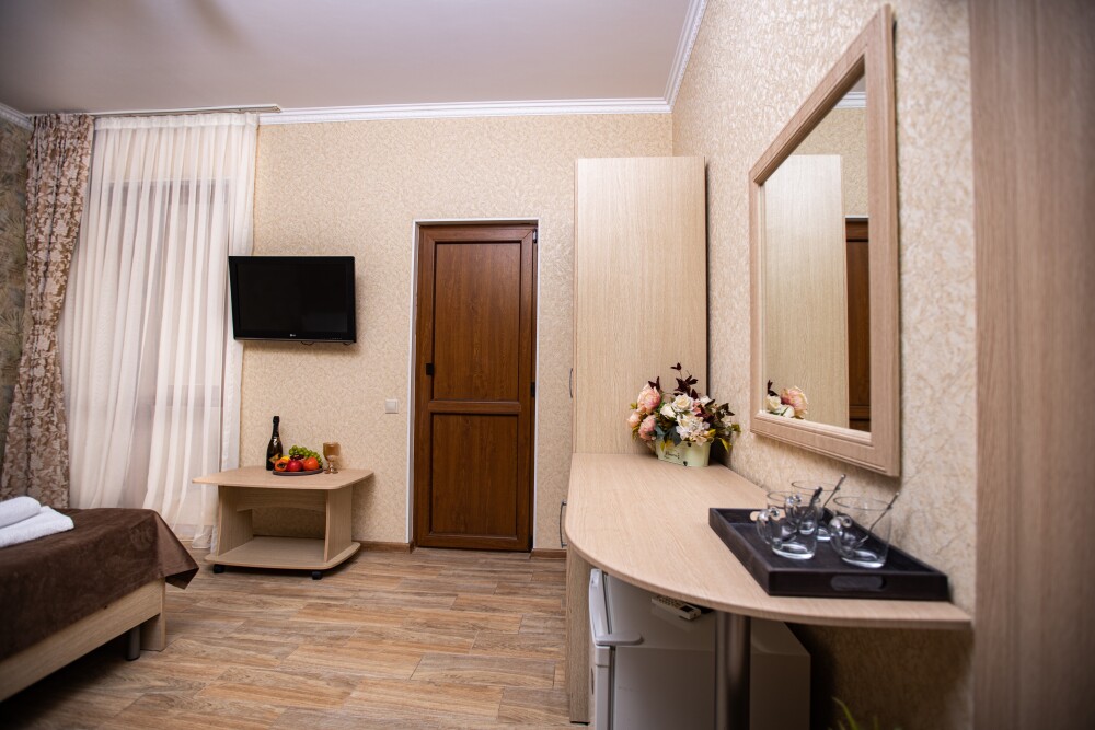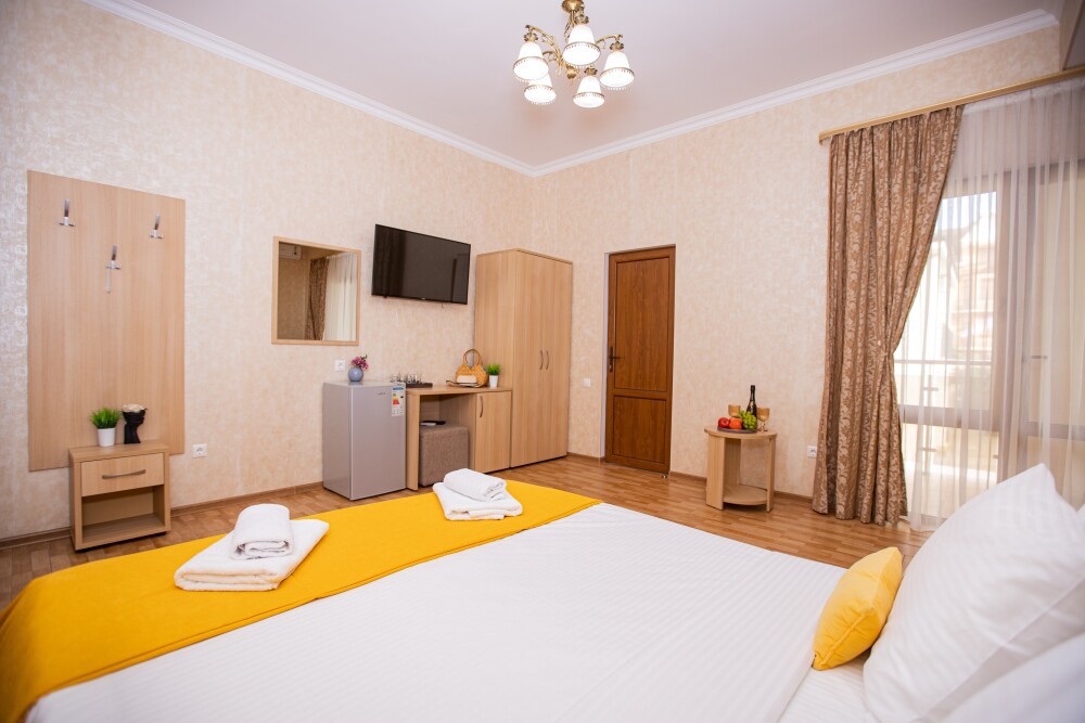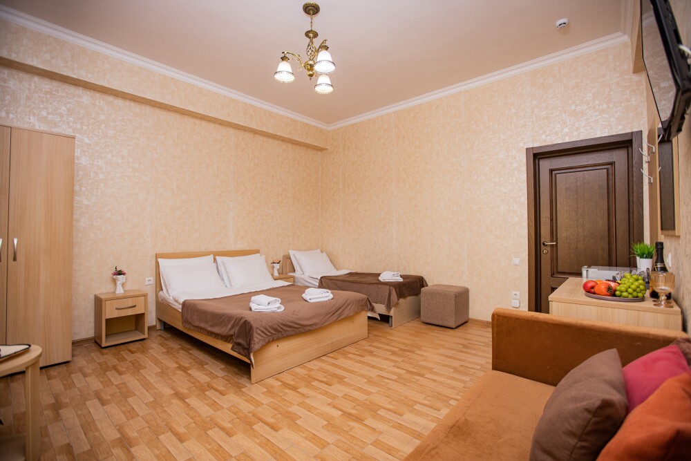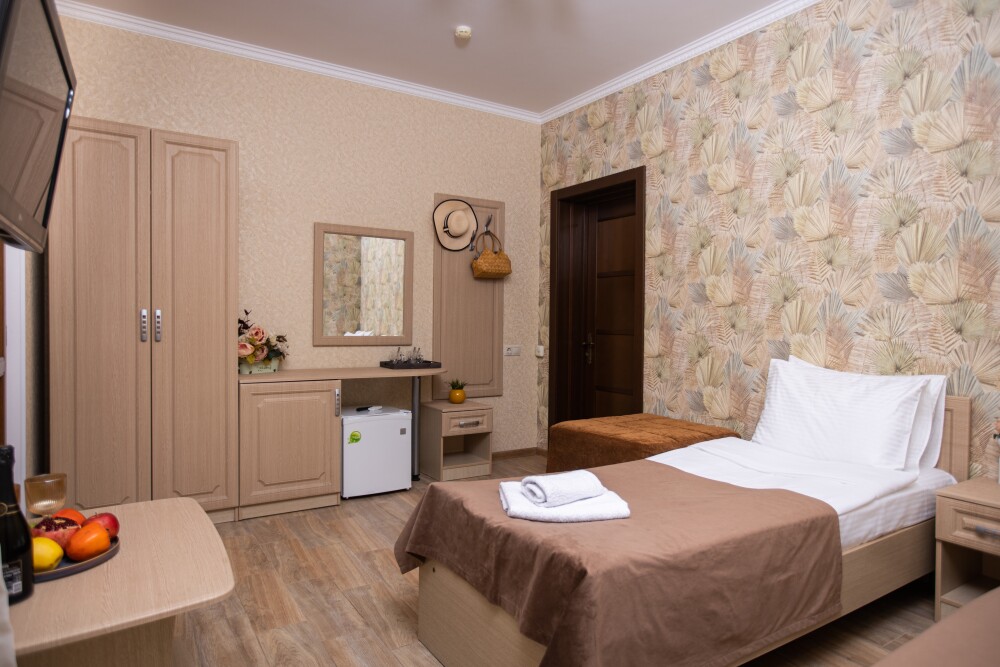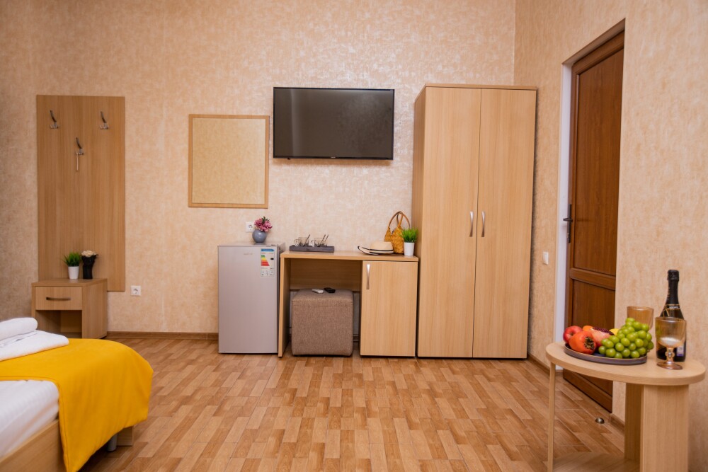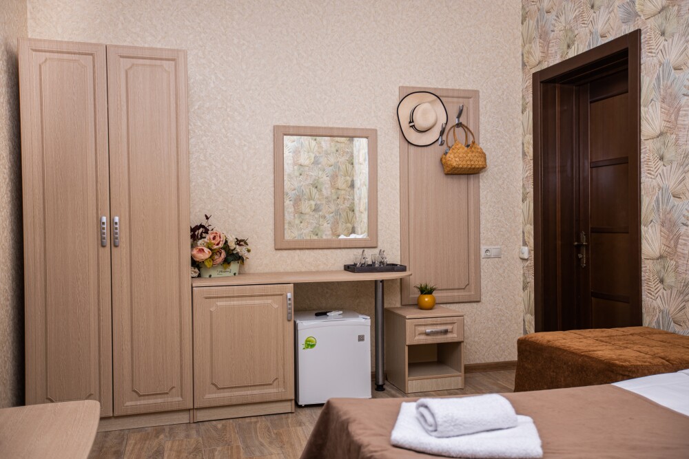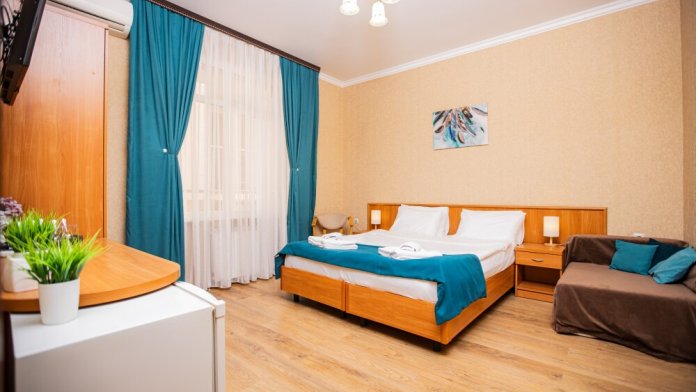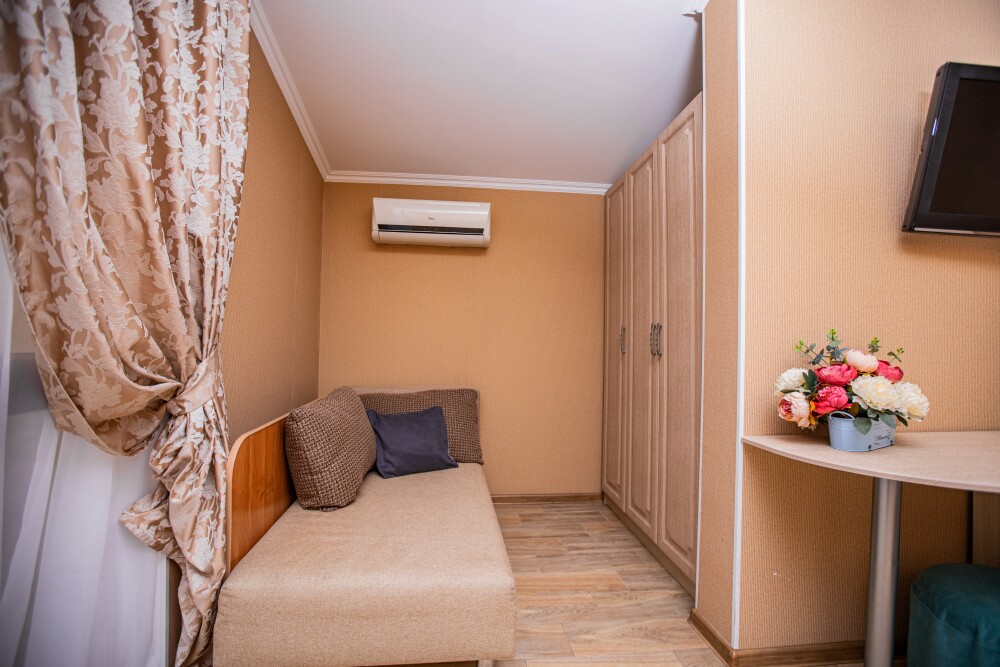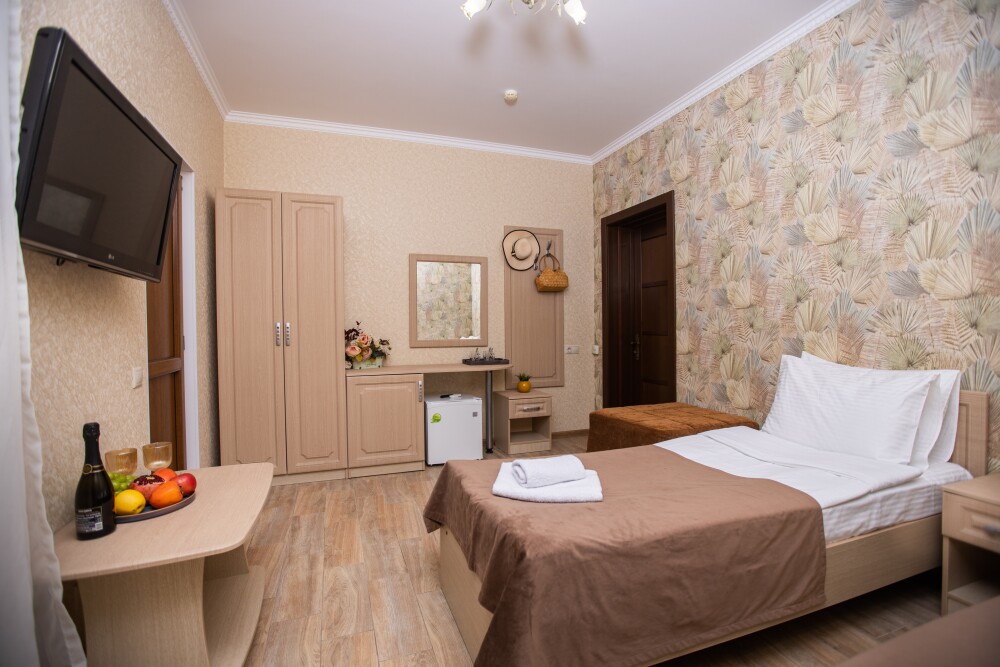 Просторный стандартный номер (20 м2) идеально подходит для размещения четырёх гостей. Продуманная планировка включает: удобную двуспальную кровать для полноценного отдыха, односпальную кровать и мягкую софу — два дополнительных спальных места. В номере есть всё необходимое для комфорта: кондиционер поддерживает оптимальную температуру, телевизор создаёт настроение для вечернего досуга, а собственный балкон приглашает насладиться свежим воздухом. Фен и прочие удобства уже на месте — остаётся только заселяться и чувствовать себя как дома.