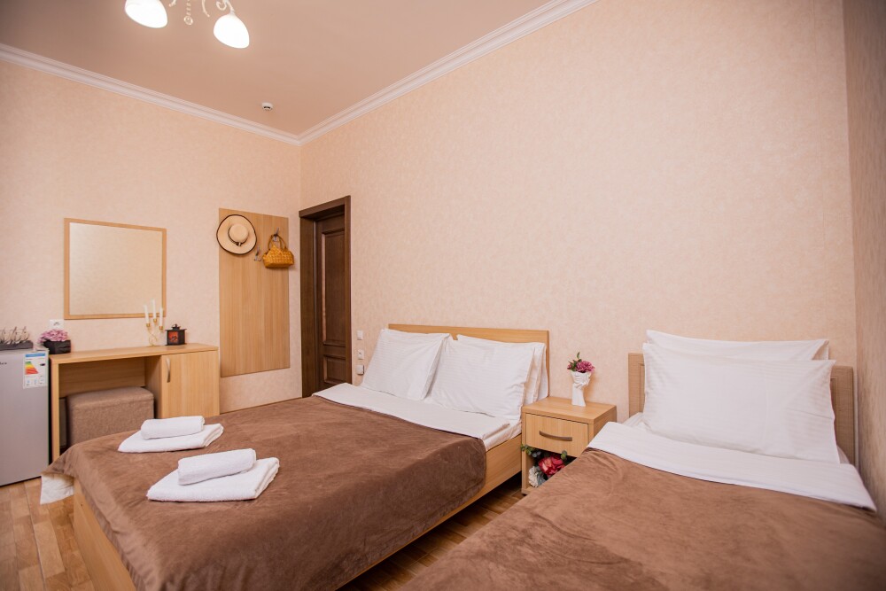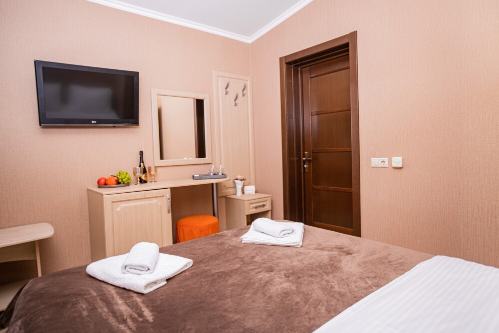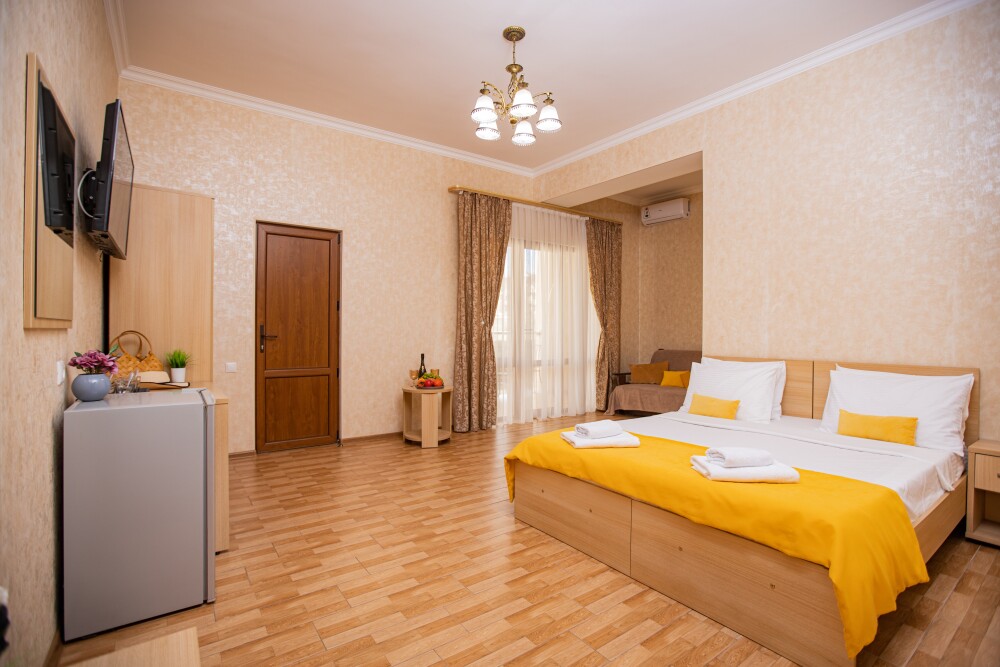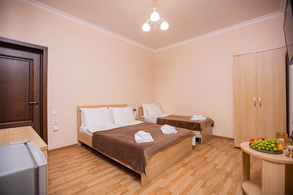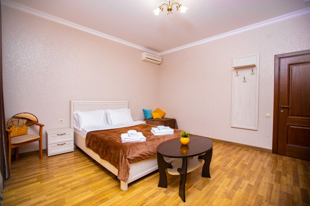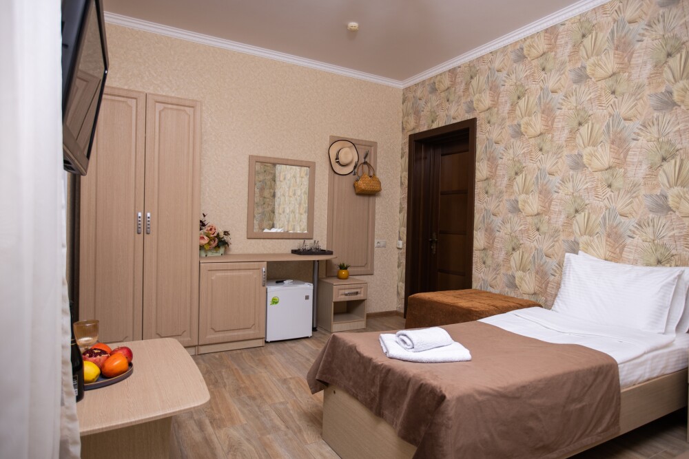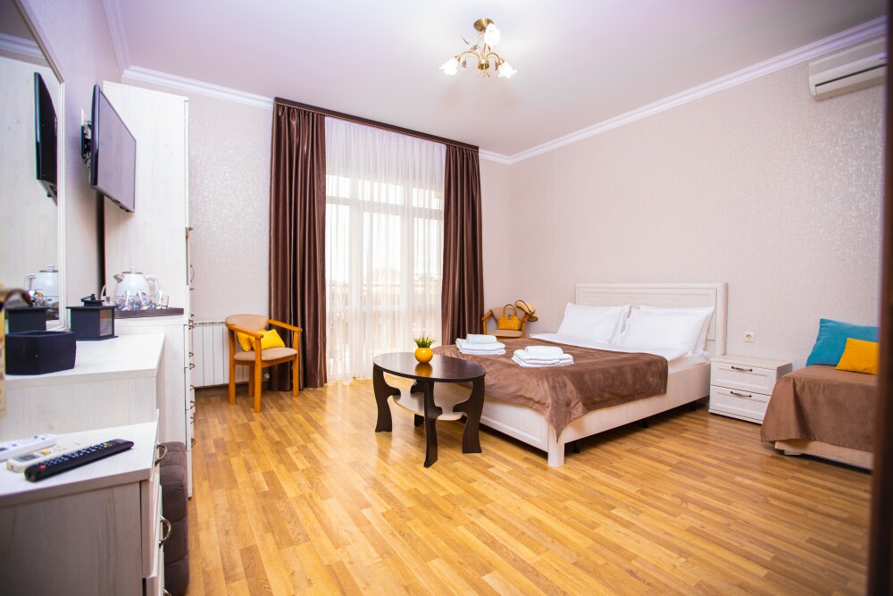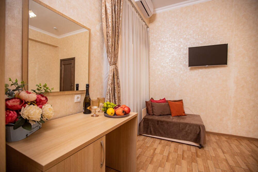 Просторный стандартный номер (20 м2) идеально подходит для размещения четырёх гостей. Продуманная планировка включает: удобную двуспальную кровать для полноценного отдыха, односпальную кровать и мягкую софу — два дополнительных спальных места. В номере есть всё необходимое для комфорта: кондиционер поддерживает оптимальную температуру, телевизор создаёт настроение для вечернего досуга, а собственный балкон приглашает насладиться свежим воздухом. Фен и прочие удобства уже на месте — остаётся только заселяться и чувствовать себя как дома.