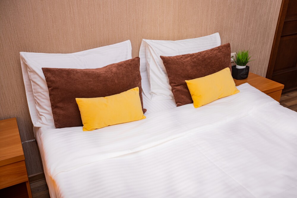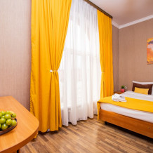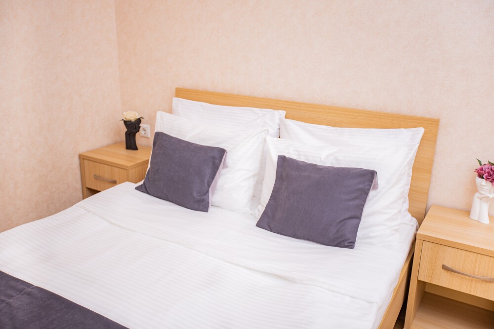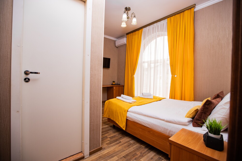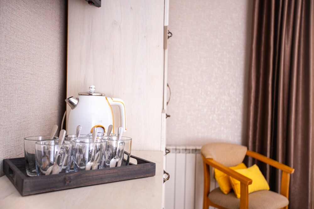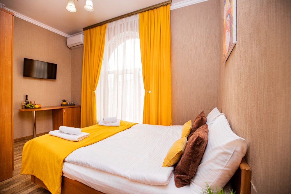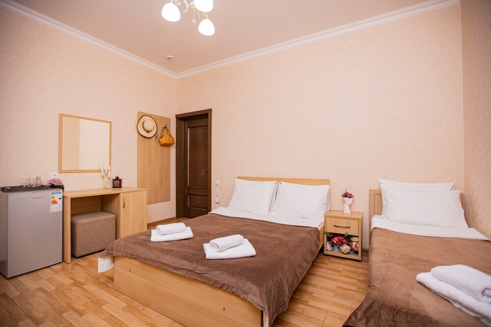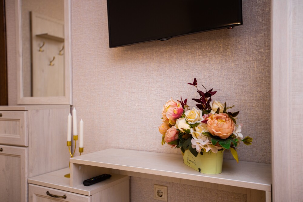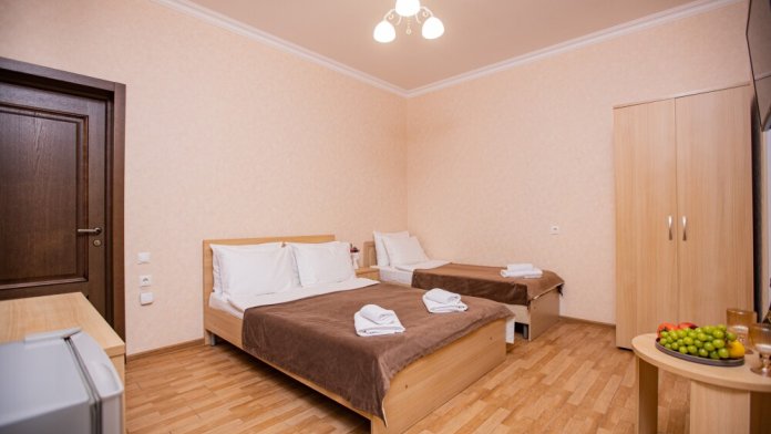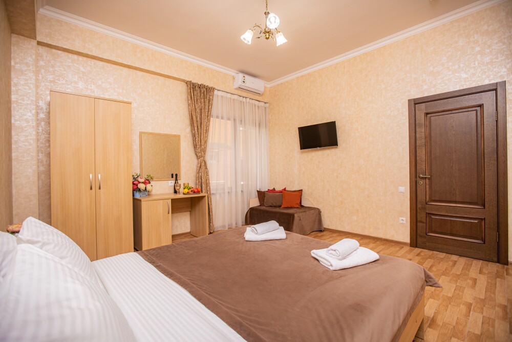 Просторный стандартный номер (20 м2) идеально подходит для размещения четырёх гостей. Продуманная планировка включает: удобную двуспальную кровать для полноценного отдыха, односпальную кровать и мягкую софу — два дополнительных спальных места. В номере есть всё необходимое для комфорта: кондиционер поддерживает оптимальную температуру, телевизор создаёт настроение для вечернего досуга, а собственный балкон приглашает насладиться свежим воздухом. Фен и прочие удобства уже на месте — остаётся только заселяться и чувствовать себя как дома.