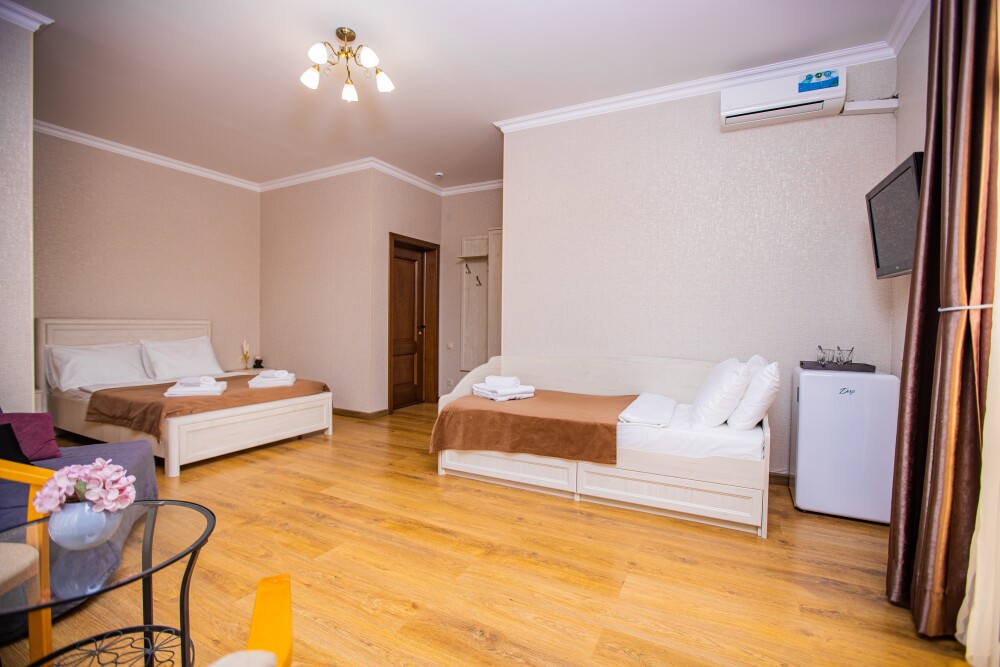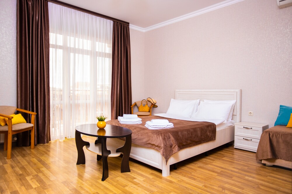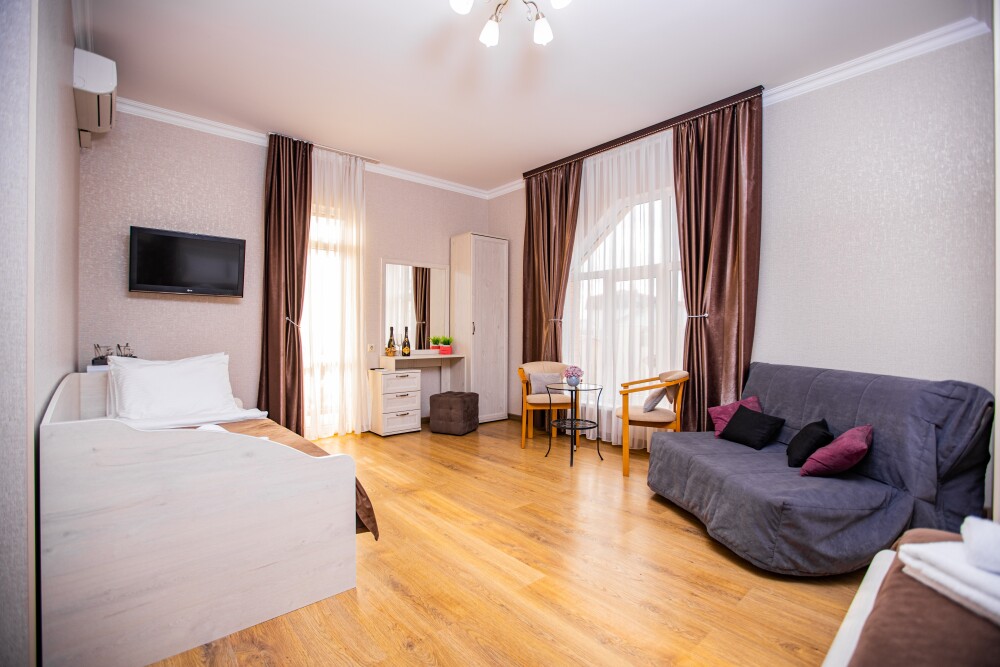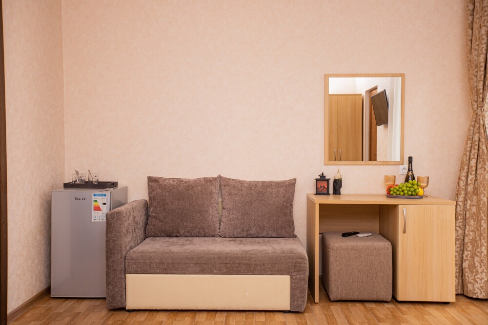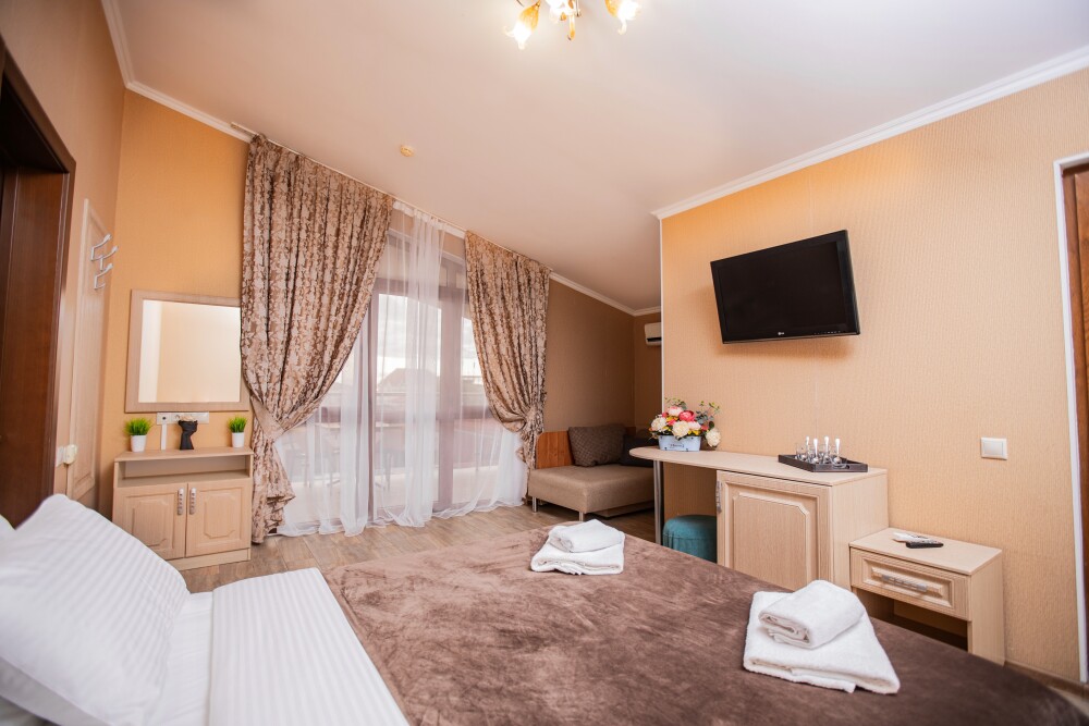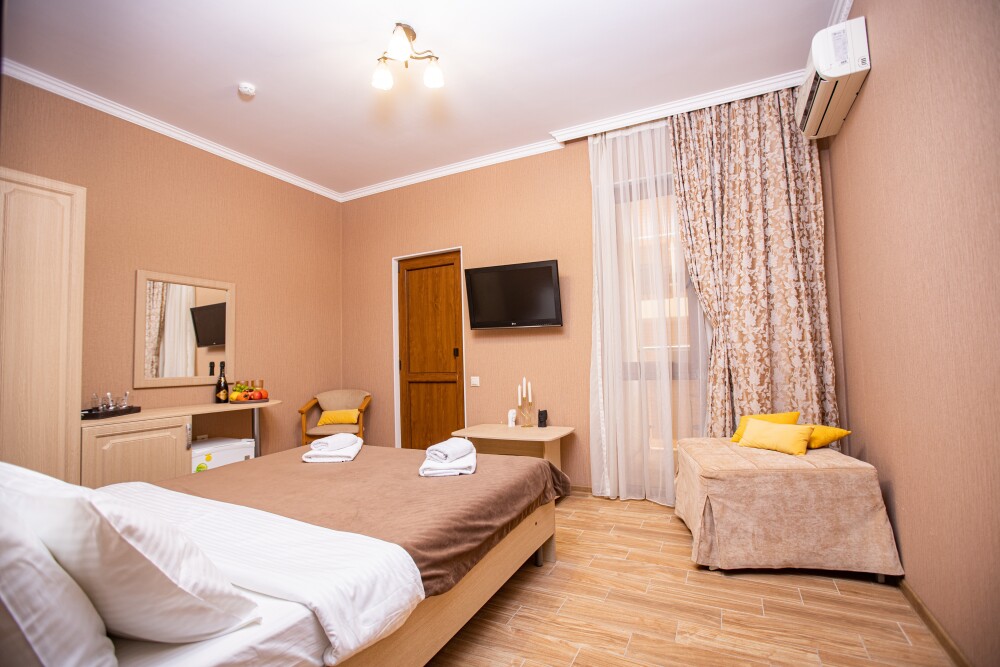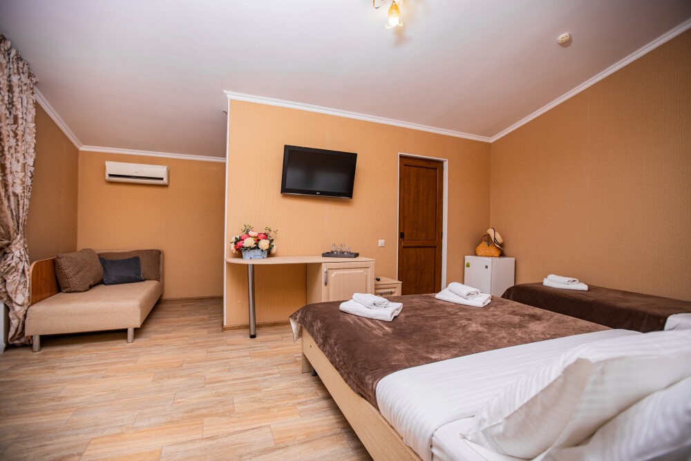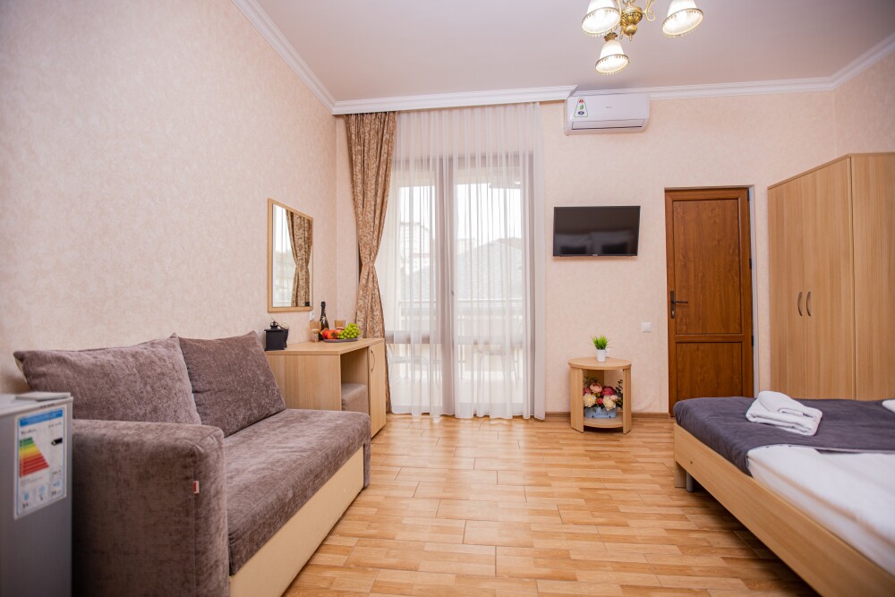 Номер площадью 20м2 - создан для комфортного размещения компании или семьи. В нём гармонично сочетаются двуспальная кровать для полноценного отдыха, удобный диван для дневных посиделок и мягкая софа - дополнительное спальное место. Кондиционер обеспечит приятную прохладу, телевизор подарит часы развлечений, а собственный балкон станет любимым местом для утреннего кофе или вечерних созерцаний. Всё необходимое, включая фен, уже подготовлено - Вам остаётся только наслаждаться отдыхом.