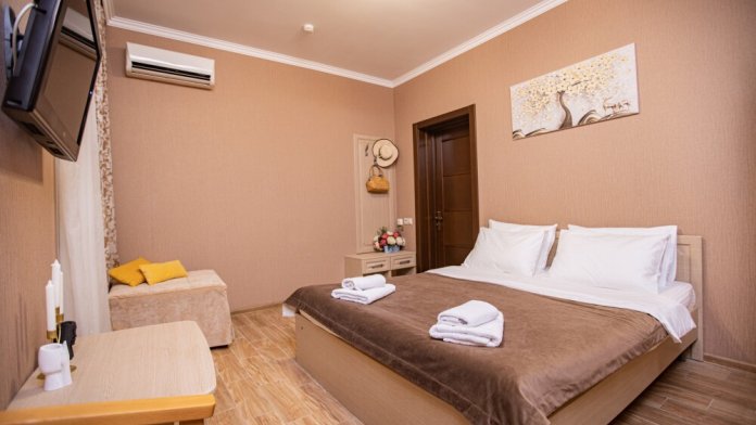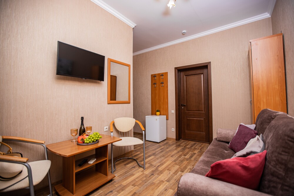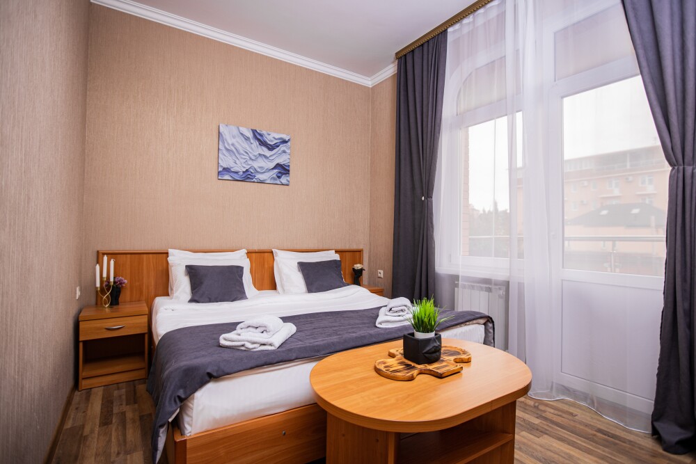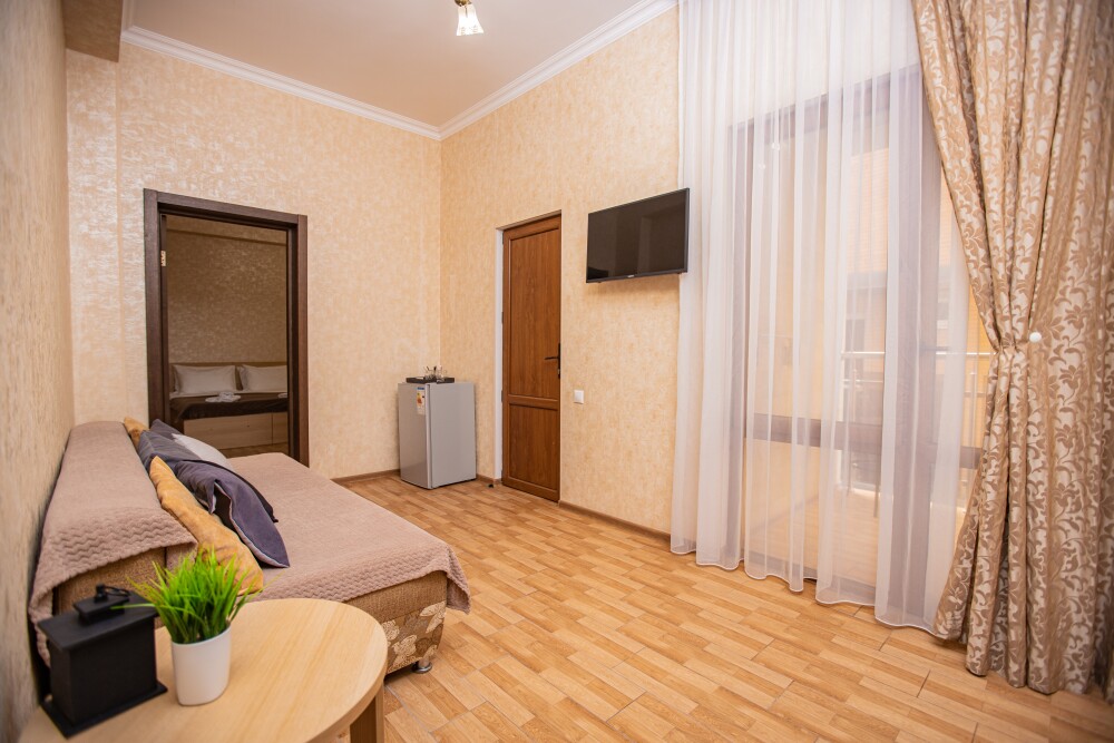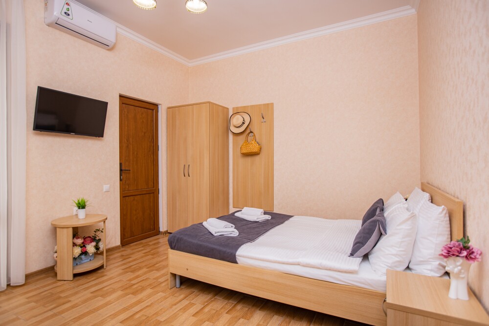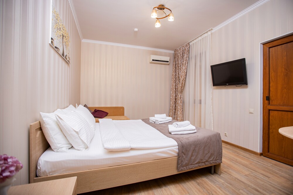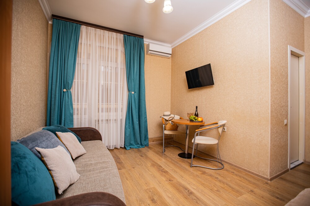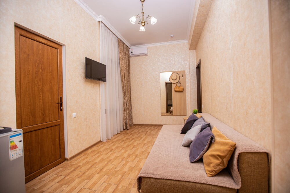 Номер площадью 20м2 - создан для комфортного размещения компании или семьи. В нём гармонично сочетаются двуспальная кровать для полноценного отдыха, удобный диван для дневных посиделок и мягкая софа - дополнительное спальное место. Кондиционер обеспечит приятную прохладу, телевизор подарит часы развлечений, а собственный балкон станет любимым местом для утреннего кофе или вечерних созерцаний. Всё необходимое, включая фен, уже подготовлено - Вам остаётся только наслаждаться отдыхом.