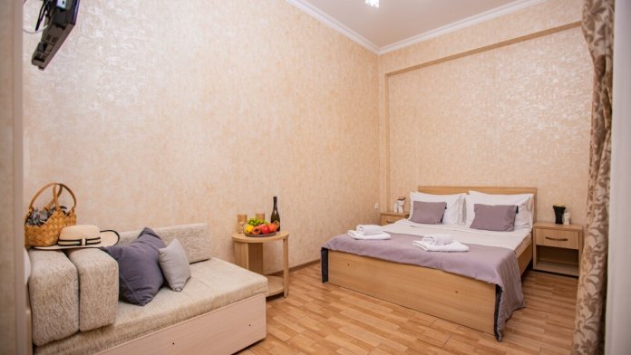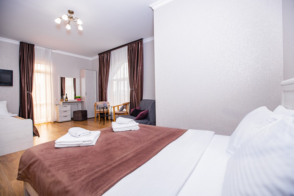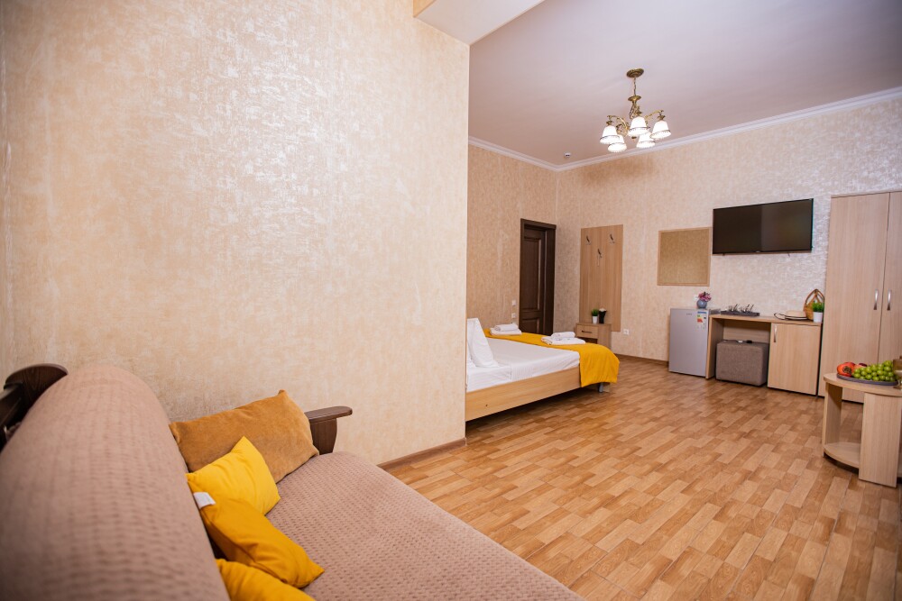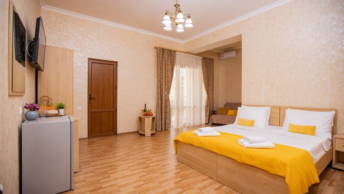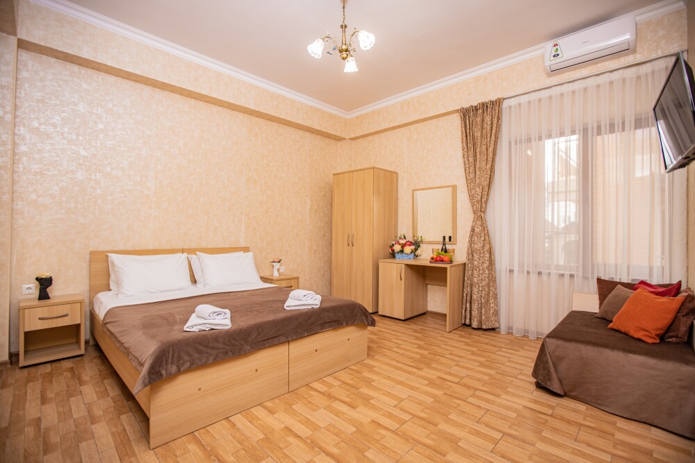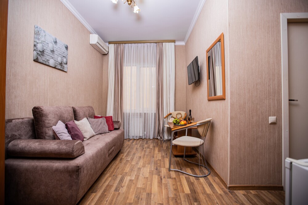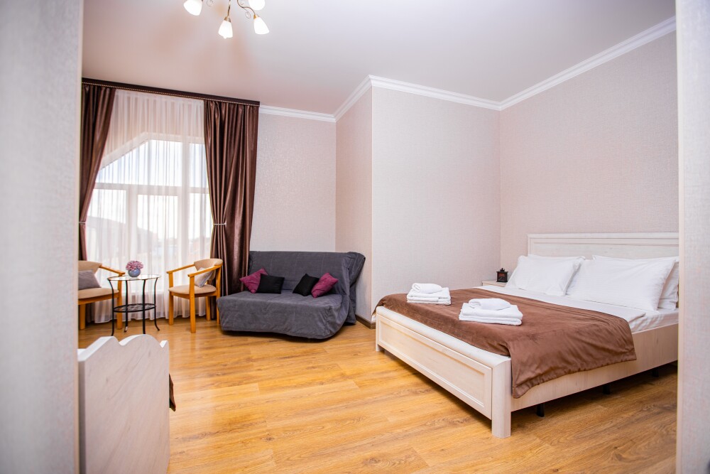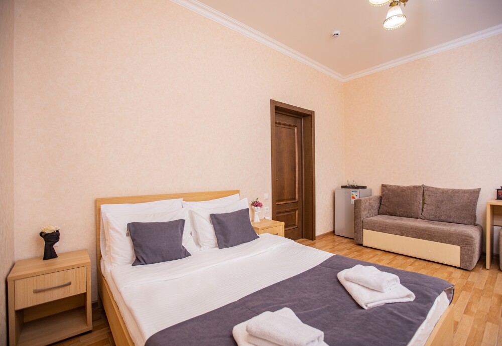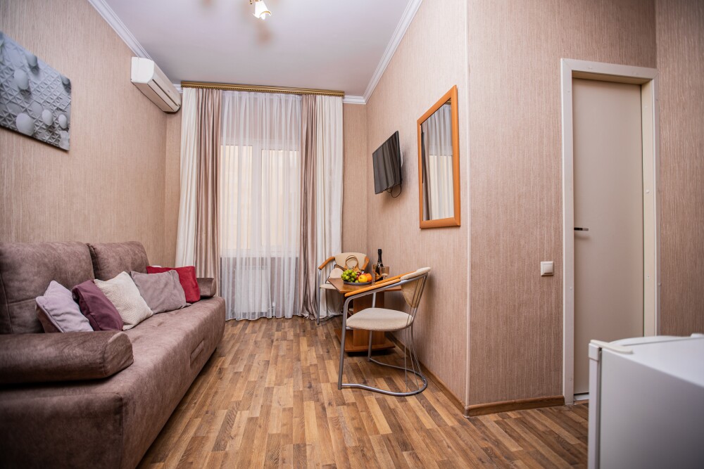 Номер площадью 20м2 - создан для комфортного размещения компании или семьи. В нём гармонично сочетаются двуспальная кровать для полноценного отдыха, удобный диван для дневных посиделок и мягкая софа - дополнительное спальное место. Кондиционер обеспечит приятную прохладу, телевизор подарит часы развлечений, а собственный балкон станет любимым местом для утреннего кофе или вечерних созерцаний. Всё необходимое, включая фен, уже подготовлено - Вам остаётся только наслаждаться отдыхом.