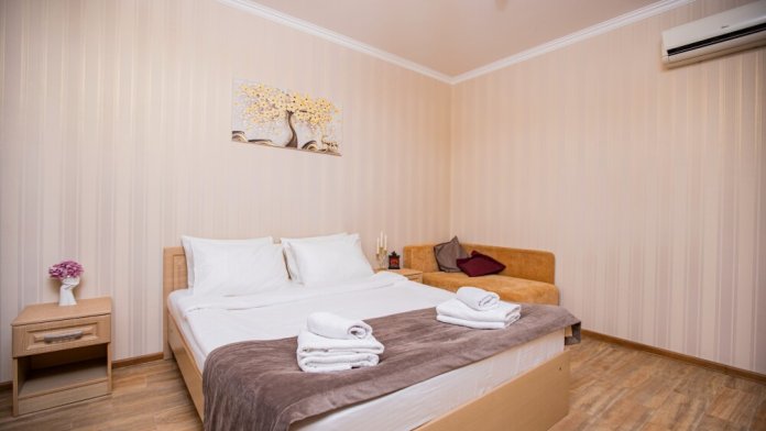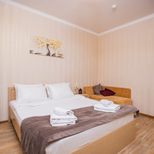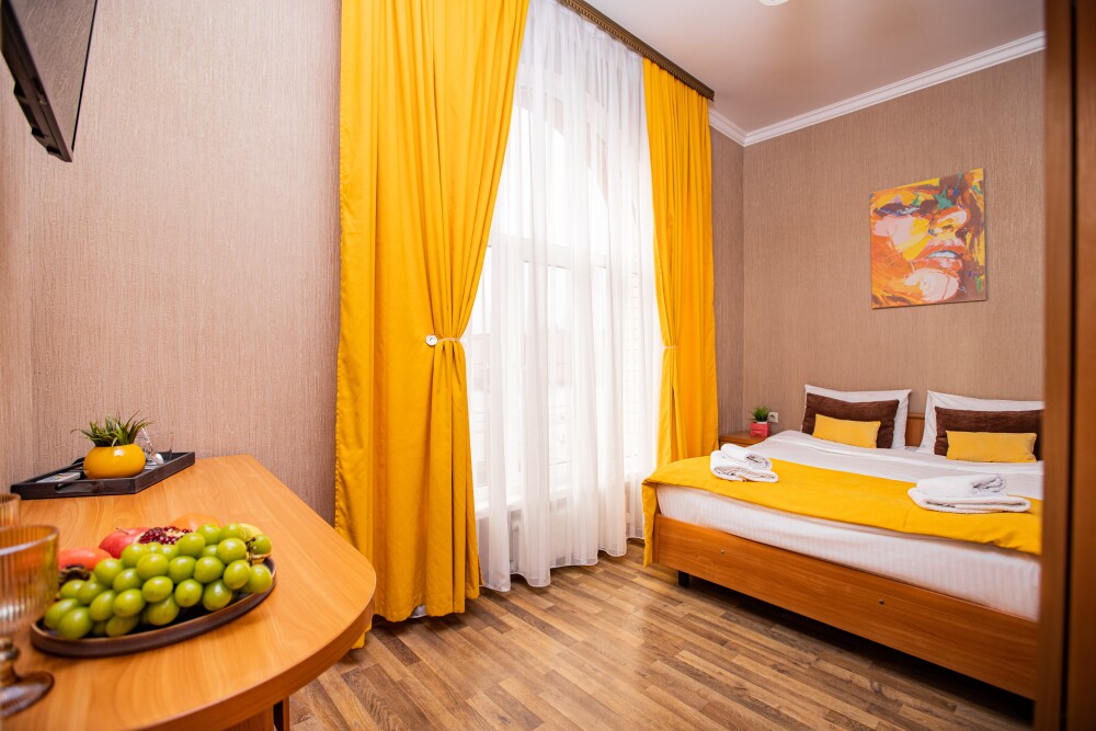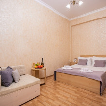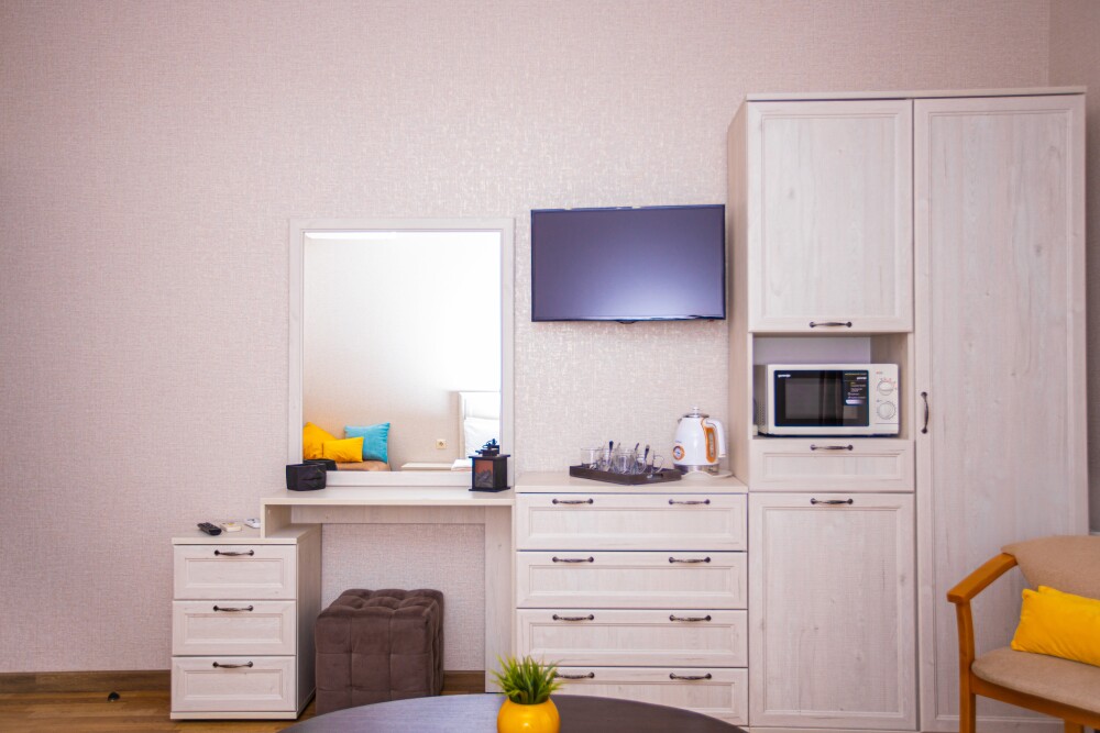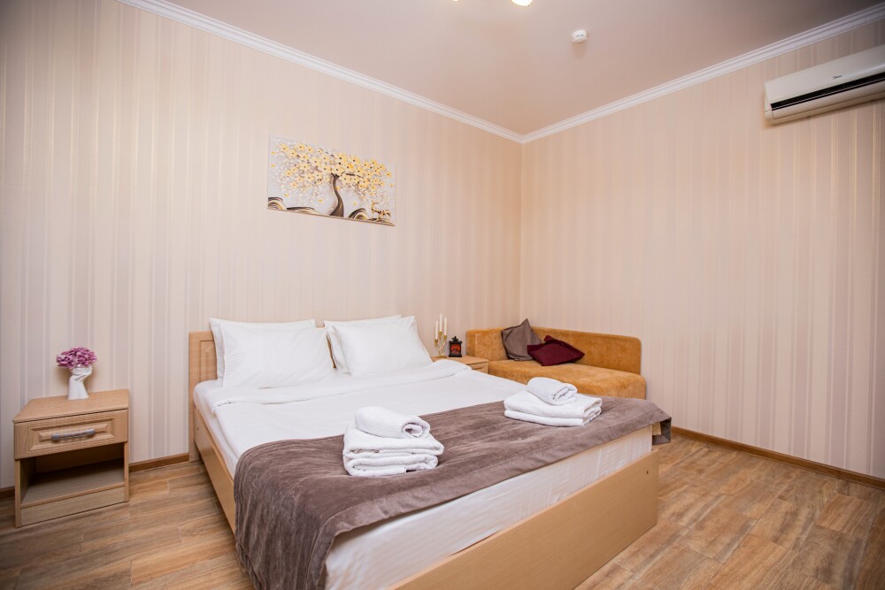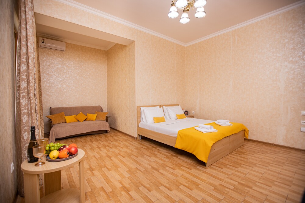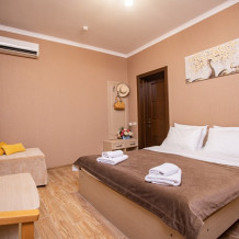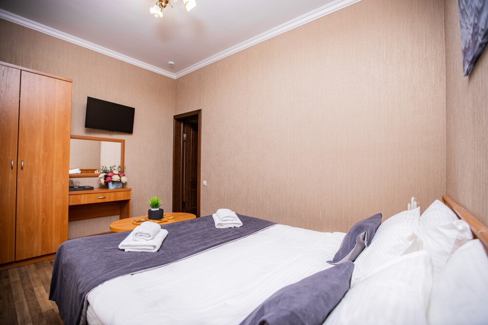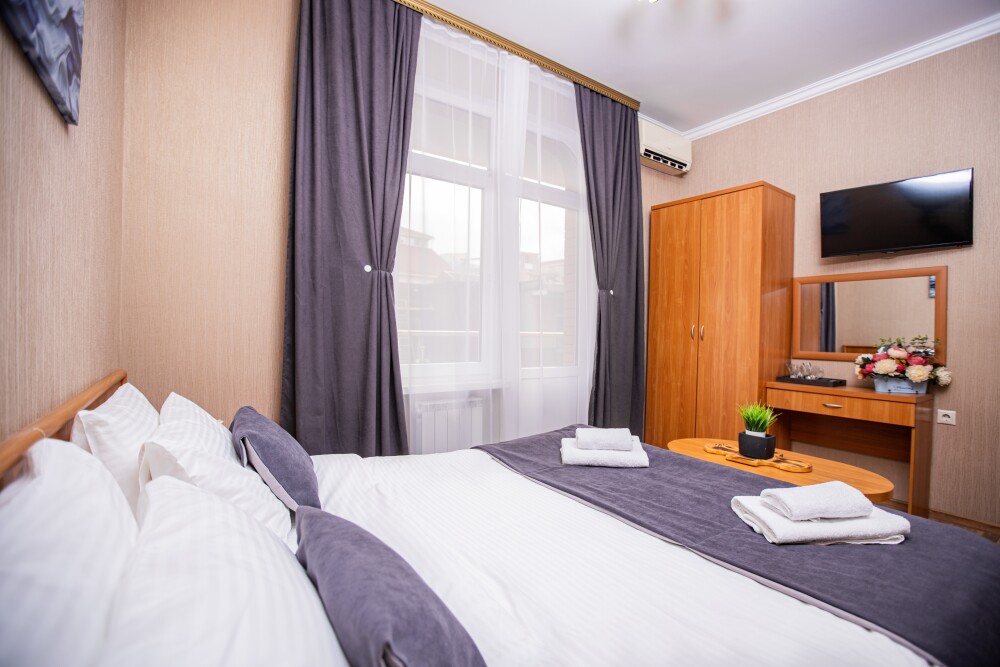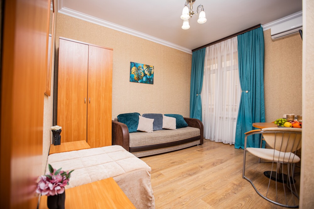 Номер площадью 20м2 - создан для комфортного размещения компании или семьи. В нём гармонично сочетаются двуспальная кровать для полноценного отдыха, удобный диван для дневных посиделок и мягкая софа - дополнительное спальное место. Кондиционер обеспечит приятную прохладу, телевизор подарит часы развлечений, а собственный балкон станет любимым местом для утреннего кофе или вечерних созерцаний. Всё необходимое, включая фен, уже подготовлено - Вам остаётся только наслаждаться отдыхом.
