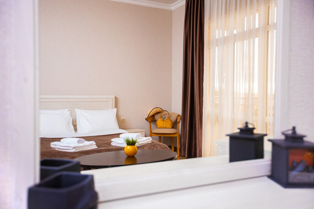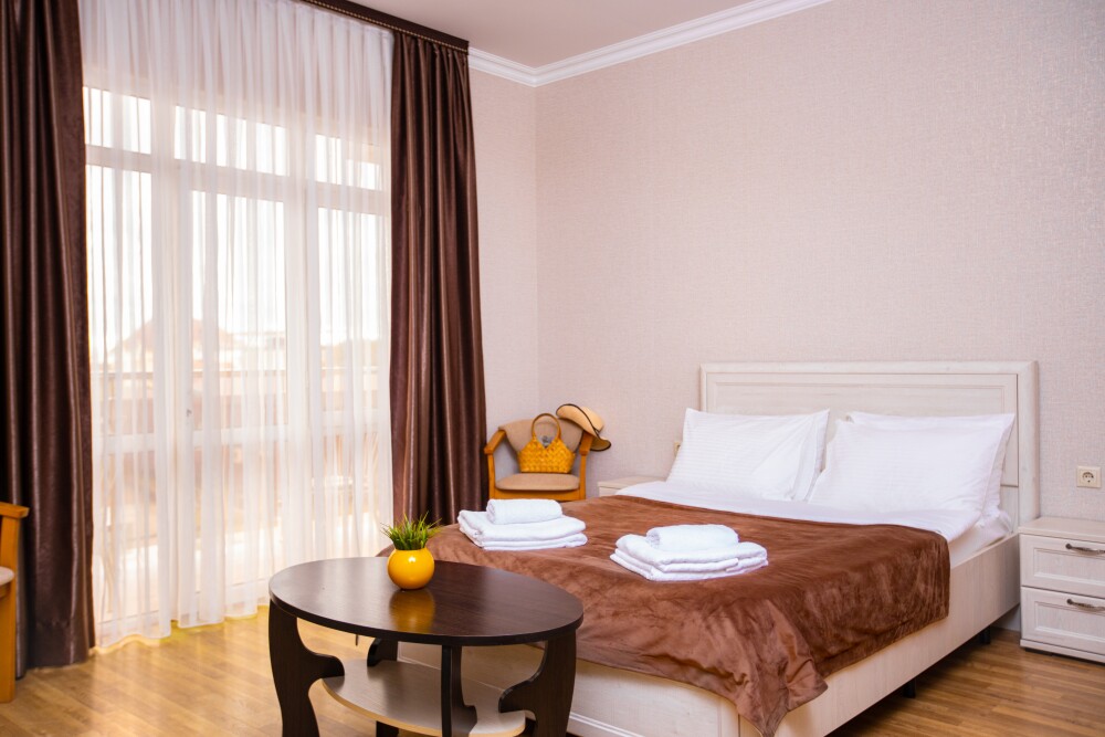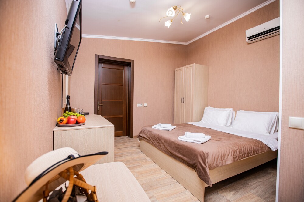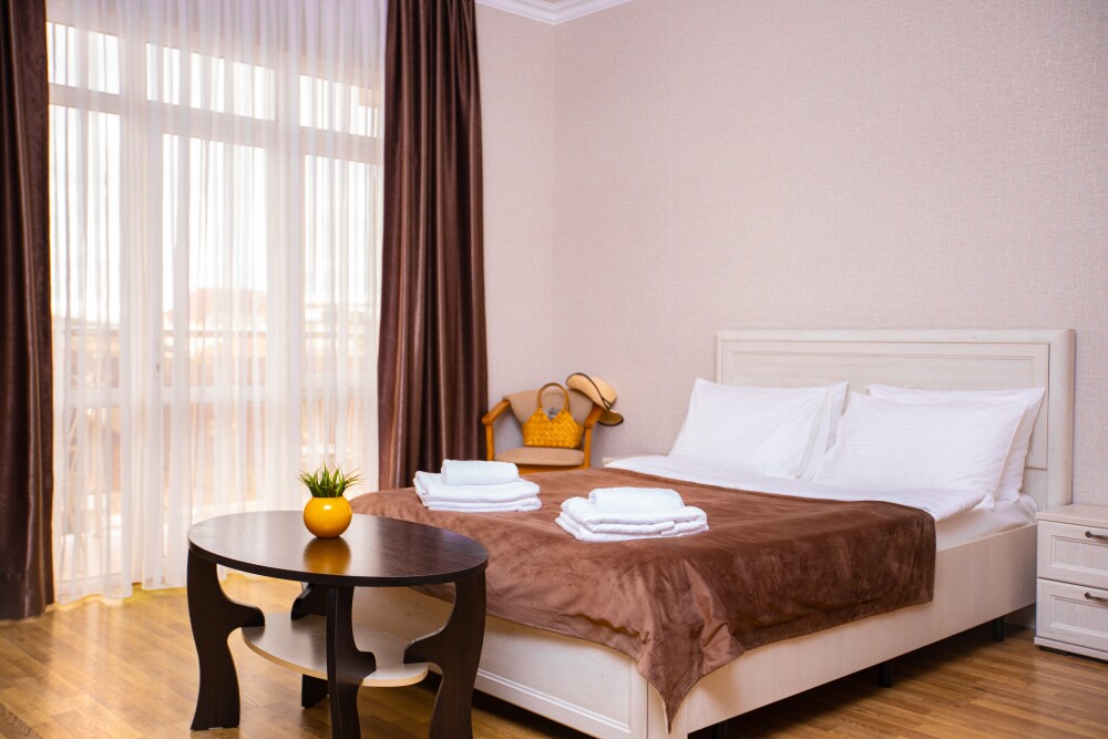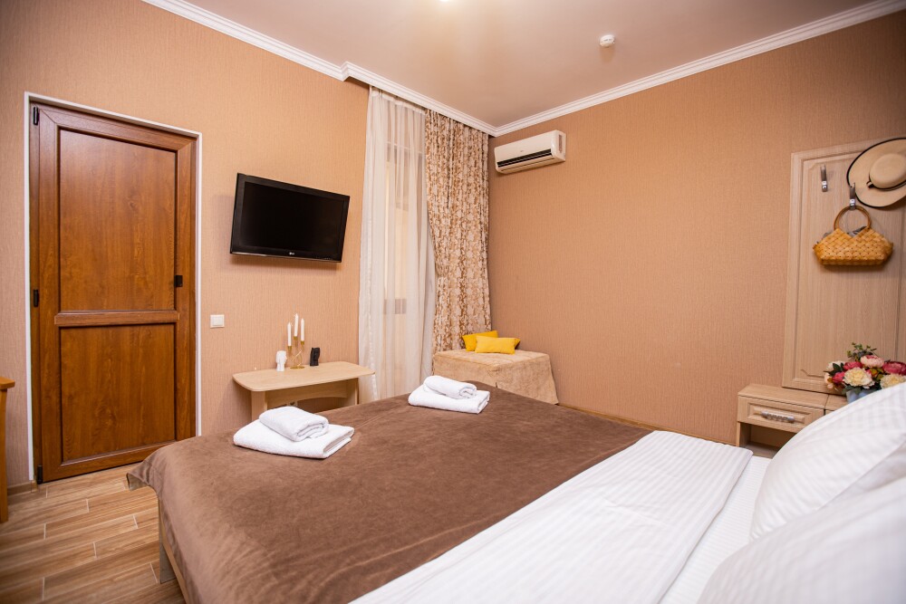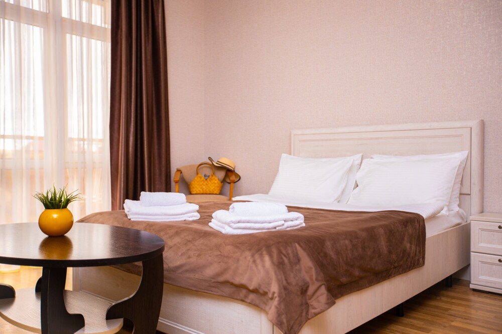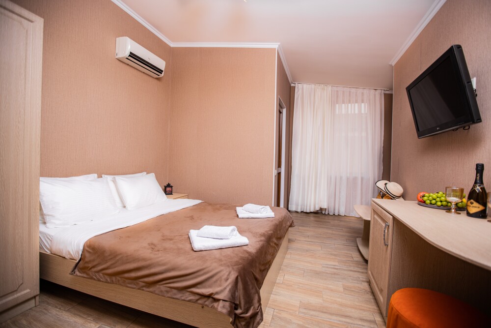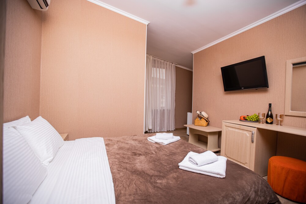 Номер категории «Комфорт» (25 м2) создан для безмятежного отдыха двоих. Центром пространства стала просторная двуспальная кровать — идеальное место для крепкого сна. Кондиционер поддерживает приятную прохладу, телевизор дарит вечерние развлечения, а фен и прочие мелочи уже ждут вас. Особая гордость номера — просторная терраса с панорамным видом на море: здесь можно встречать рассветы, провожать закаты или просто наслаждаться морским бризом в любое время суток.