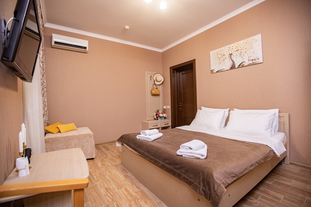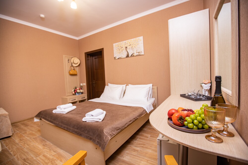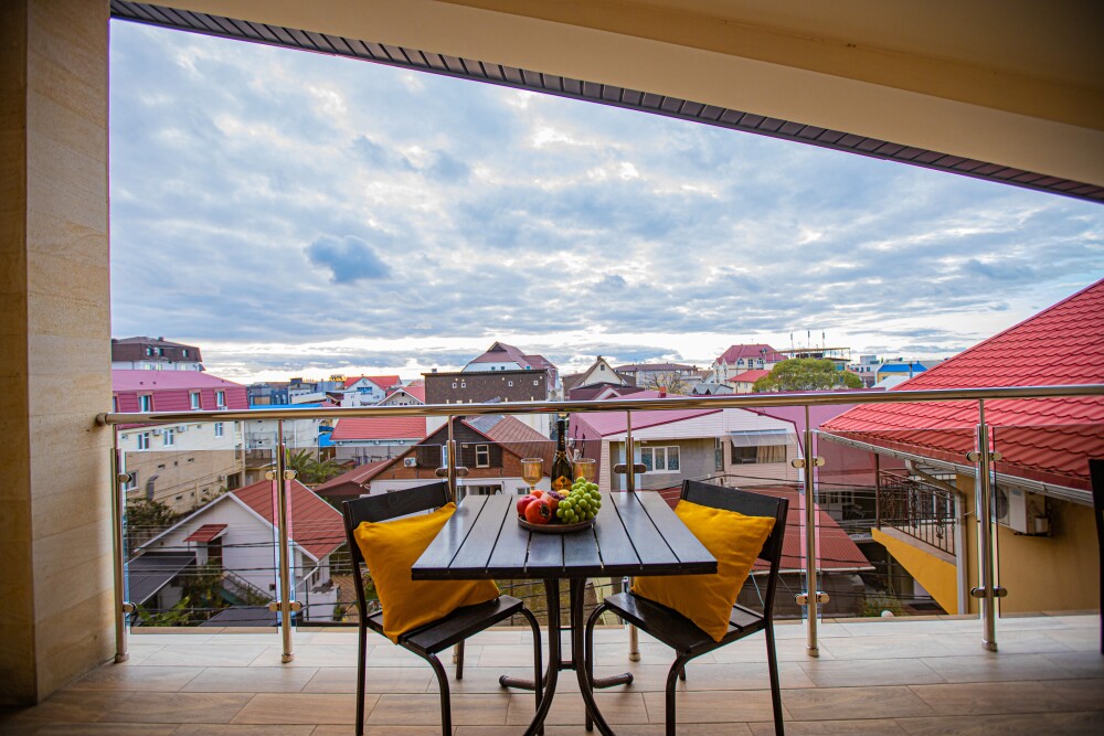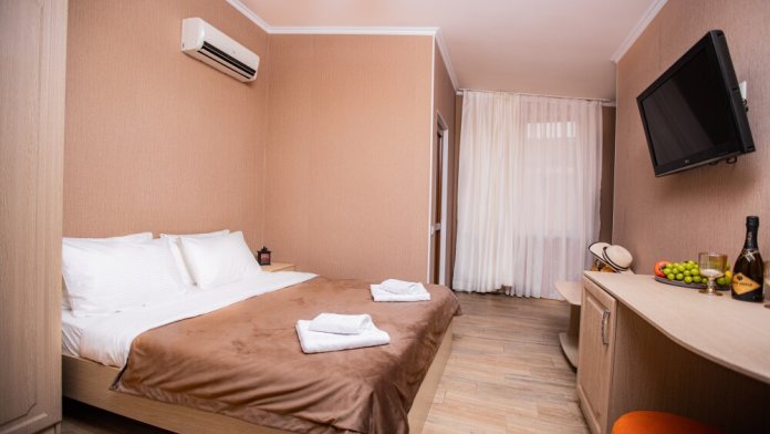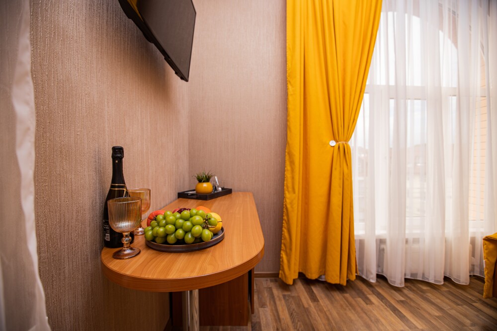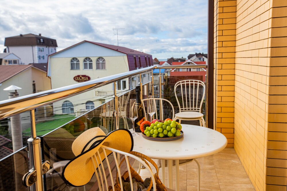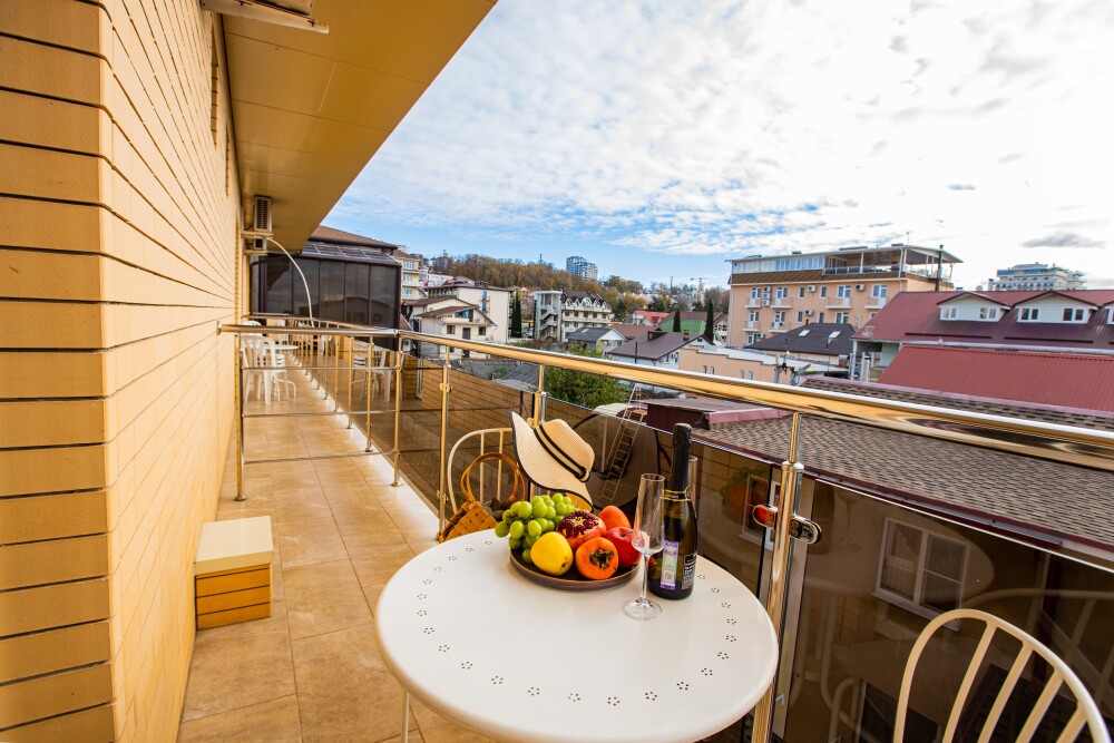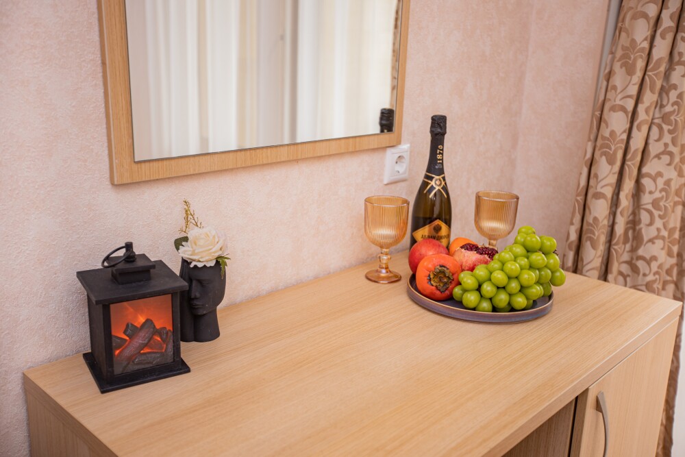 Номер категории «Комфорт» (25 м2) создан для безмятежного отдыха двоих. Центром пространства стала просторная двуспальная кровать — идеальное место для крепкого сна. Кондиционер поддерживает приятную прохладу, телевизор дарит вечерние развлечения, а фен и прочие мелочи уже ждут вас. Особая гордость номера — просторная терраса с панорамным видом на море: здесь можно встречать рассветы, провожать закаты или просто наслаждаться морским бризом в любое время суток.