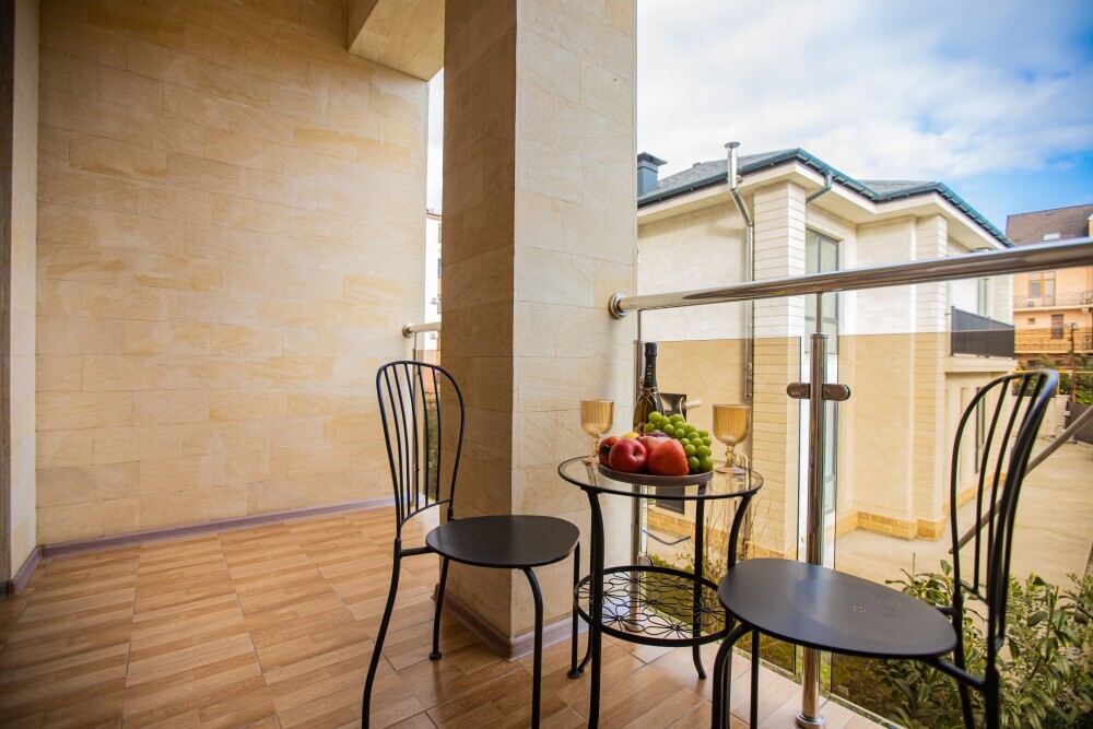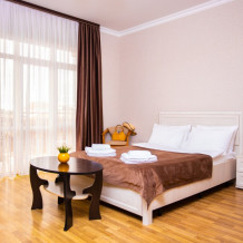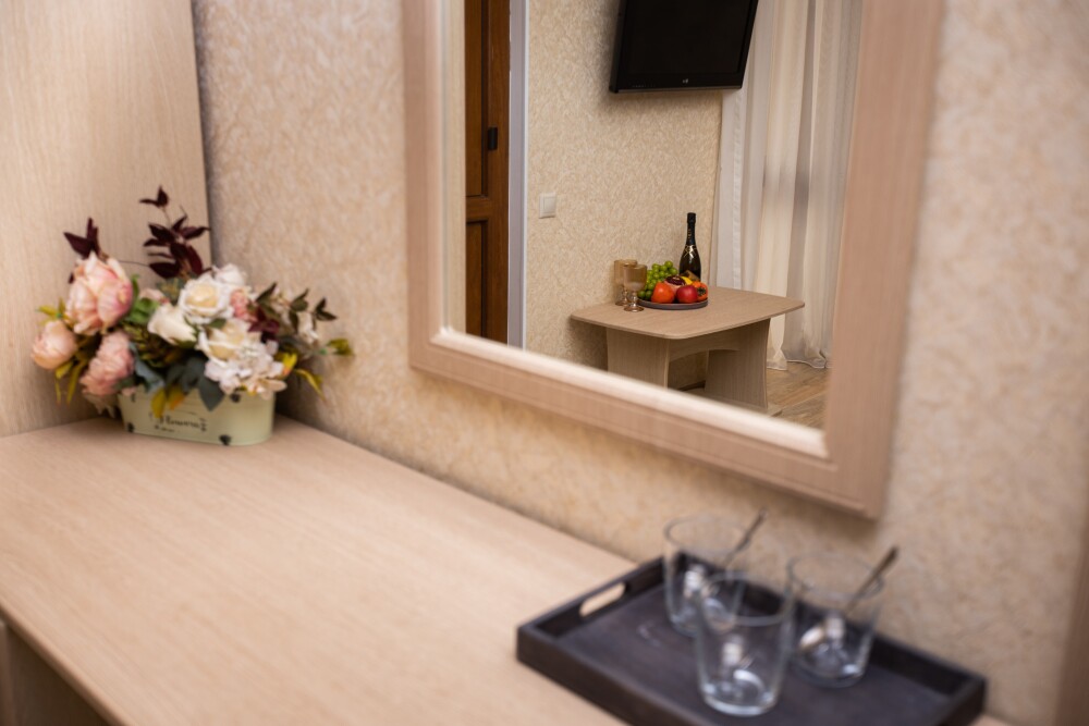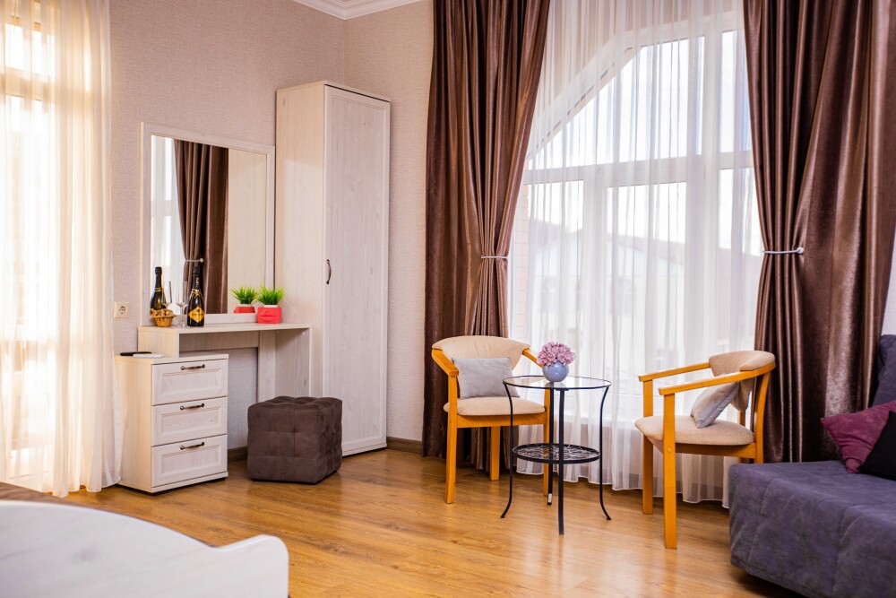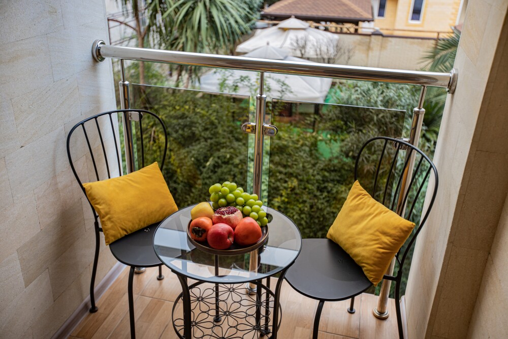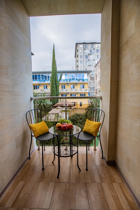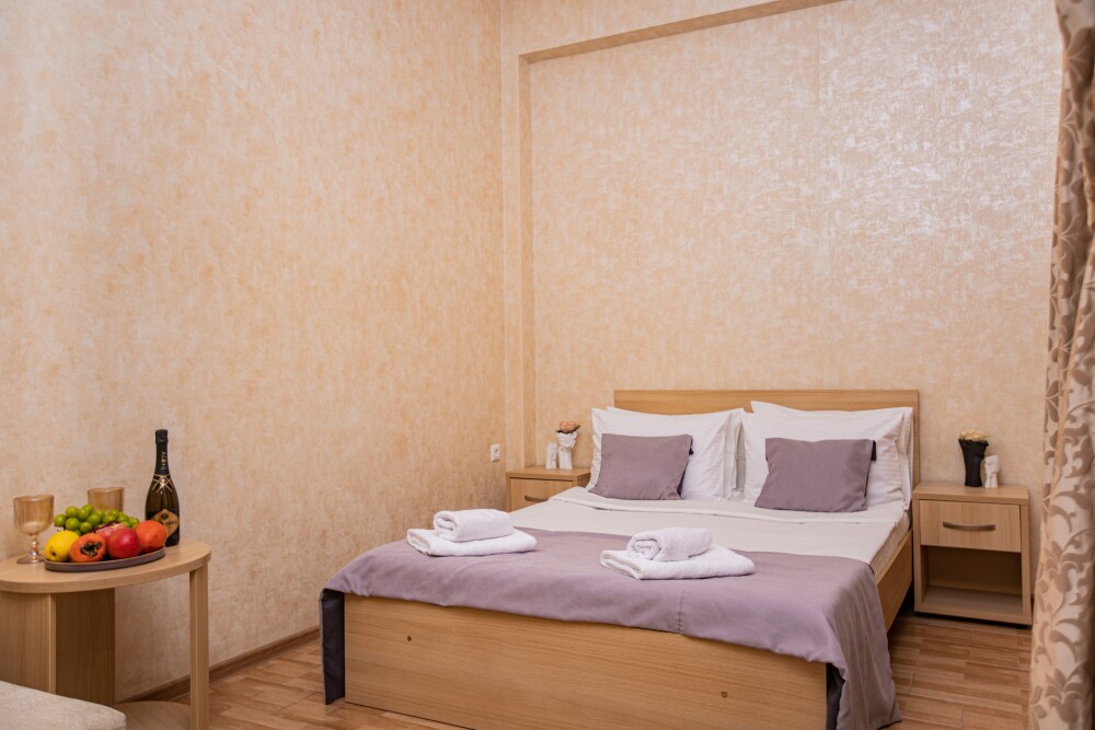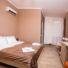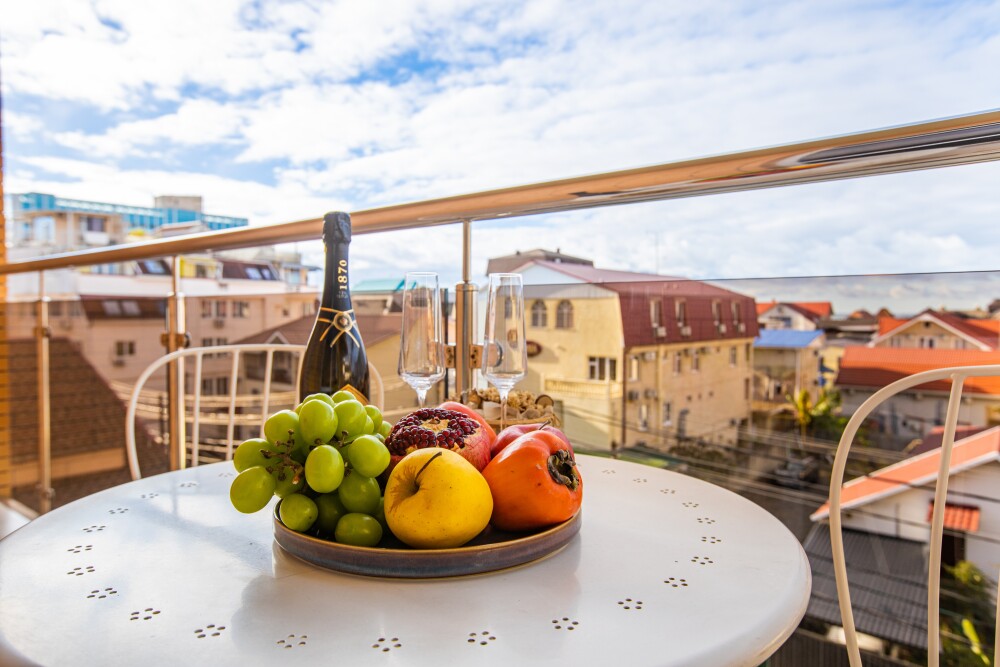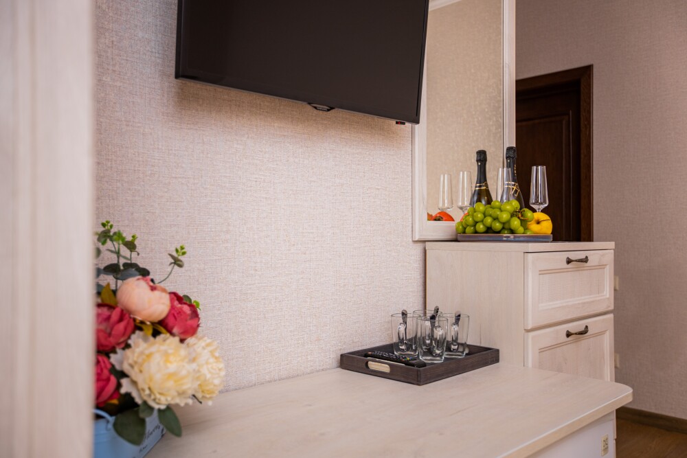 Номер категории «Комфорт» (25 м2) создан для безмятежного отдыха двоих. Центром пространства стала просторная двуспальная кровать — идеальное место для крепкого сна. Кондиционер поддерживает приятную прохладу, телевизор дарит вечерние развлечения, а фен и прочие мелочи уже ждут вас. Особая гордость номера — просторная терраса с панорамным видом на море: здесь можно встречать рассветы, провожать закаты или просто наслаждаться морским бризом в любое время суток.