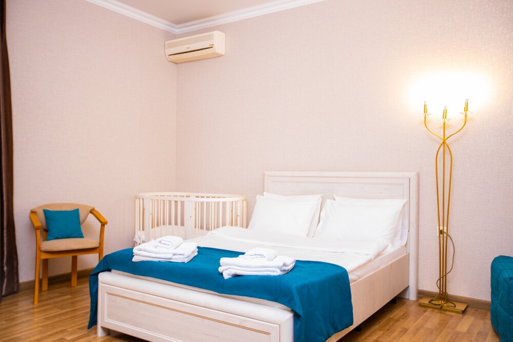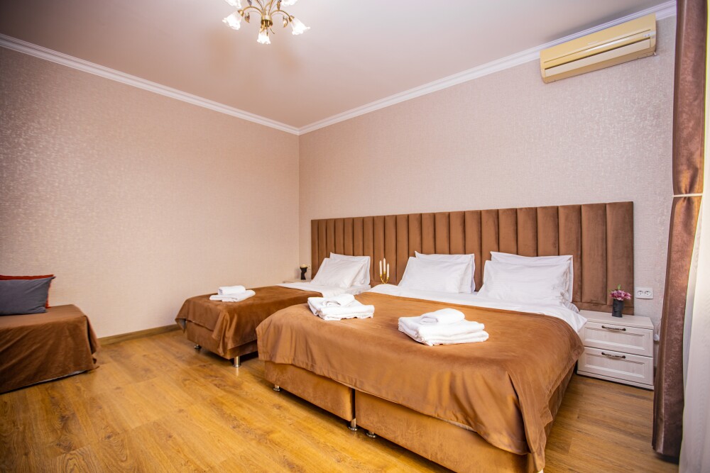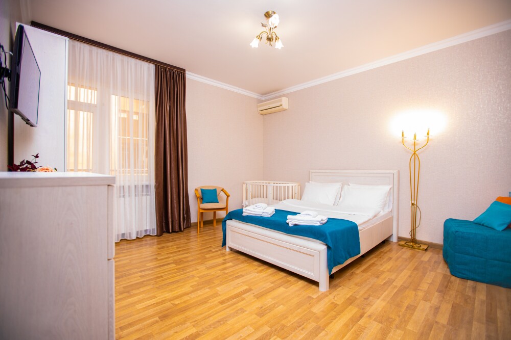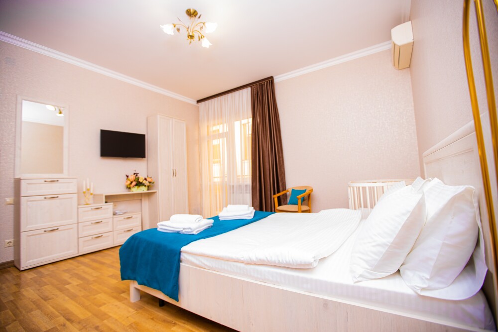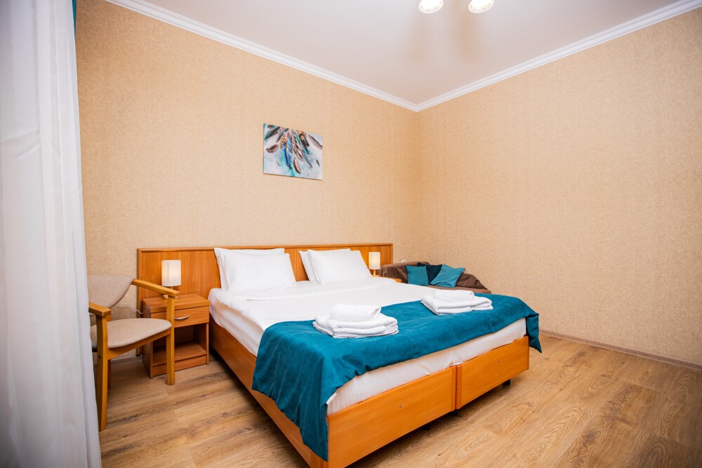 Просторный двухкомнатный номер создан для комфортного отдыха компании до 5 человек. В первой комнате - двуспальная кровать с ортопедическим матрасом, во второй - односпальная кровать и мягкий диван‑софа, легко трансформируемые в 2 дополнительных спальных места. Кондиционер поддерживает идеальную температуру, телевизор дарит часы развлечений, а балкон становится любимым местом для утреннего кофе или вечерних бесед. Всё необходимое - от фена до мелочей - уже подготовлено, чтобы Вы чувствовали себя как дома.