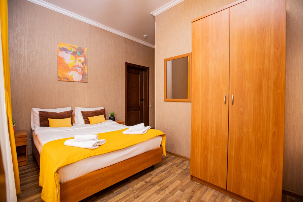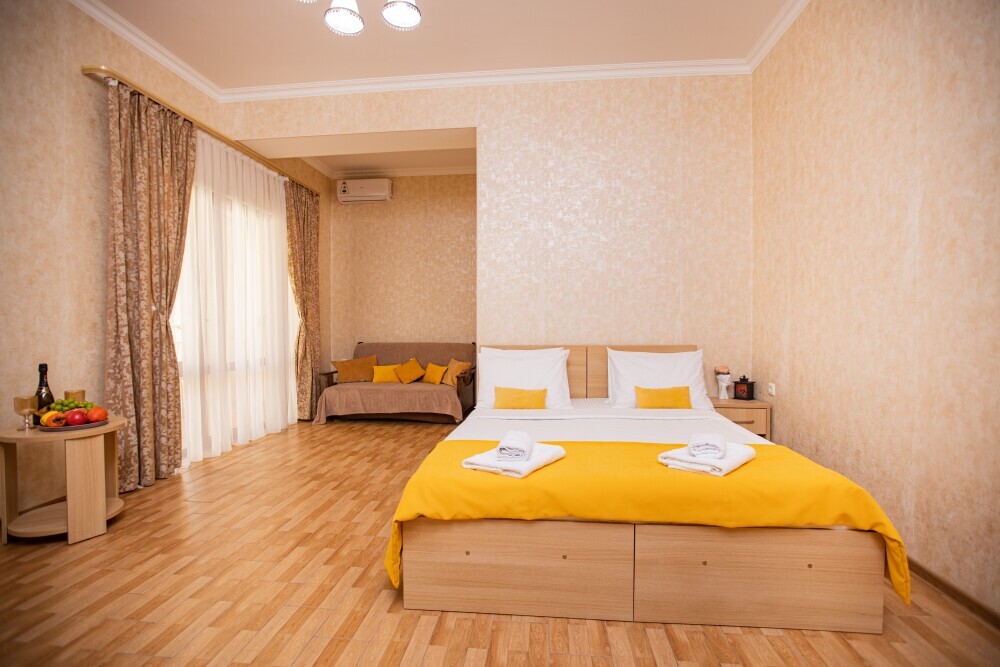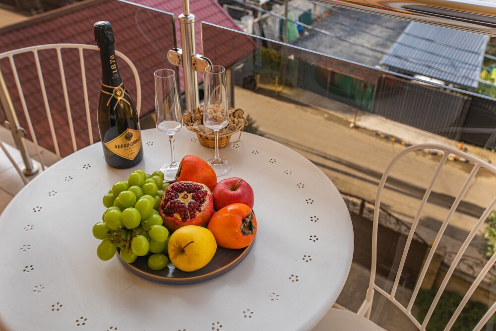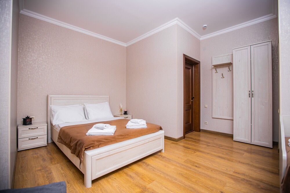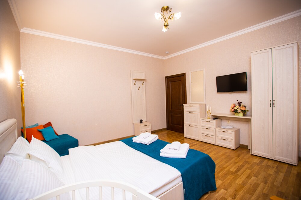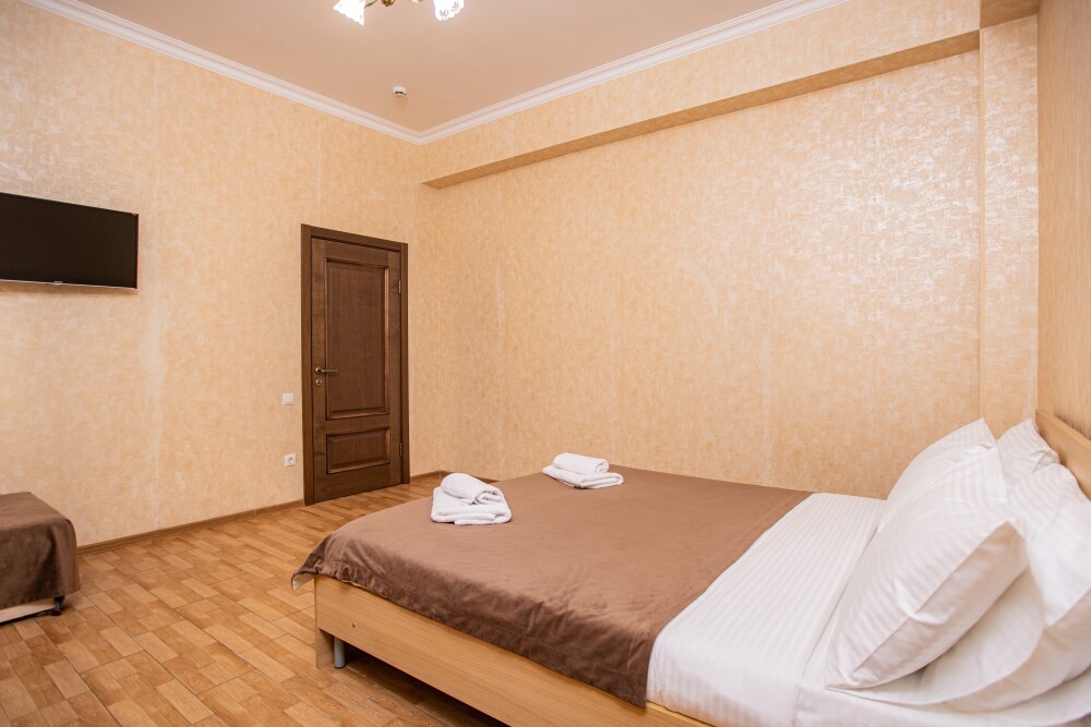 Просторный двухкомнатный номер создан для комфортного отдыха компании до 5 человек. В первой комнате - двуспальная кровать с ортопедическим матрасом, во второй - односпальная кровать и мягкий диван‑софа, легко трансформируемые в 2 дополнительных спальных места. Кондиционер поддерживает идеальную температуру, телевизор дарит часы развлечений, а балкон становится любимым местом для утреннего кофе или вечерних бесед. Всё необходимое - от фена до мелочей - уже подготовлено, чтобы Вы чувствовали себя как дома.