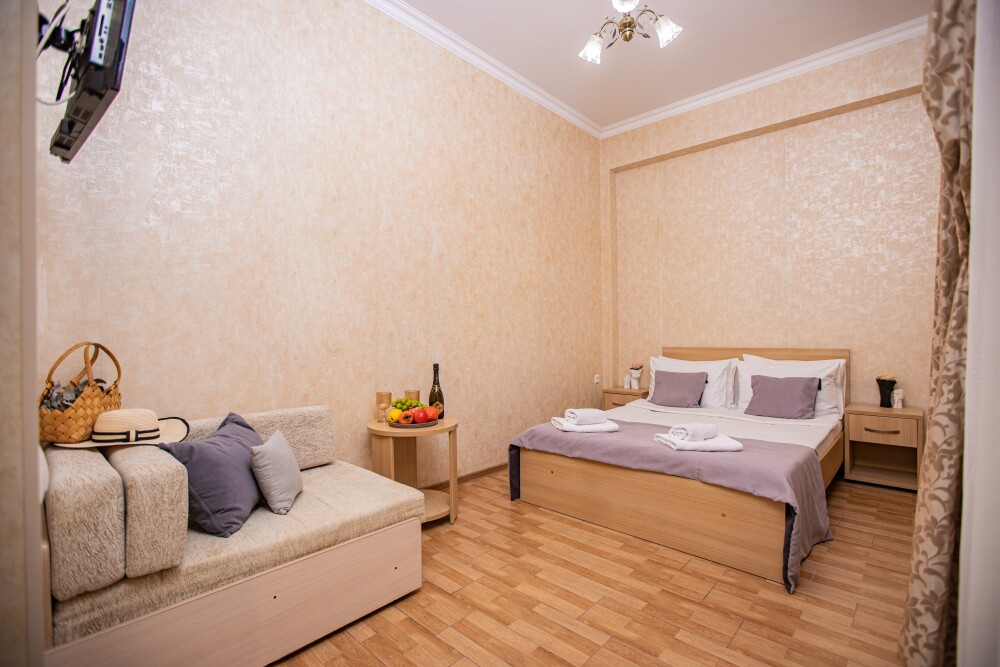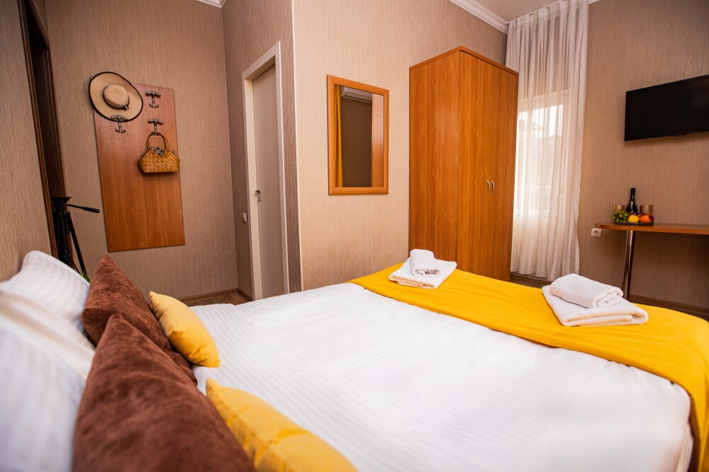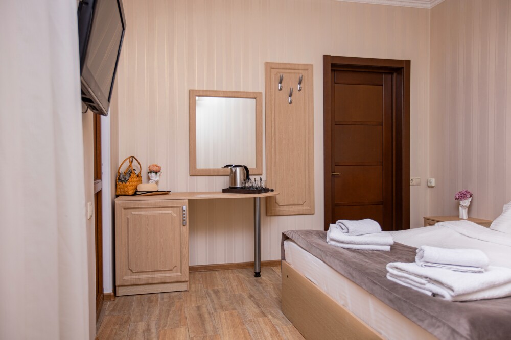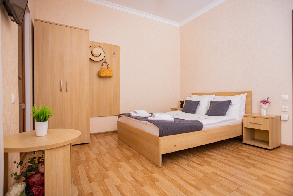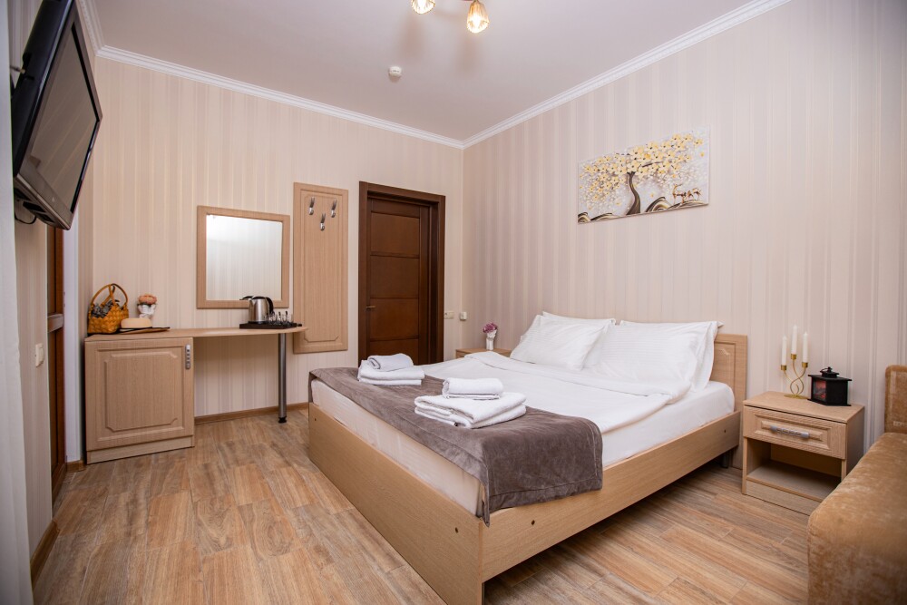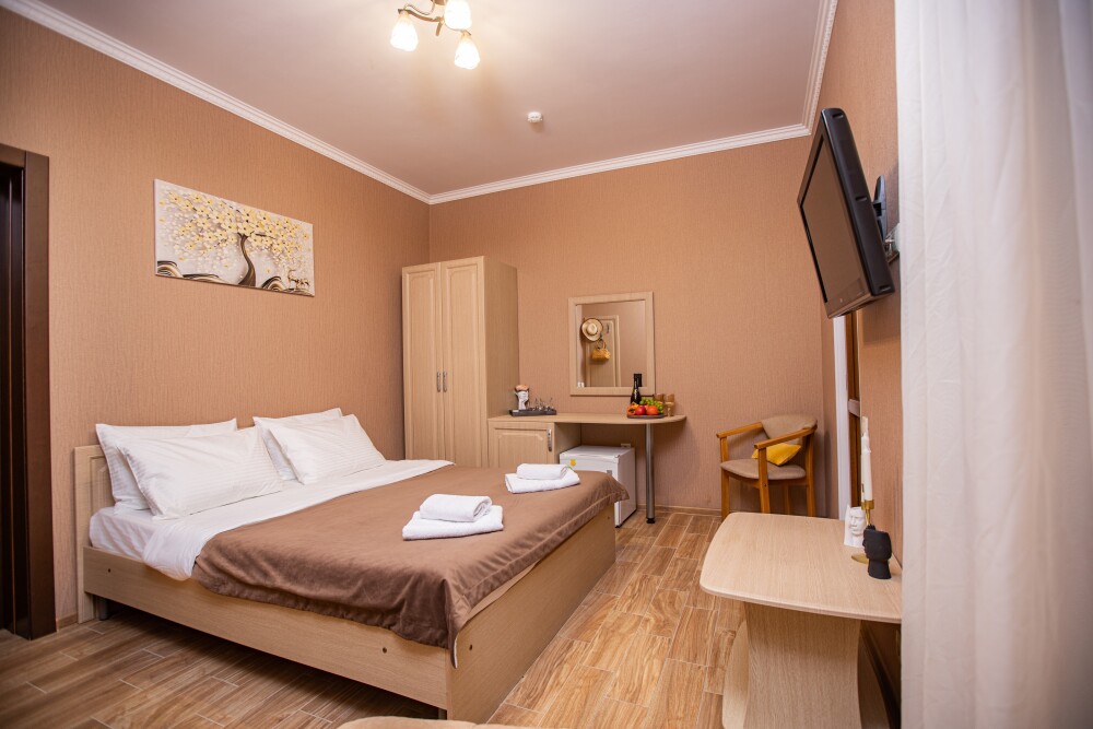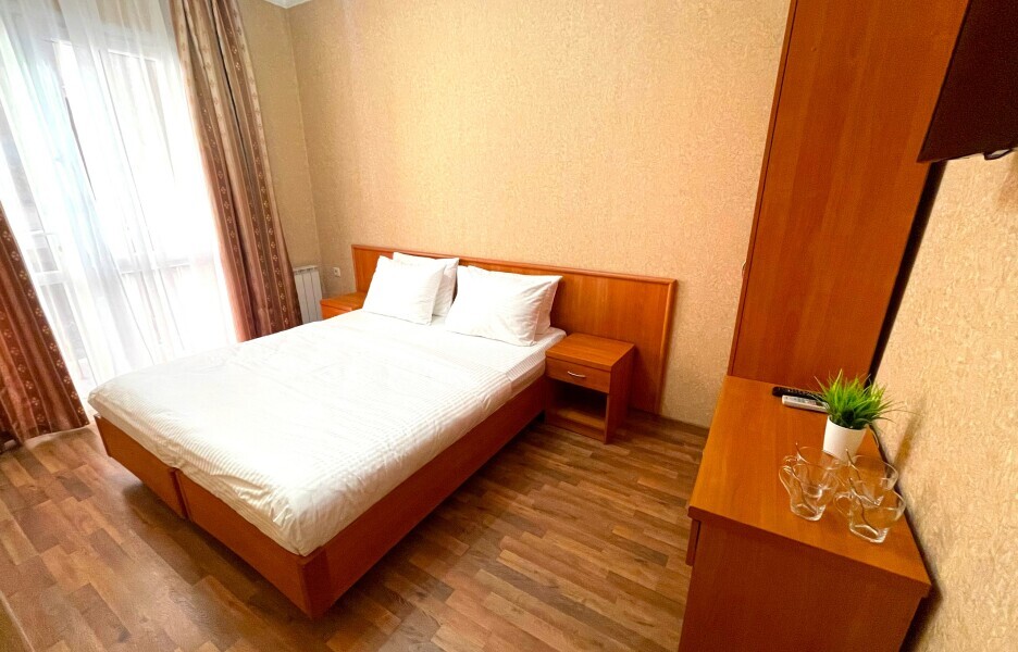 Номер категории Стандарт 15м2, где каждая деталь создана для Вашего удобства. Двуспальная кровать приглашает к безмятежному сну, а одноместная софа легко превращается в дополнительное спальное место. Кондиционер поддерживает приятную прохладу, телевизор развлекает по вечерам, а балкон открывает пространство для утренних ритуалов или вечерних бесед. Всё необходимое - от фена до мелочей - уже подготовлено, чтобы Вы могли сосредоточиться на главном: наслаждении временем с близкими.