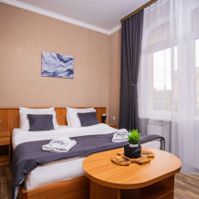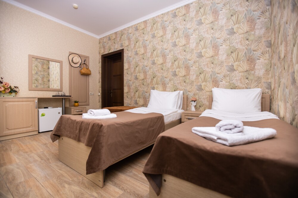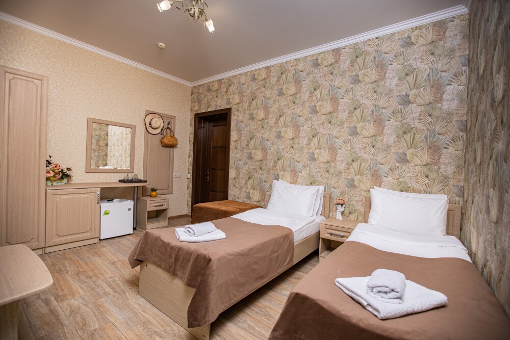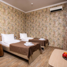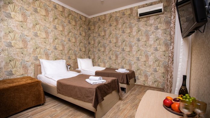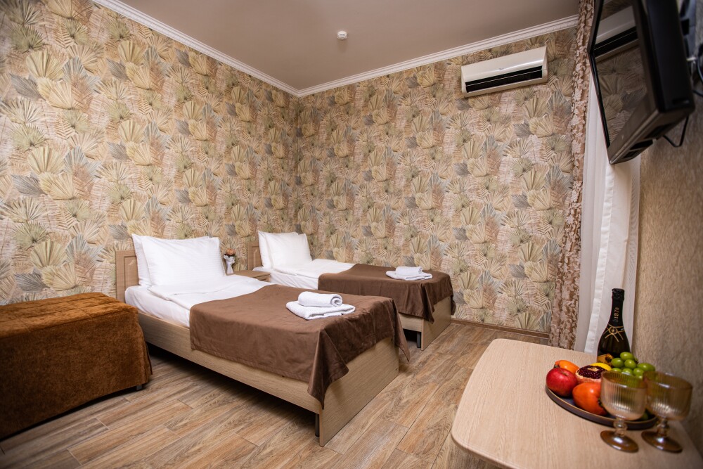 Этот стандартный номер (20м2) создан, чтобы вы чувствовали себя как дома. Двуспальная кровать приглашает к полноценному отдыху, а односпальная легко разместит ребёнка или гостя. Кондиционер подарит свежесть, телевизор - разнообразие досуга, а балкон станет вашим личным пространством для размышлений или чаепитий. Всё необходимое - от фена до мелочей - уже на месте.