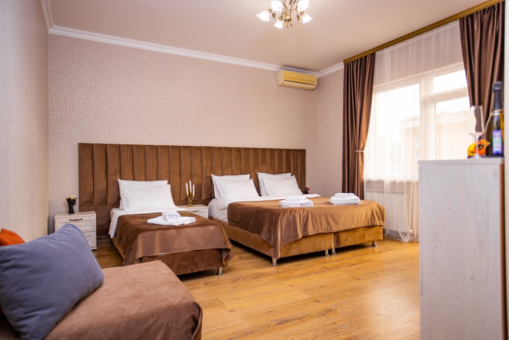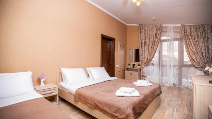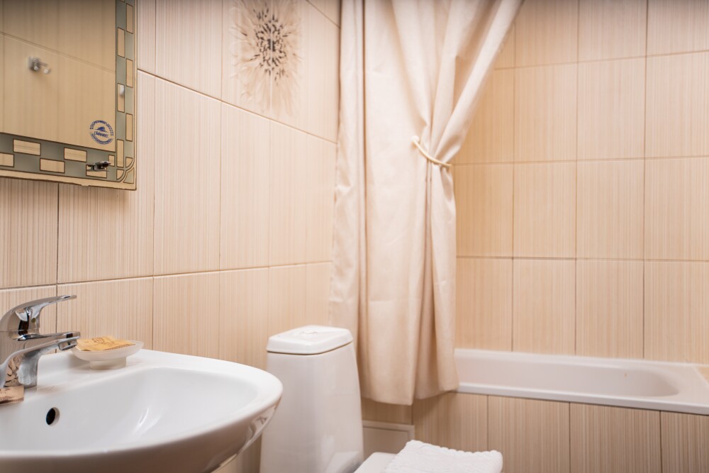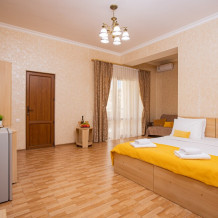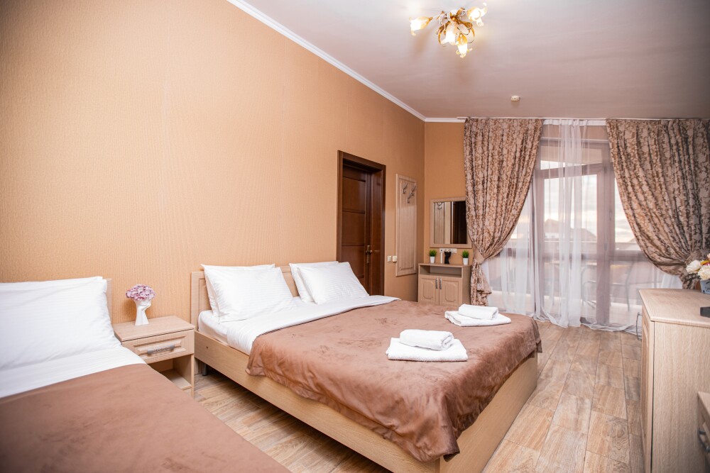 Светлый и просторный номер (25м2) - сочетает современный дизайн и функциональность. Двуспальная кровать с качественным постельным бельём приглашает к отдыху, односпальная кровать обеспечивает дополнительное спальное место, а двухместный диван создаёт комфортную зону для общения. Кондиционер регулирует микроклимат, телевизор добавляет разнообразия, а балкон открывает возможность насладиться свежим воздухом. Фен и все необходимые принадлежности уже на месте — в- Вам остаётся только расслабиться.