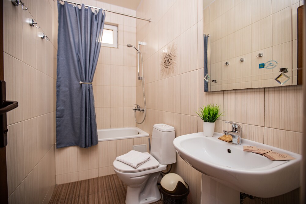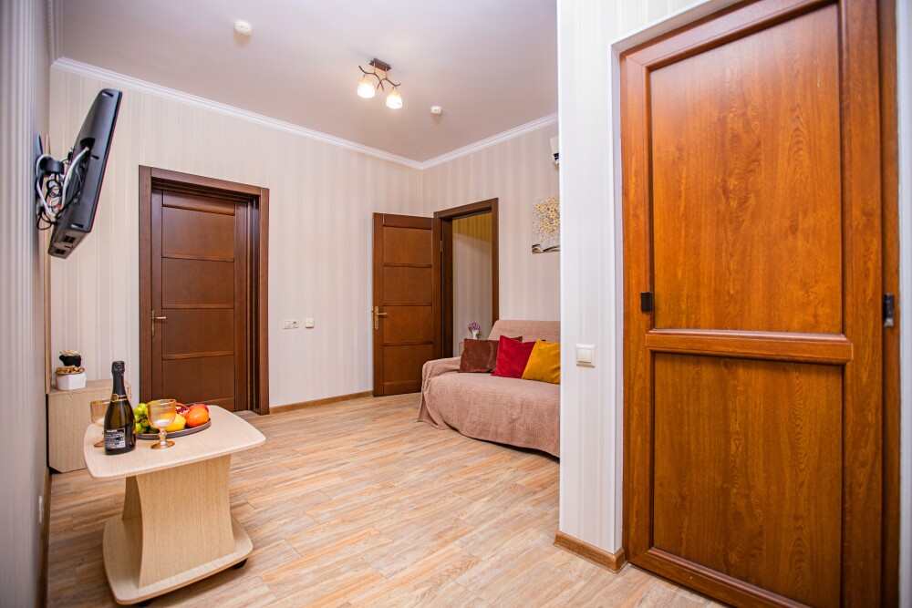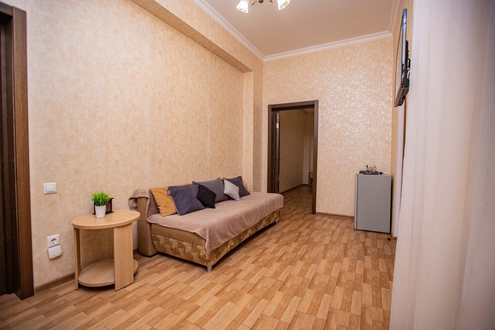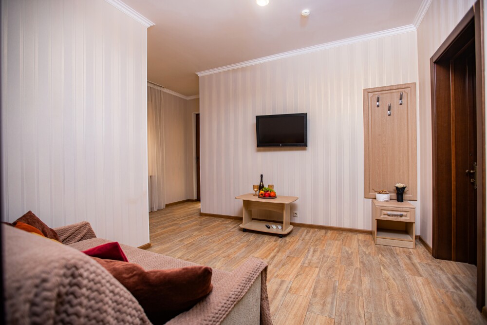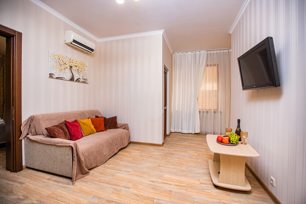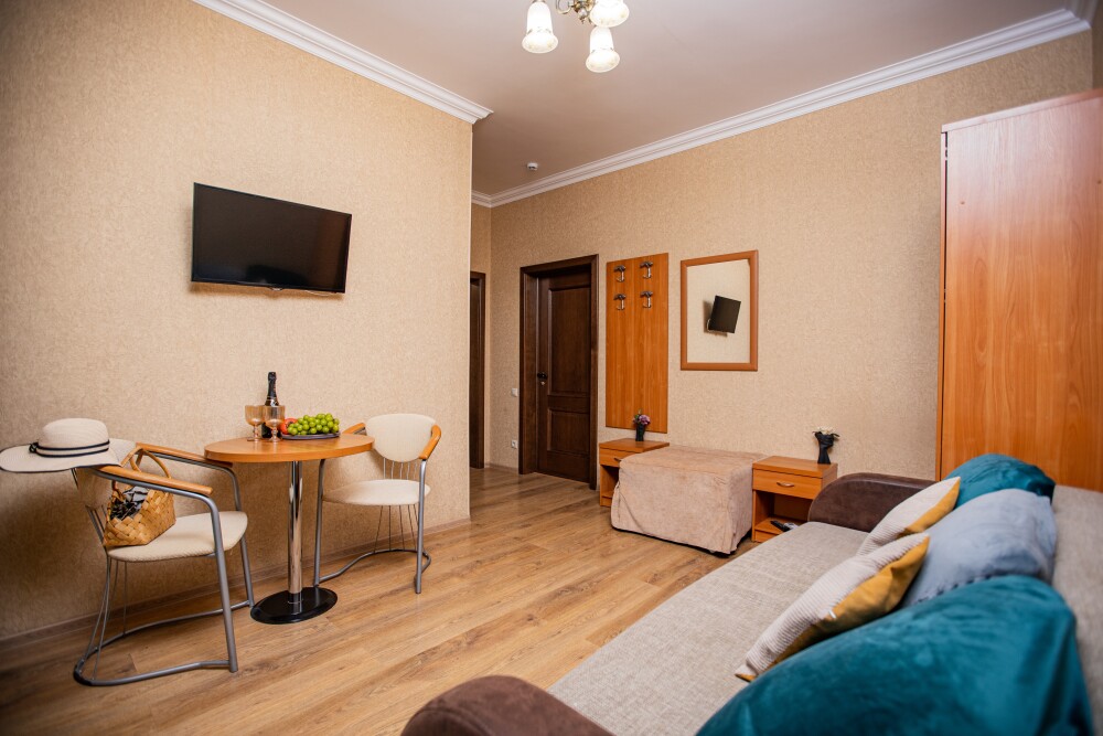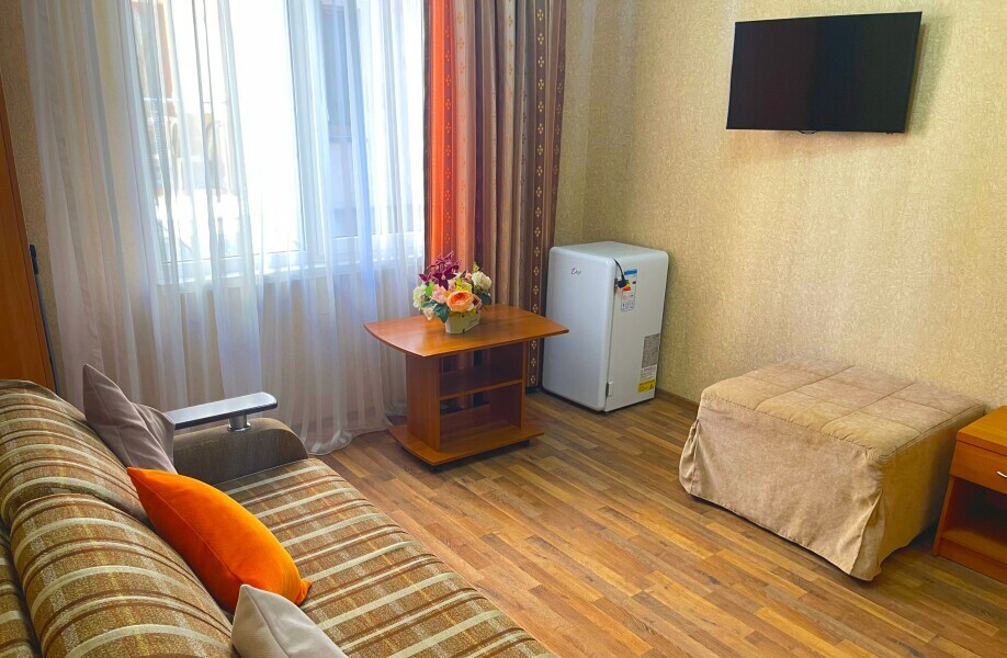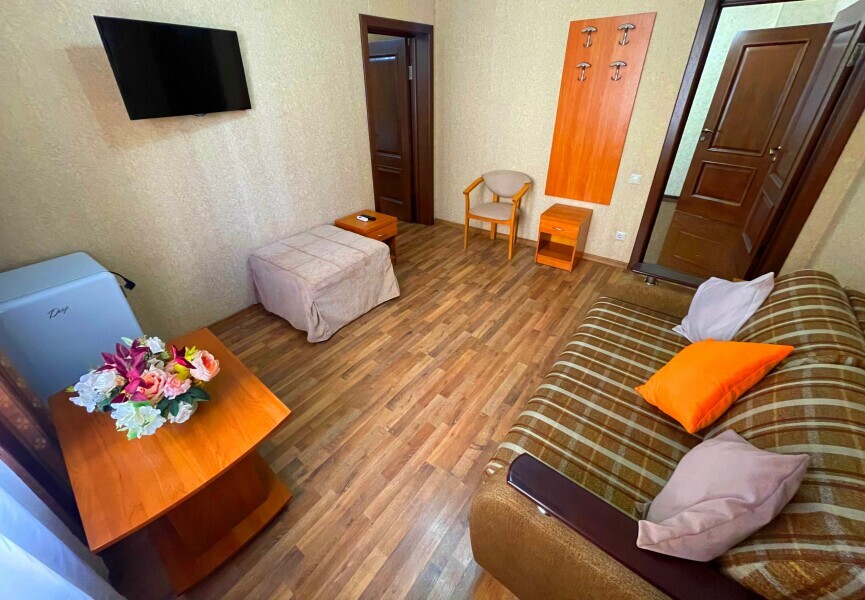 Уютный двухкомнатный номер идеально подходит для размещения компании до шести человек. В первой комнате расположена удобная двуспальная кровать с ортопедическим основанием, во второй — односпальная кровать и мягкий диван, а также две просторные софы, которые легко превращаются в дополнительные спальные места. Кондиционер поддерживает комфортную температуру в любое время года, телевизор создаёт атмосферу домашнего уюта, а балкон становится любимым местом для утренних чаепитий и вечерних бесед. Всё необходимое — от фена до мелочей — уже подготовлено для вашего отдыха.