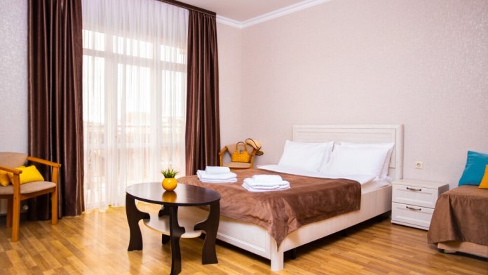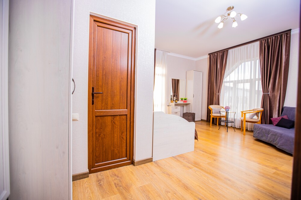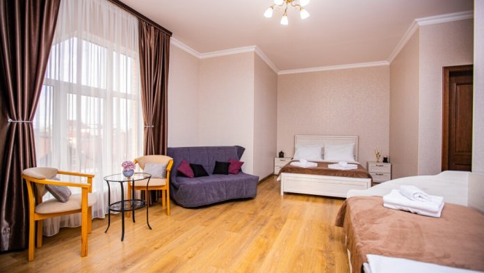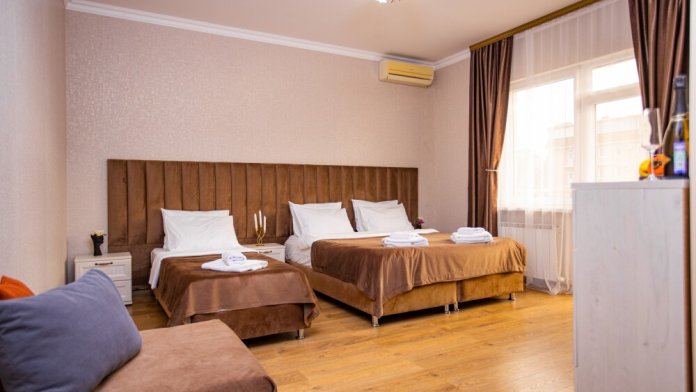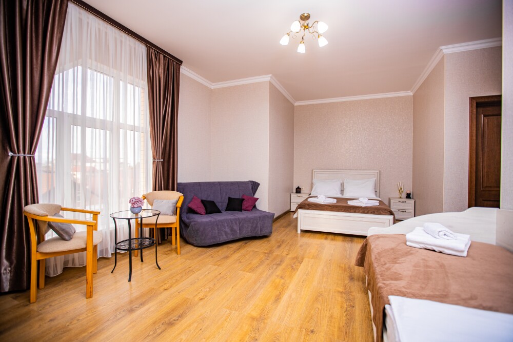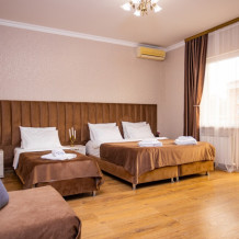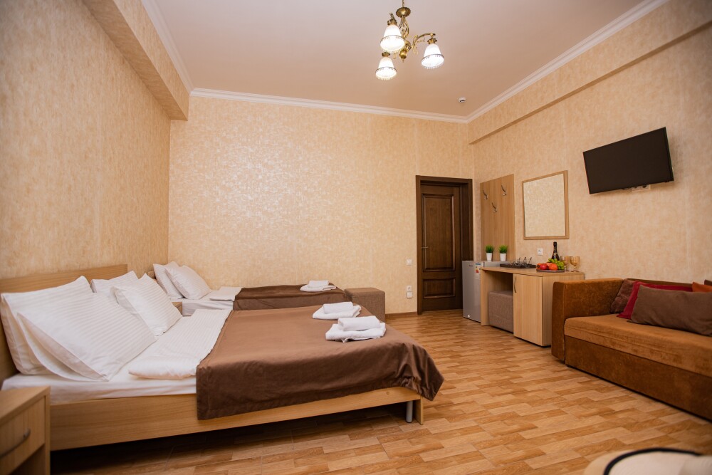 Пятиместный номер категории Комфорт (25м2) - идеальное решение для семейного отдыха или путешествия в кругу друзей. В нём с комфортом разместятся пятеро: просторная двуспальная кровать обеспечит крепкий сон для двоих, мягкий двухместный диван и уютная софа легко трансформируются в ещё три спальных места. Кондиционер создаст приятную прохладу, телевизор подарит часы развлечений, а балкон станет любимым местом для утреннего кофе или вечерних бесед. Всё необходимое - от фена до мелочей - уже подготовлено для Вашего отдыха.