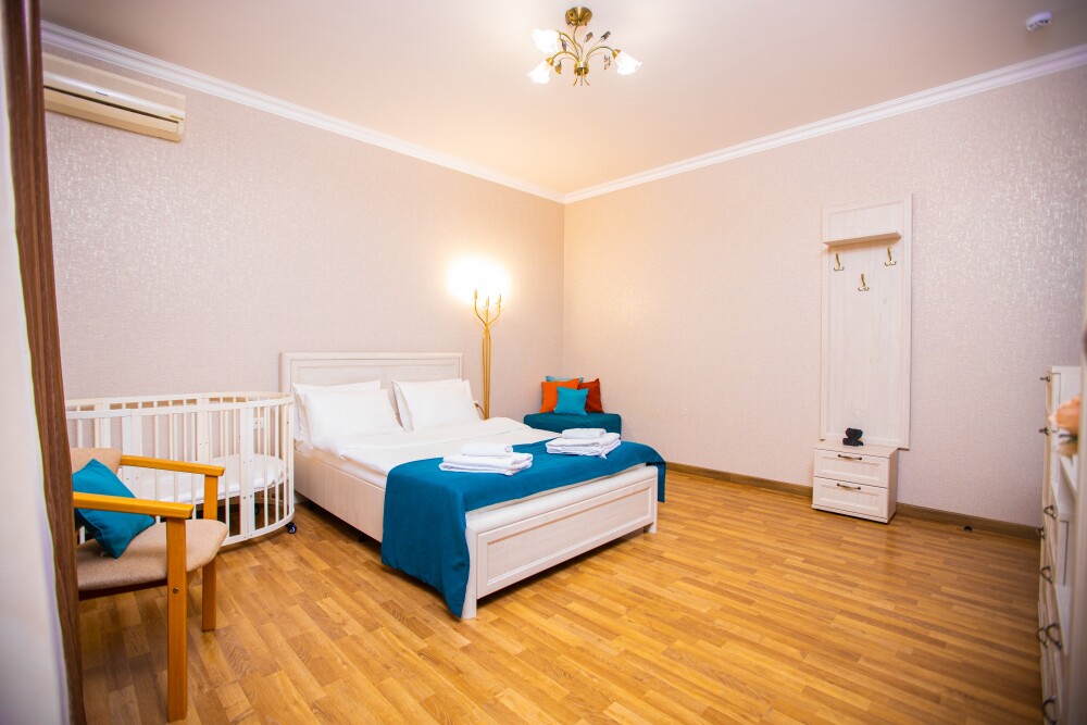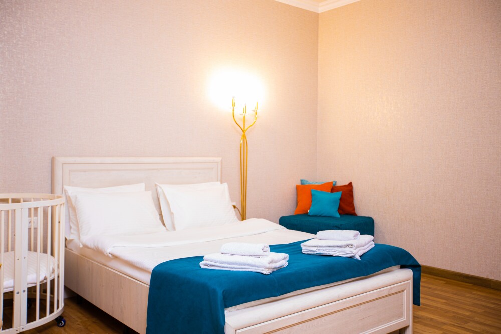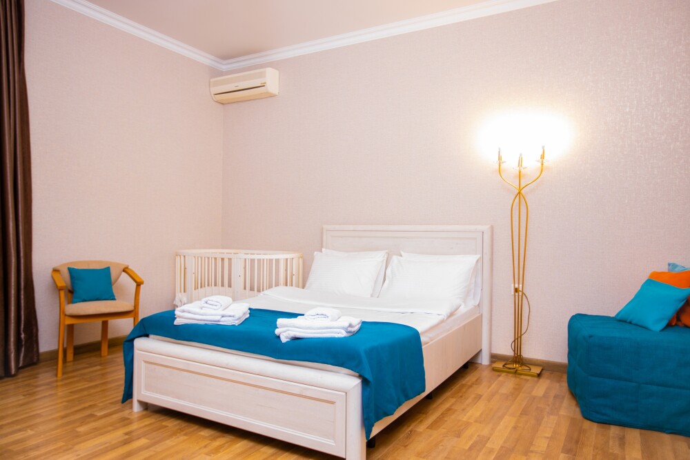 Семейный двухкомнатный номер (28 м2) — идеальное решение для комфортного отдыха с детьми. В первой комнате расположена просторная двуспальная кровать с ортопедическим основанием, гарантирующая крепкий сон. Вторая комната оборудована односпальной кроватью и удобным диваном — здесь с комфортом разместится ребёнок или гость. Современные удобства включают кондиционер для поддержания оптимальной температуры, телевизор для вечерних просмотров и фен для утренних сборов. Особая прелесть номера — собственный балкон, где можно выпить чай на рассвете или полюбоваться вечерними огнями.