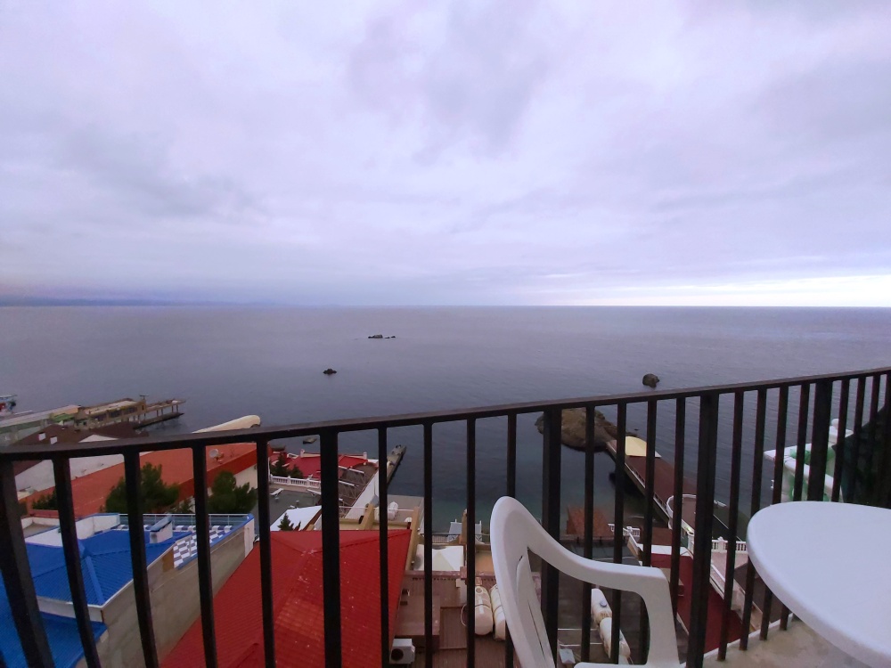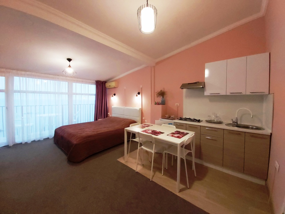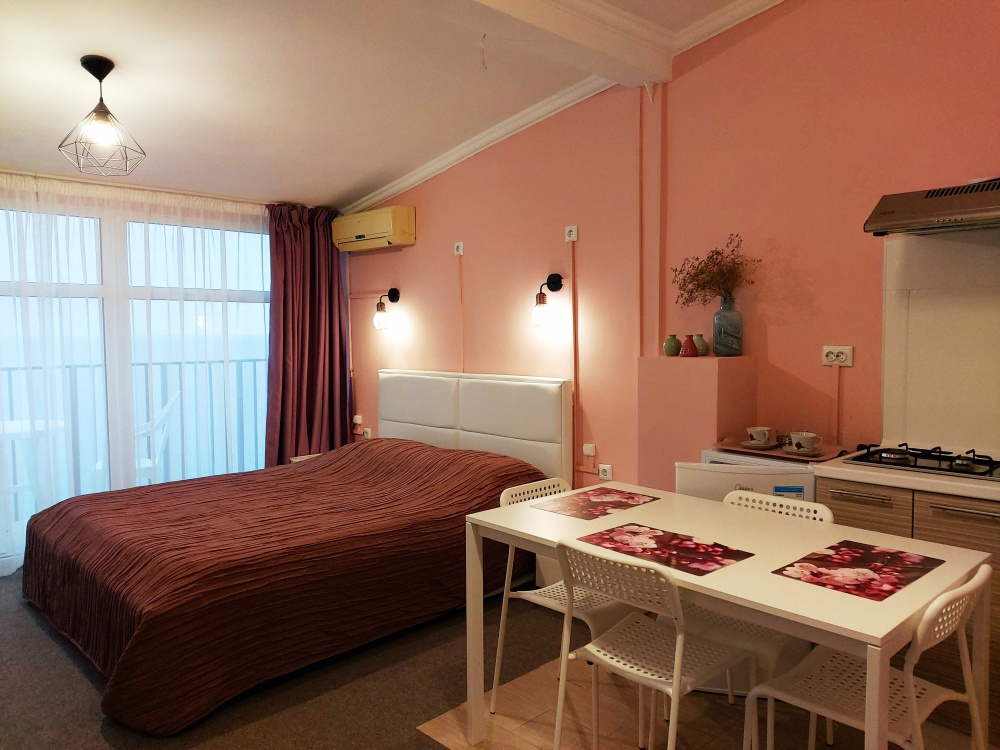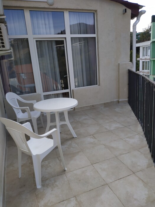 Терраса с прямым видом на море (стол и стулья), 4 спальных места, две комнаты (спальня и детская). Спальня двухспальная кровать, в детской комнате раскладной диван. Телевизор LCD, кондиционер, холодильник, электрочайник. Санузел (душевая кабина). Wi-Fi (интернет). Прямой вид на море видовая площадка. Фильтрованная вода бесплатно.
