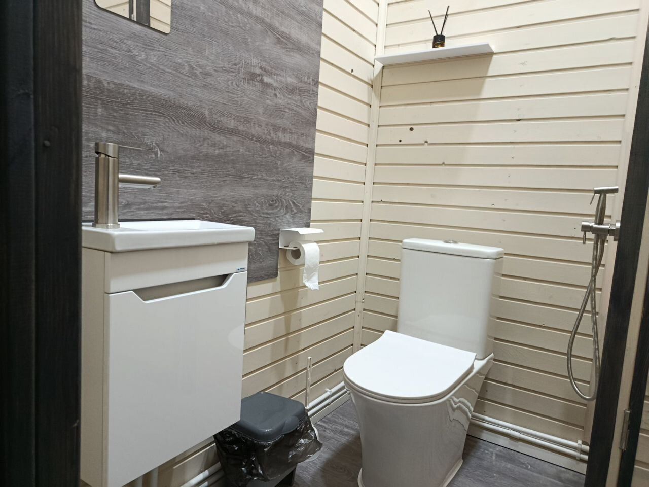 - В туалетной комнате имеется унитаз с гигиеническим душем, мини раковина для мытья рук, стиральная машина.