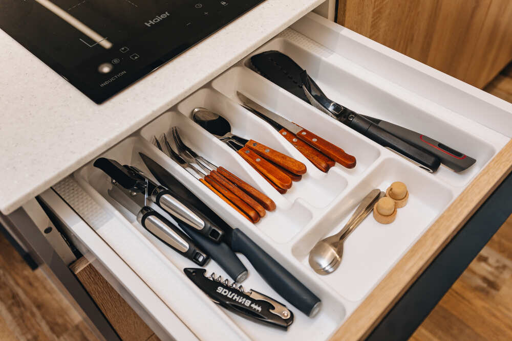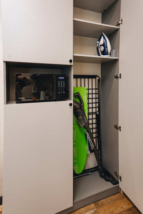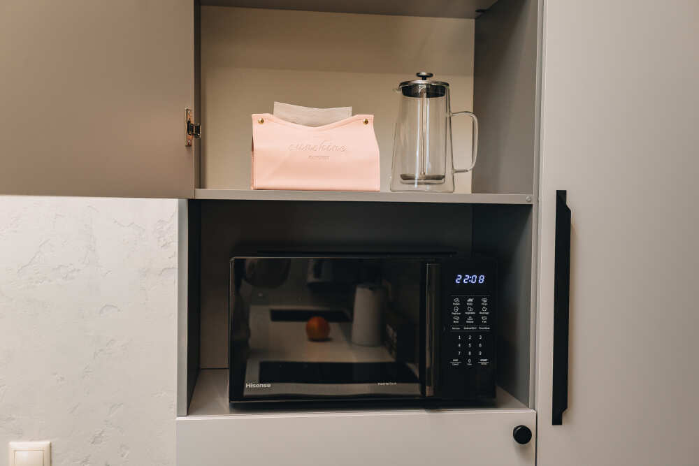 В квартире есть все, что может понадобиться для приготовления еды. Также есть вся посуда для комфортного проживания: ножи, столовые приборы на 4 человек, кастрюли, сковородки, тарелки, бокалы и многое другое включено, если снять квартиру у нас.