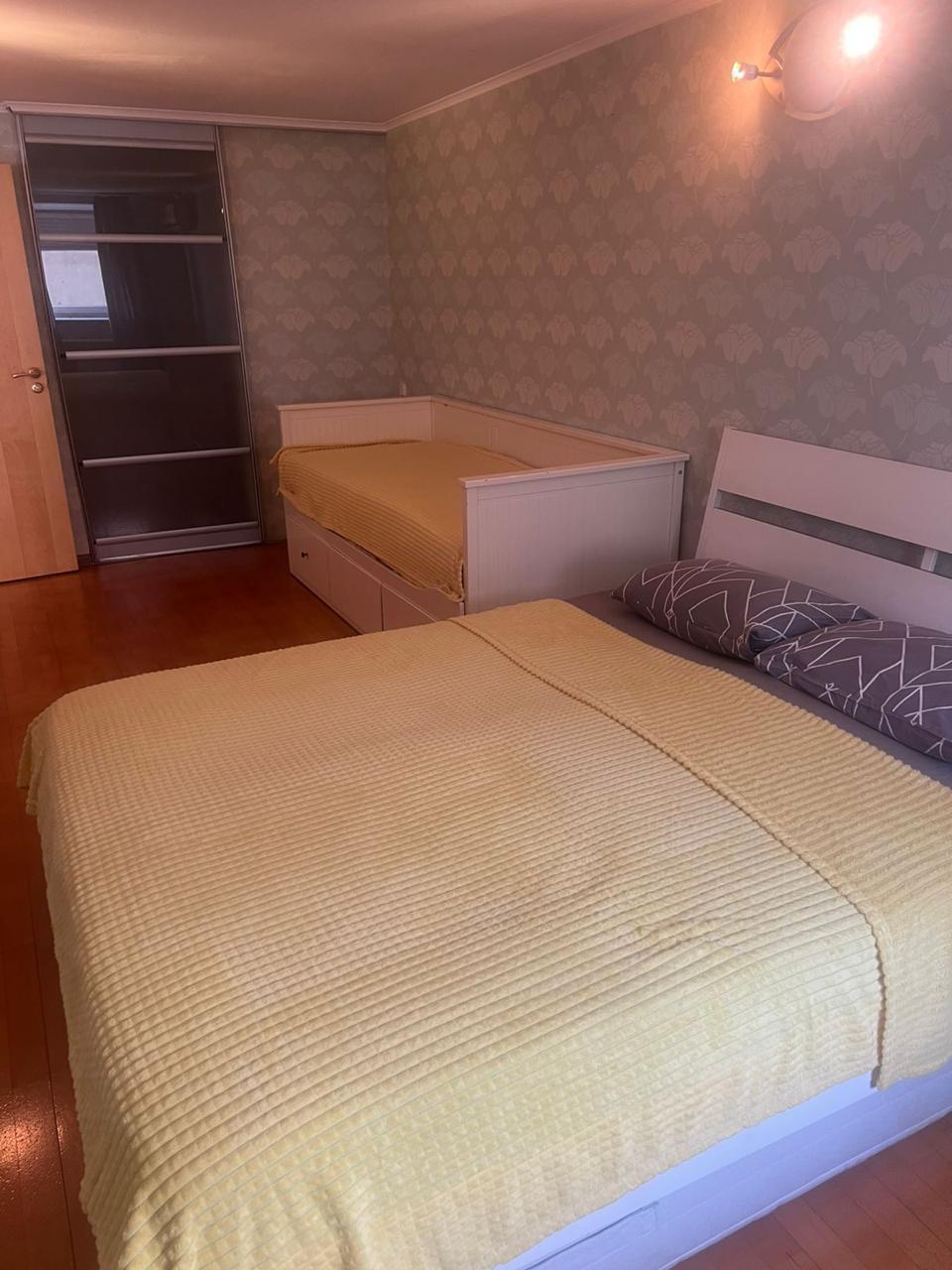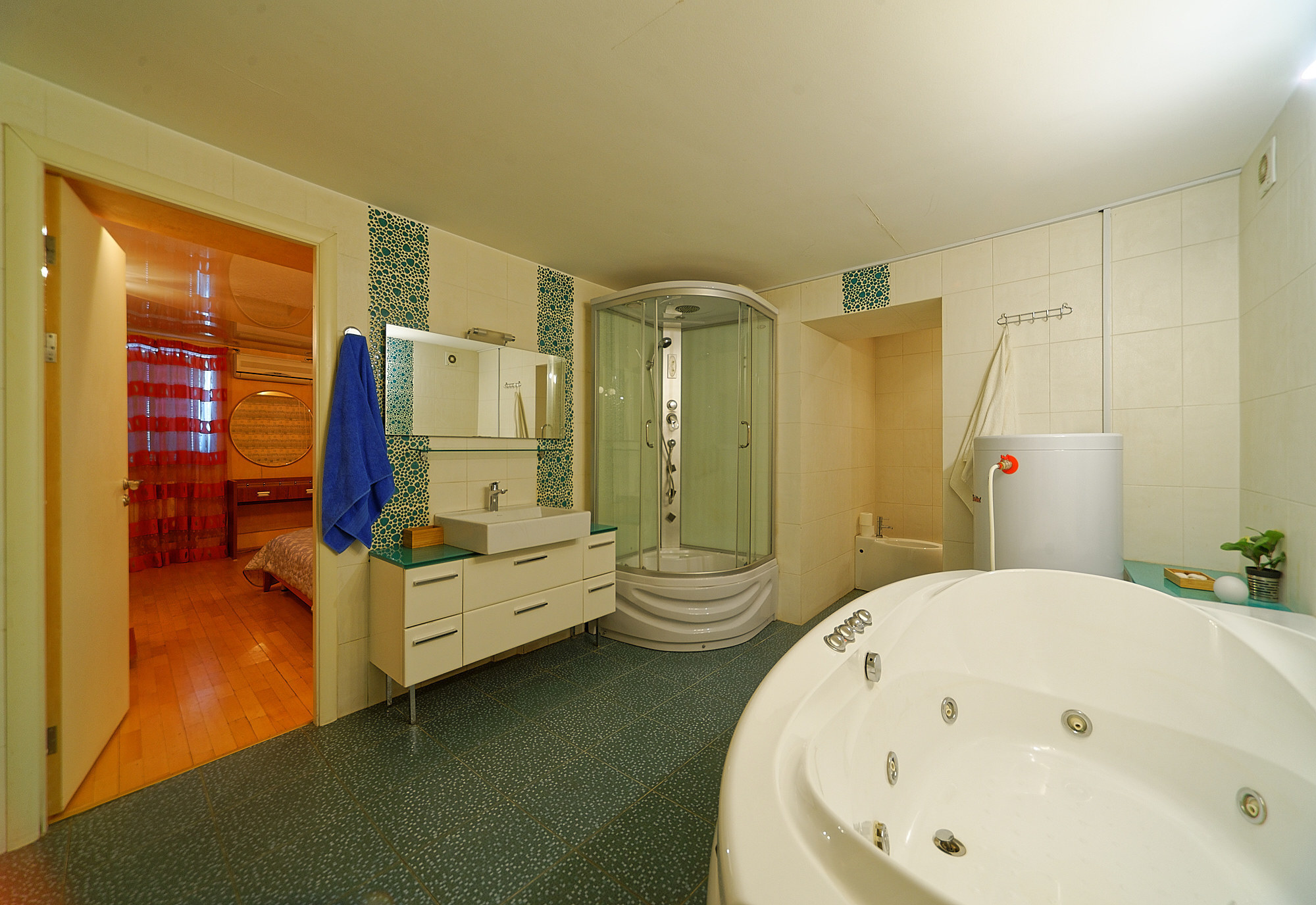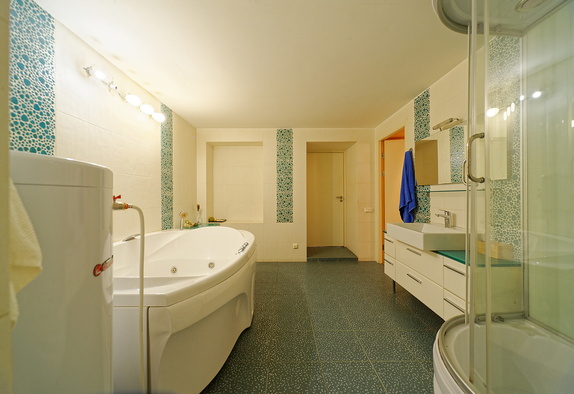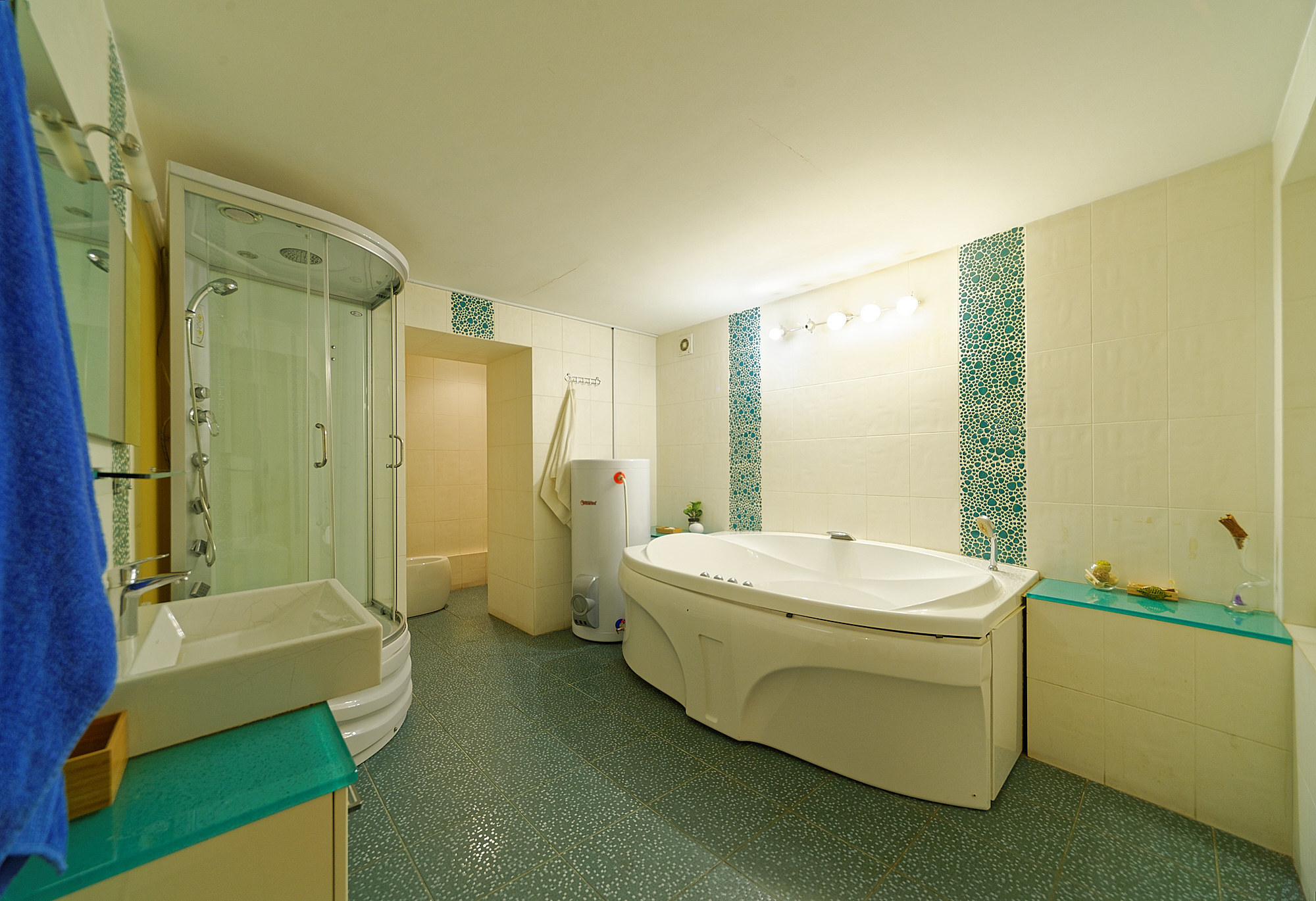 - 14+ спальных мест: 3 изолированные спальни с двуспальными кроватями (160, 160 и 180 см). В одной из них — раскладной диван-кровать. В гостиной — 3 односпальных дивана, а также 4 дополнительных места (раскладное кресло, тахта, 2 надувные кровати).