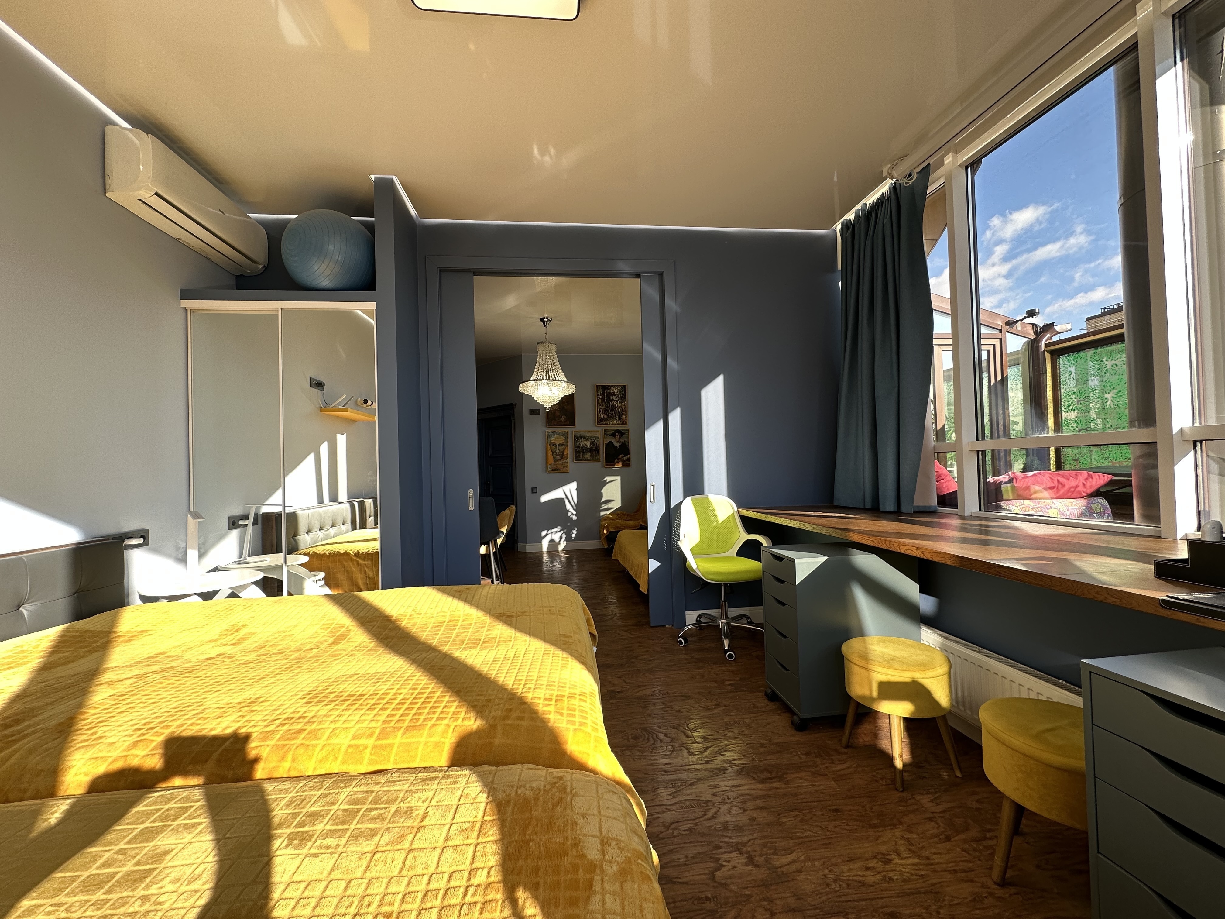 Первая спальня с выходом в остеклённый зимний сад и открытую террасу (40 м²), откуда открываются панорамные виды на город.