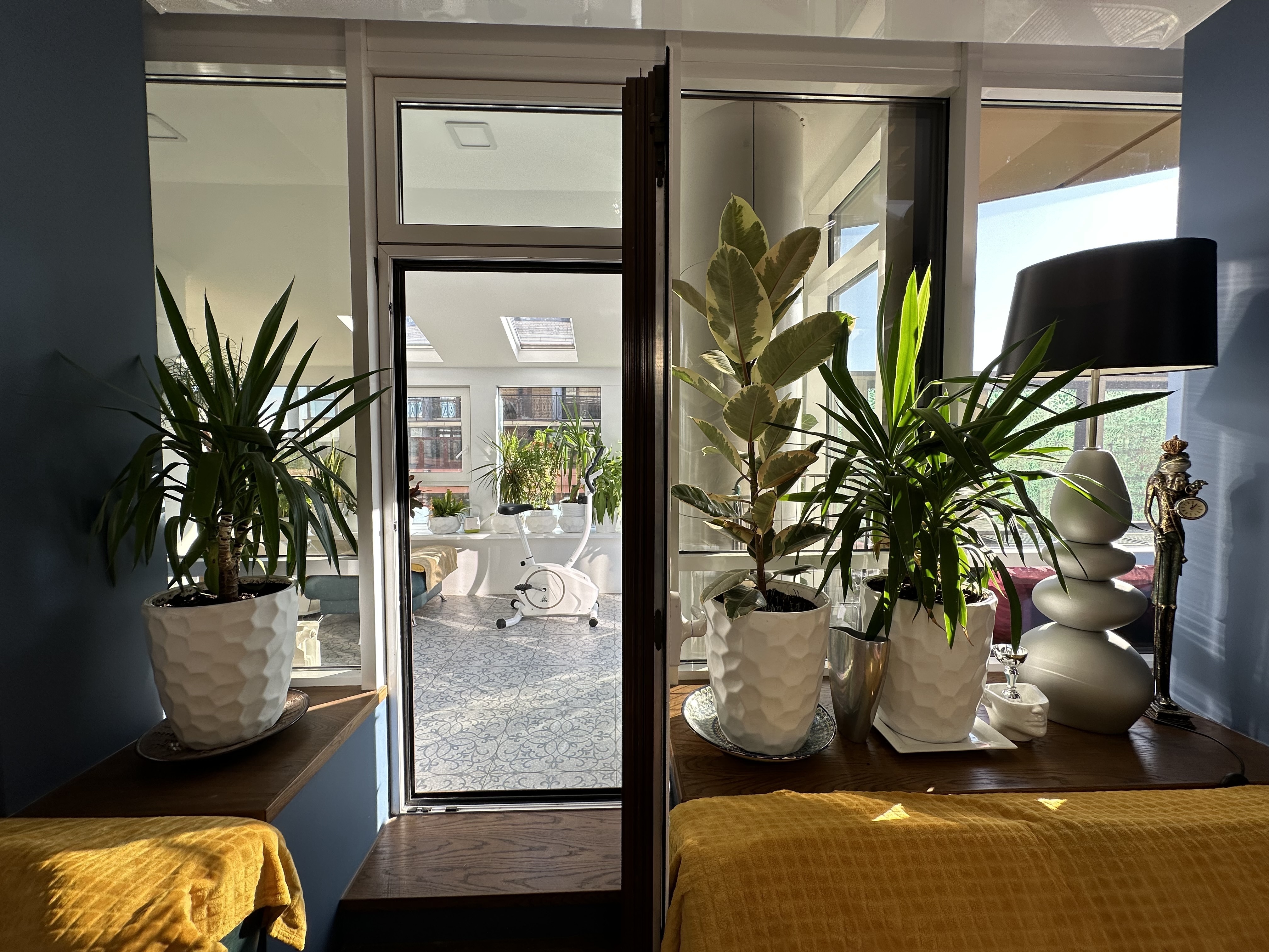 Продолжая маршрут, Вы входите в оранжерею с фитнес-зоной место для перезагрузки. Отсюда снова можно вернуться в гостиную и пройти в уединённую вторую спальню с панорамой Петербурга. Завершение маршрута - захватывающие виды на Троицкий собор, Исаакиевский, Адмиралтейство и Финский залив. Два санузла.