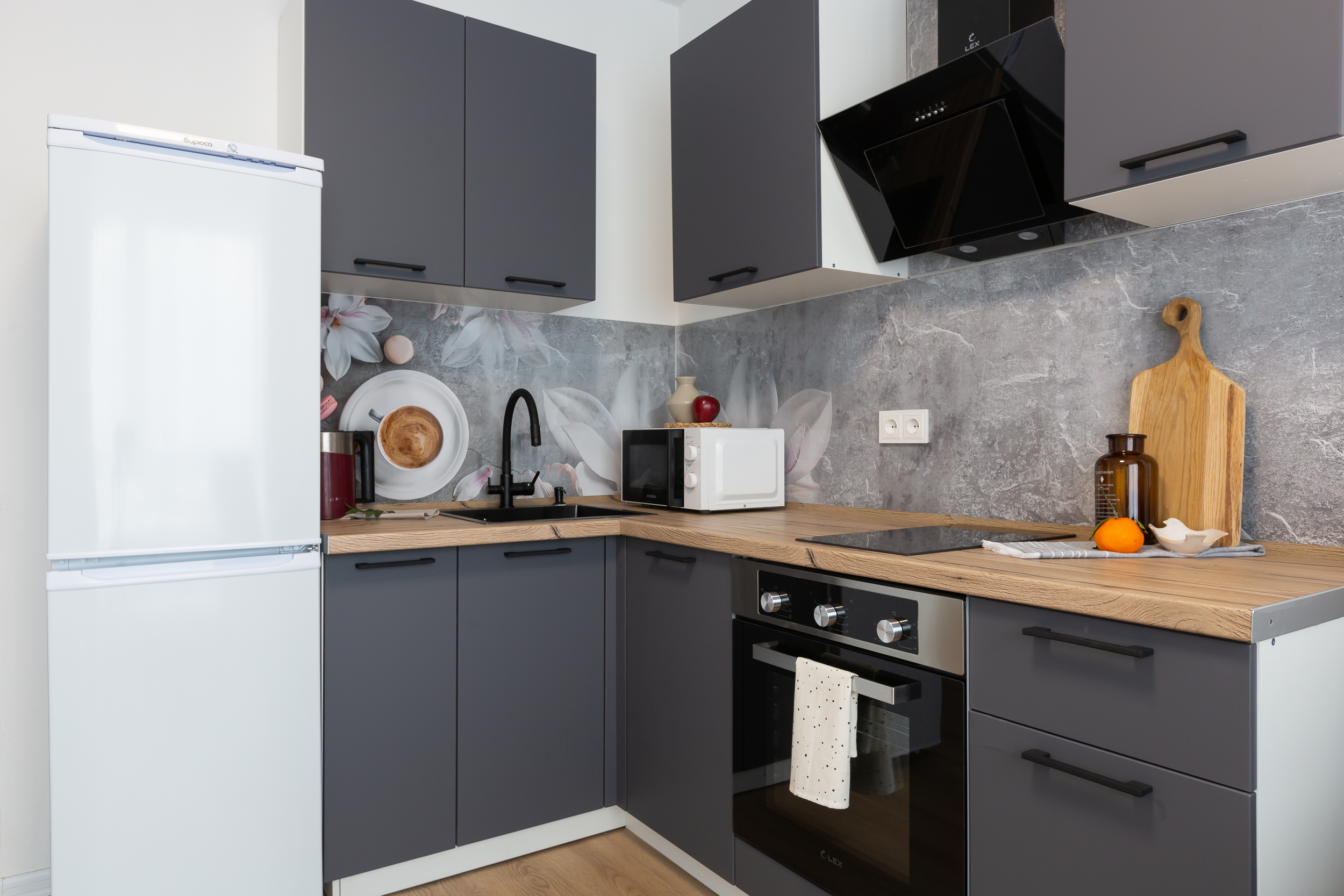- плита, микроволновка, чайник, холодильник;