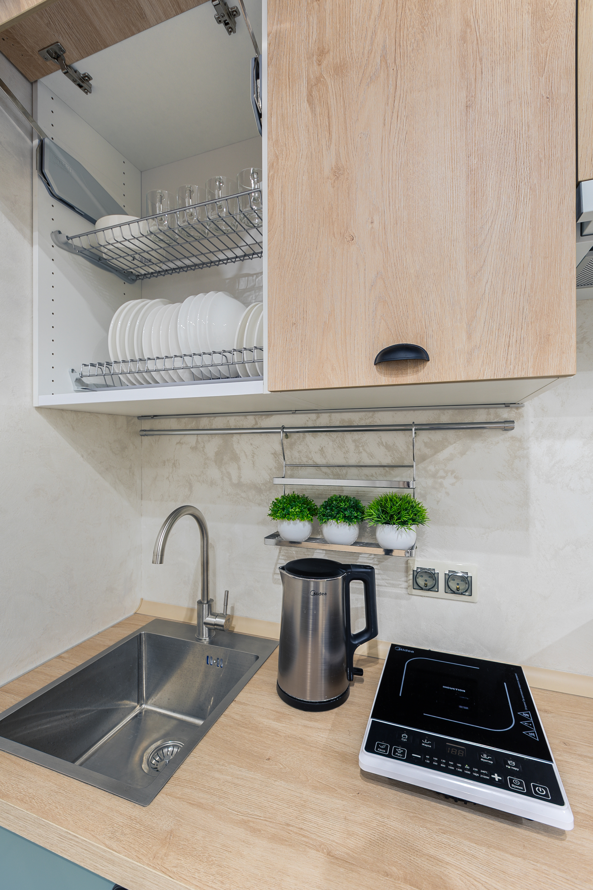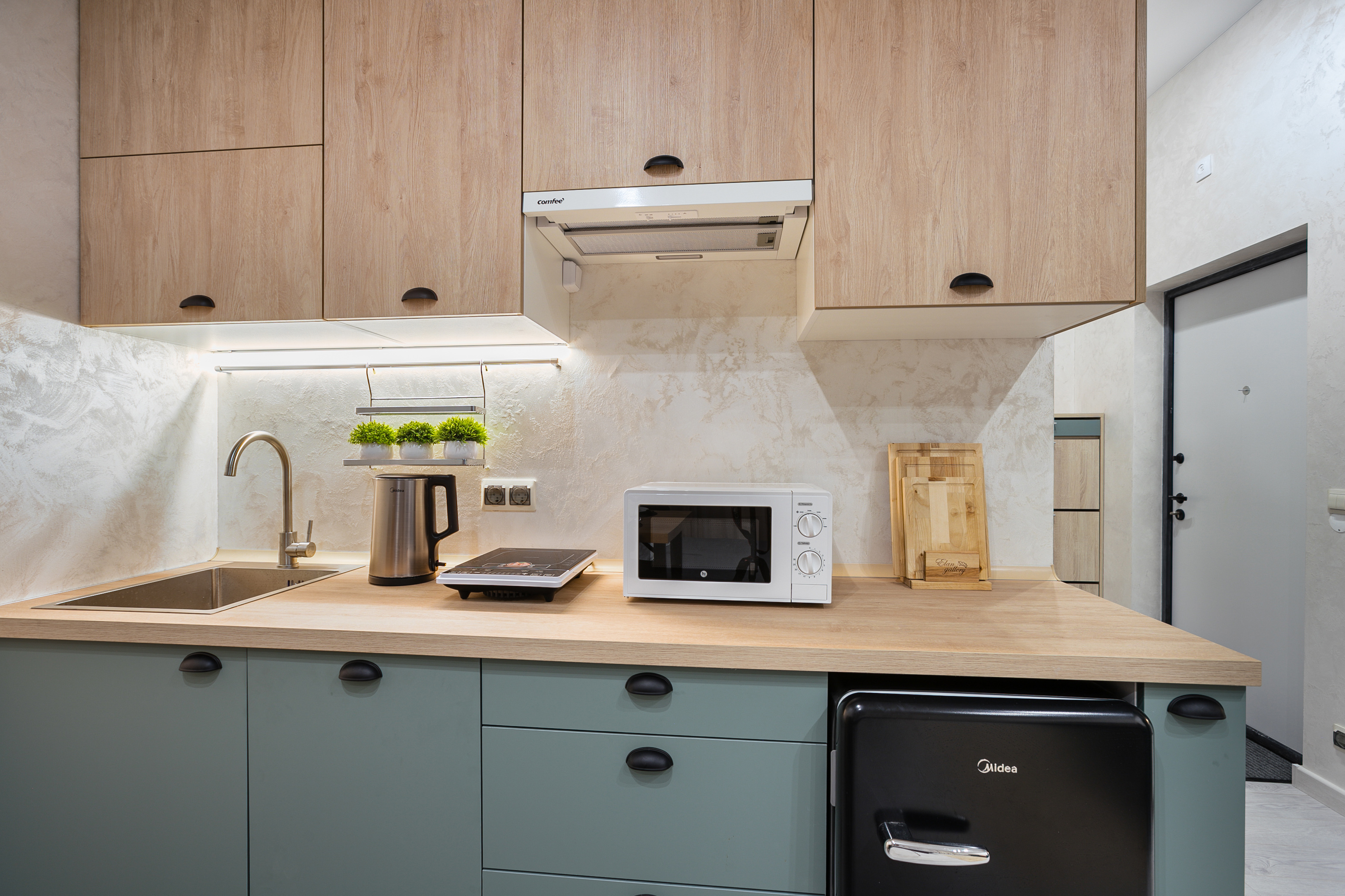 - плита, микроволновка, чайник, холодильник;
