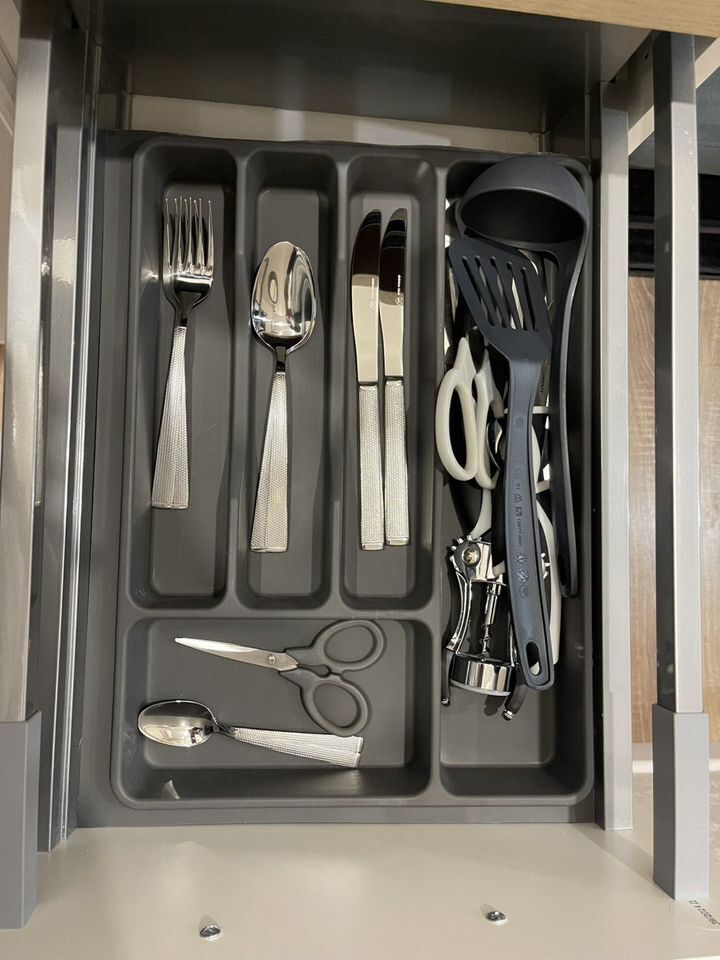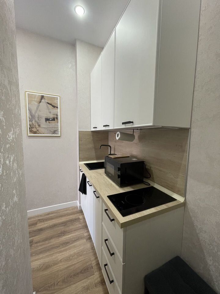 Кухонная зона, состоит из барного обеденного стола, микроволновая печь, варочная панель, мини-холодильник с морозильной камерой, полный комплект кухонной утвари для готовки, полный комплект посуды на 2-ух гостей (см, фото), моющее средство для посуды.