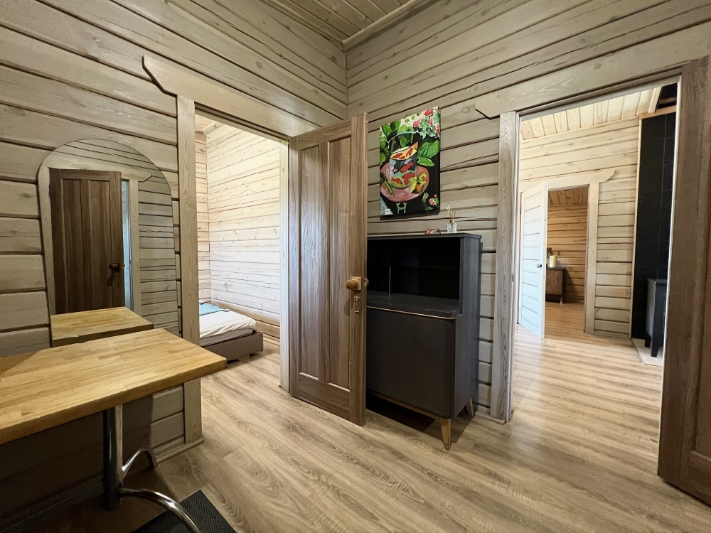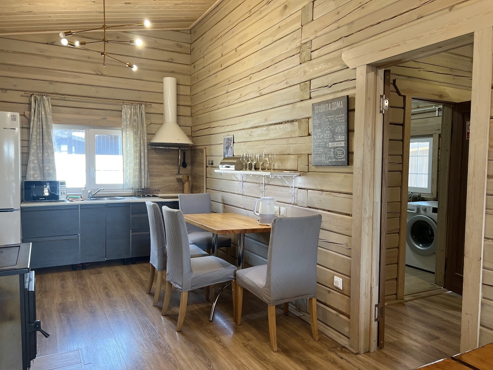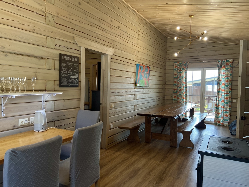 Деревянный, уютный и светлый дом для отдыха на природе, дом расположен на участке 8 соток, в нем есть всё необходимое для комфортного пребывания гостей. Дом полностью огорожен забором имеет свою парковку на несколько машин. В доме 3 отдельные спальни (10 спальных мест), большая кухня столовая на 16 посадочных мест. Имеется вся необходимая посуда, чайник, микроволновая печь, индукционная плита, холодильник, телевизор, обеденные столы со стульями, постельное белье, полотенца, чай, мыло, шампунь, тапочки, туалетные принадлежности.