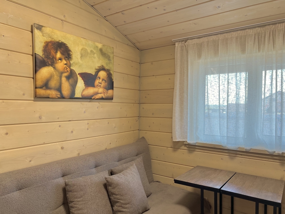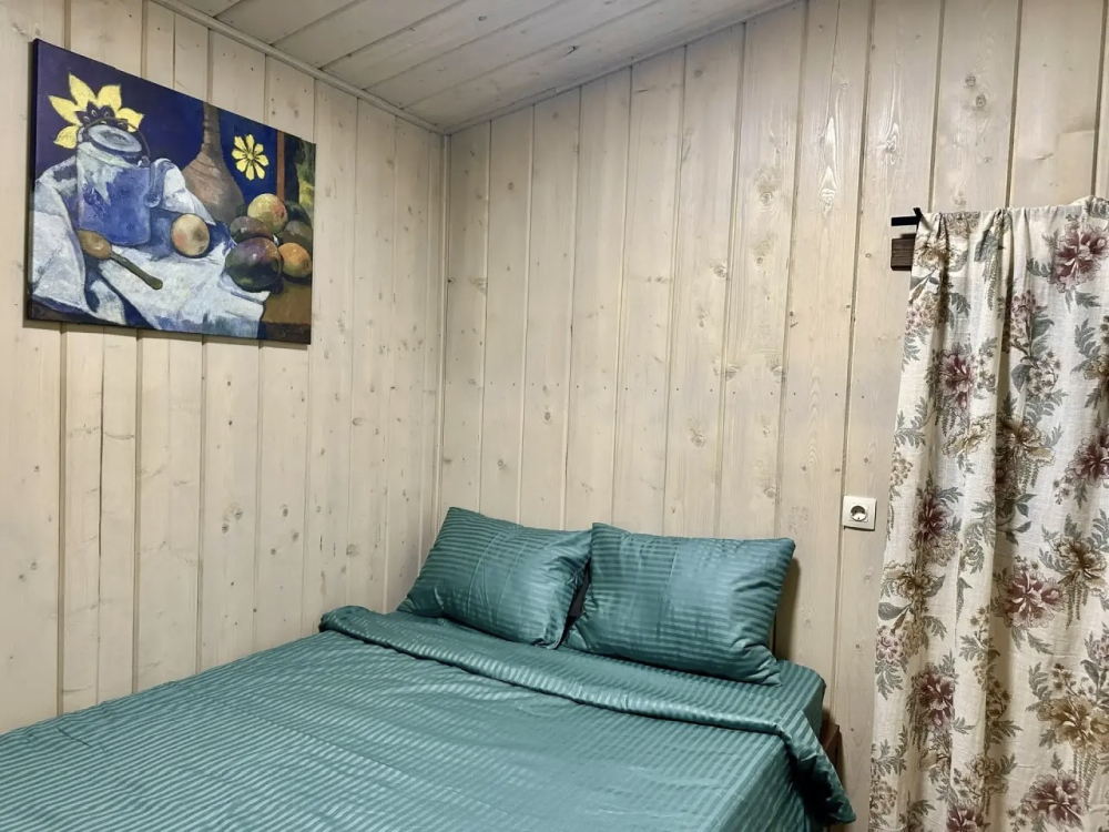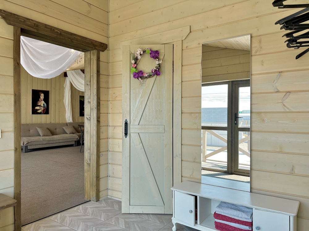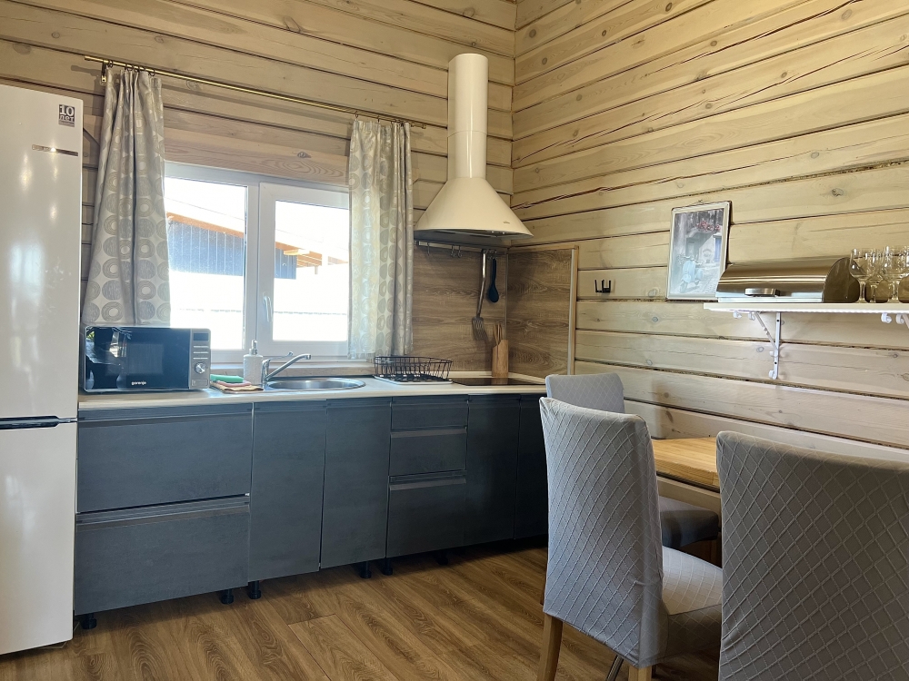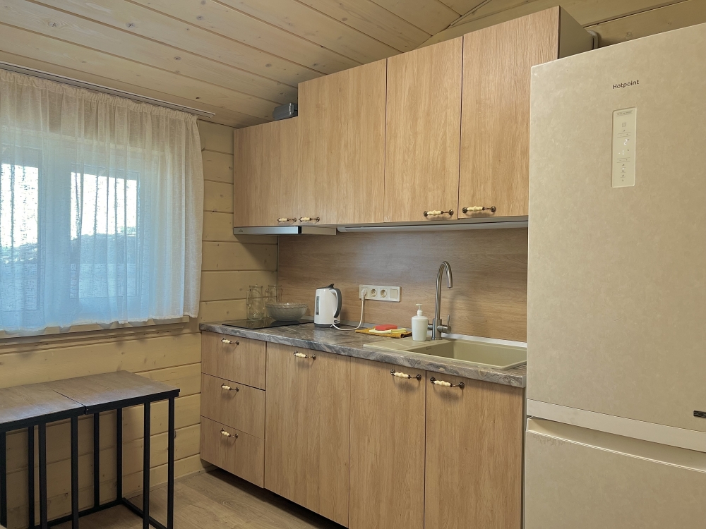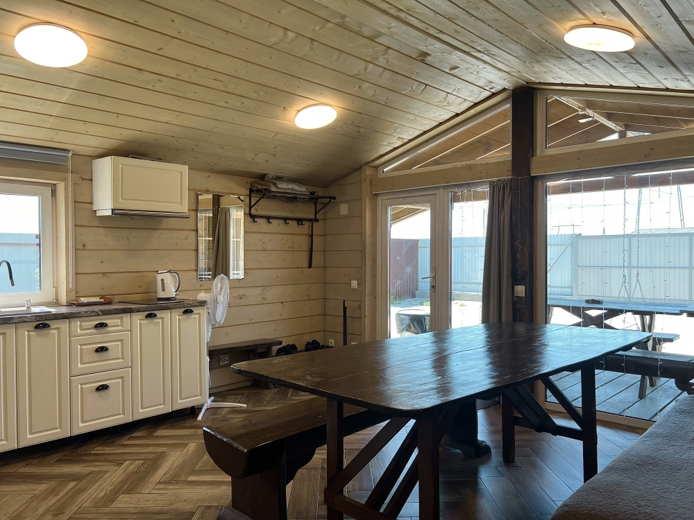 Светлый и просторный дом для отдыха на природе с террасой и качелью. Дом из натурального дерева, расположен на участке 6 соток, в нем есть всё необходимое для комфортного пребывания гостей. Дом полностью огорожен забором имеет свою парковку на несколько машин. В доме 2 отдельные спальни, большая кухня гостиная. Имеется вся необходимая посуда, чайник, микроволновая печь, индукционная плита, холодильник, телевизор, большой обеденный стол со скамьями, постельное белье, полотенца, чай, мыло, шампунь, тапочки, туалетные принадлежности.