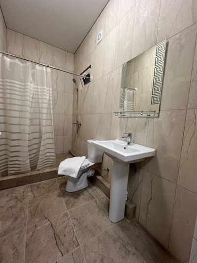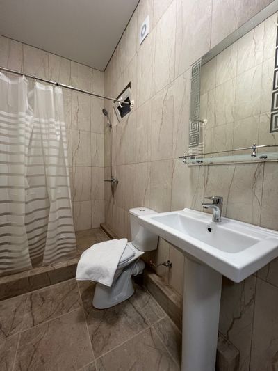 Индивидуальная ванная комната: душ, раковина, туалет.