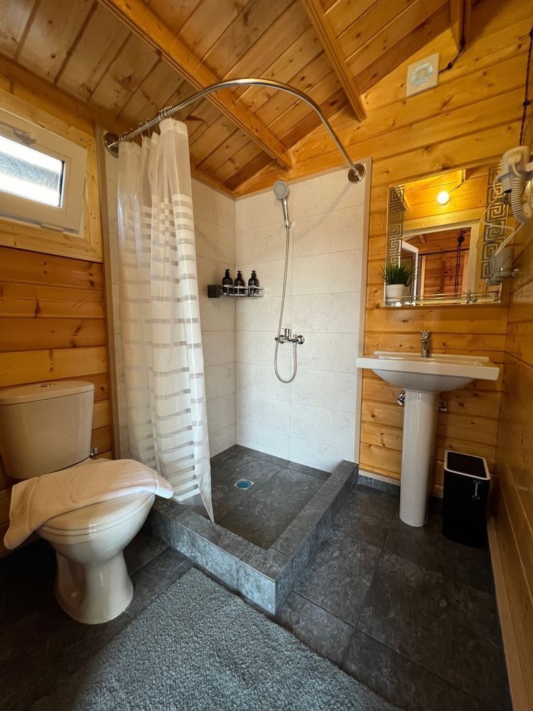 Индивидуальная ванная комната: душ, раковина, туалет.
