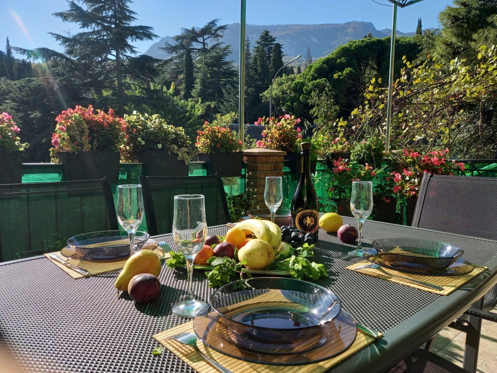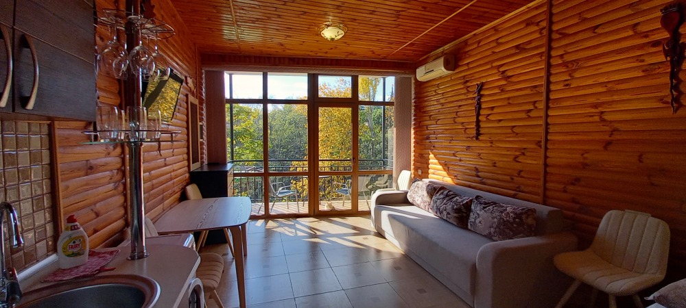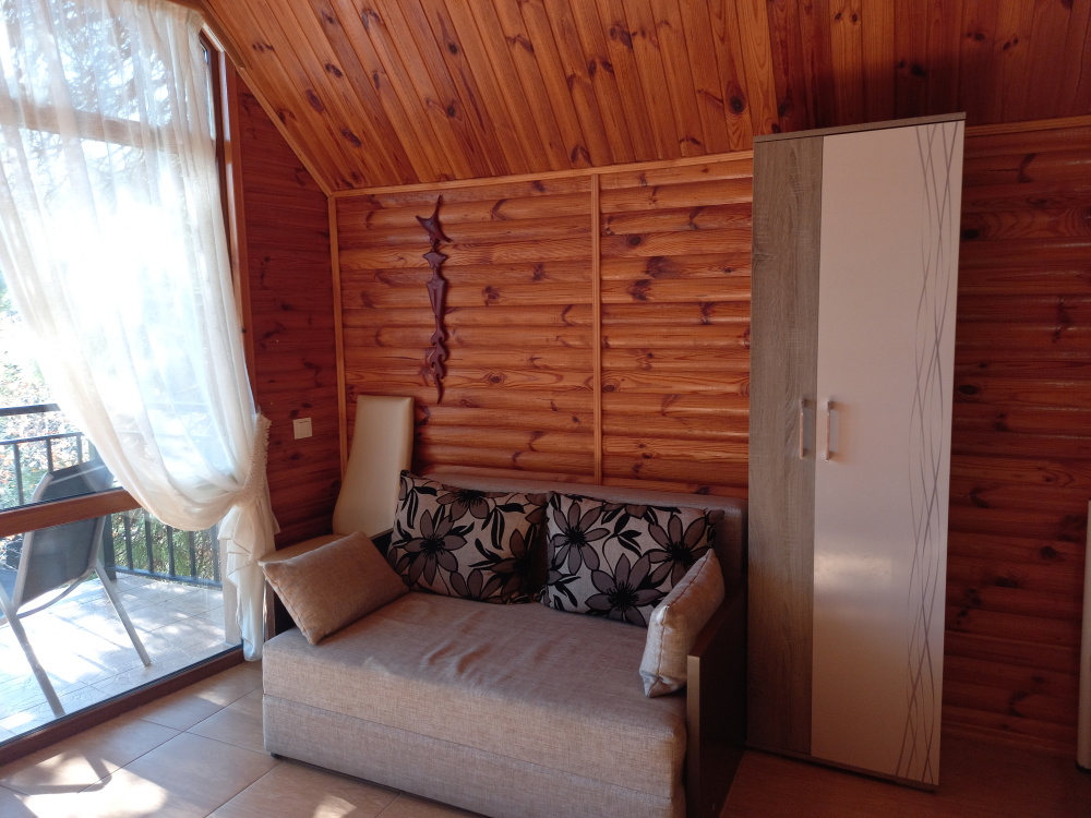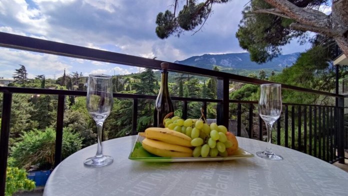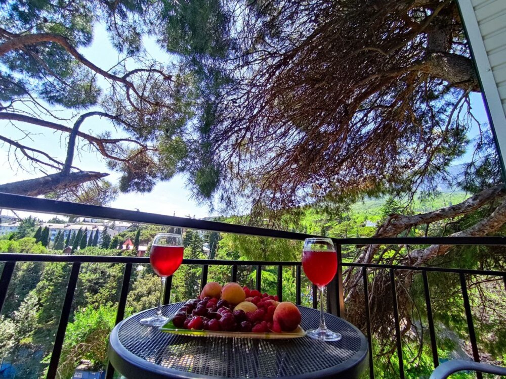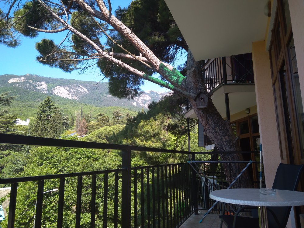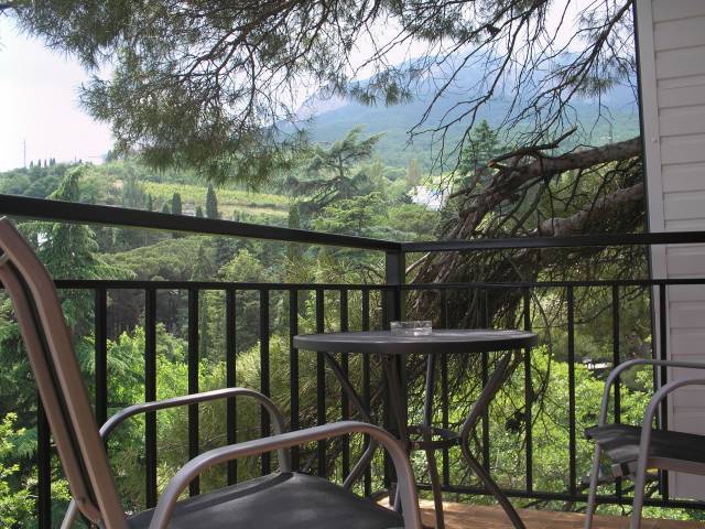 Вход в номер находится на 2 этаже, балкон со столиком и удобными креслами - на уровне 4 этажа, размер балкона 4*1,7 м, площадь номера 30м2. В номере: панорамные окна, вид на Гурзуф и крымские горы. Спальные места: двуспальная кровать и двуспальный диван, мебель и техника: шкаф, кондиционер, теплый пол, телевизор, кабельное телевидение, гладильная доска, утюг, фен, wi-fi, санузел, горячая и холодная вода постоянно, мини-кухня: 2 газовые конфорки, вытяжка, электрочайник, мойка, набор посуды, холодильник.