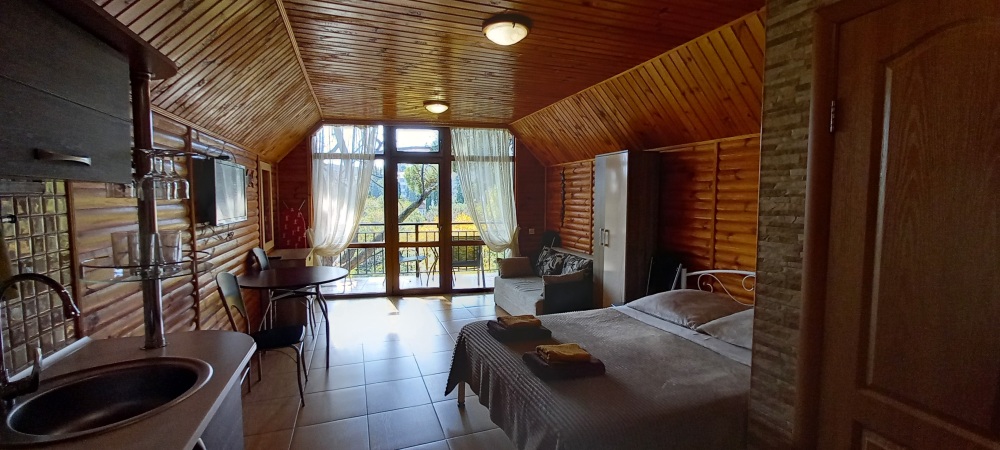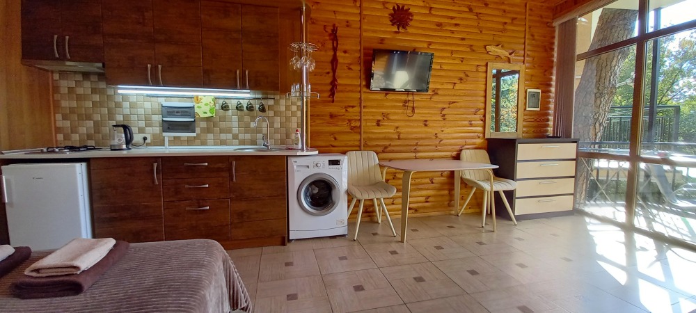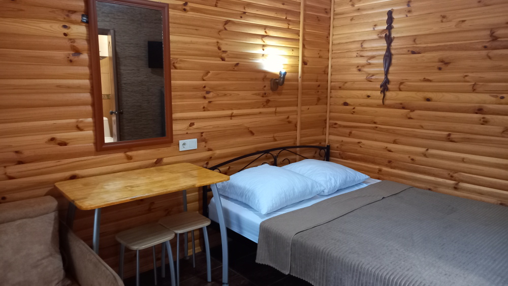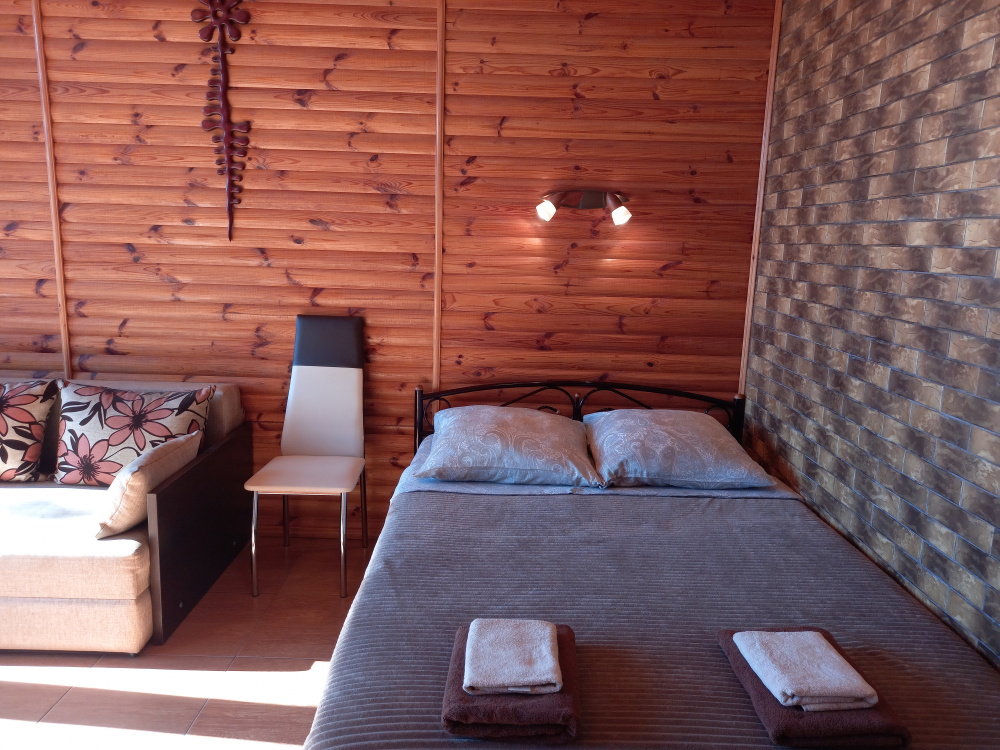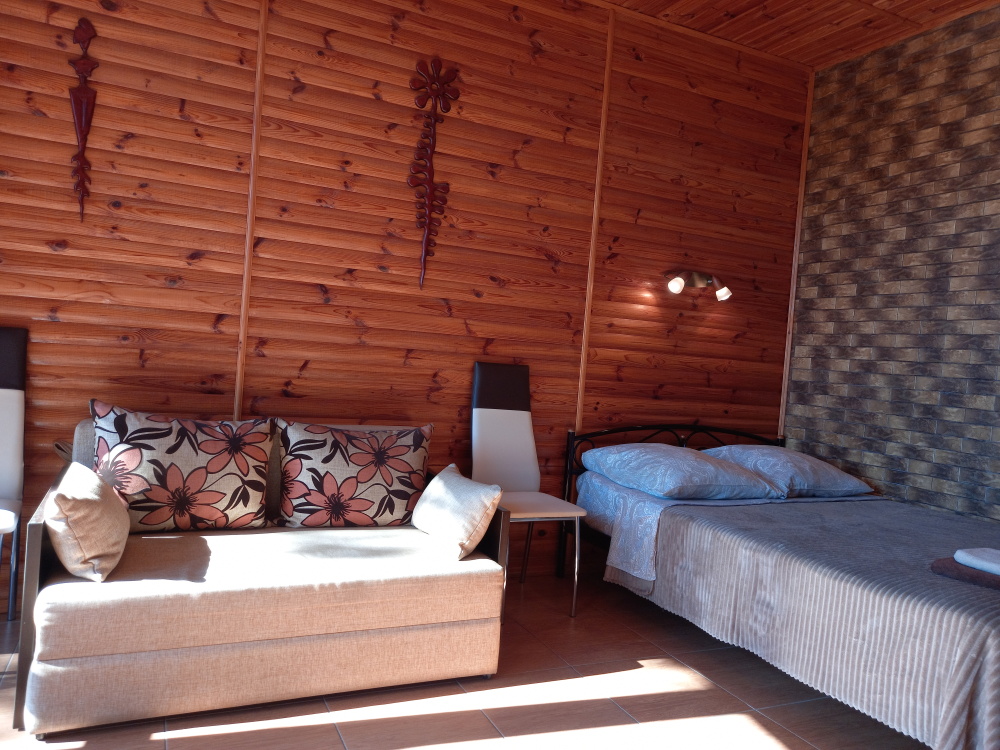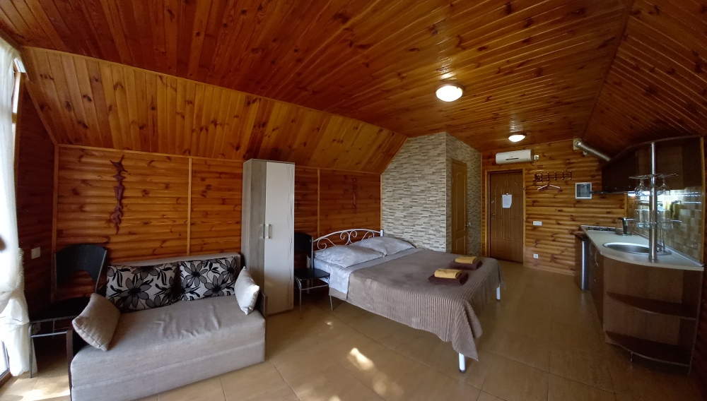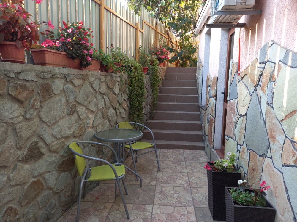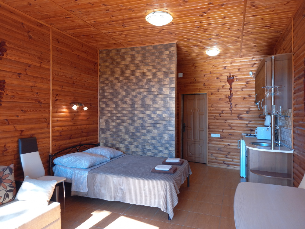 Есть дворик: столик и удобные кресла, сушилка для белья, которые относятся к данному номеру и их не занимают другие гости. В номере двуспальная кровать и кресло кровать, шкаф-купе, комод, кондиционер, теплый пол, телевизор, кабельное телевидение, санузел, фен, гладильная доска, утюг, мини-кухня: 2 конфорки, вытяжка, электрочайник, мойка для посуды, холодильник, посуда, WI-FI.
