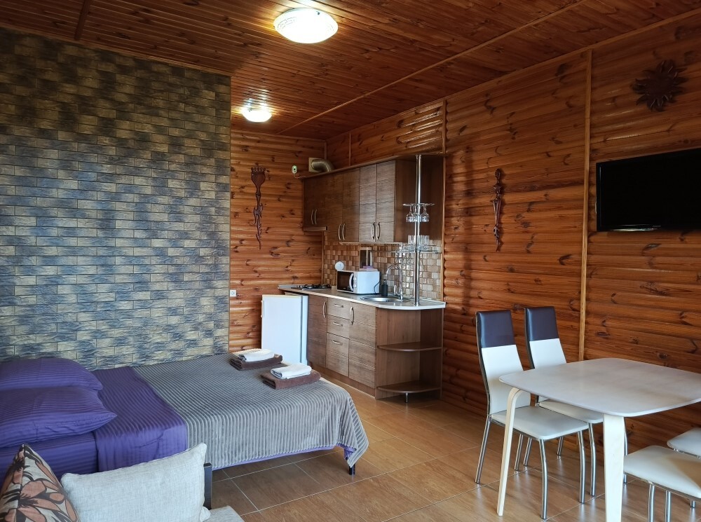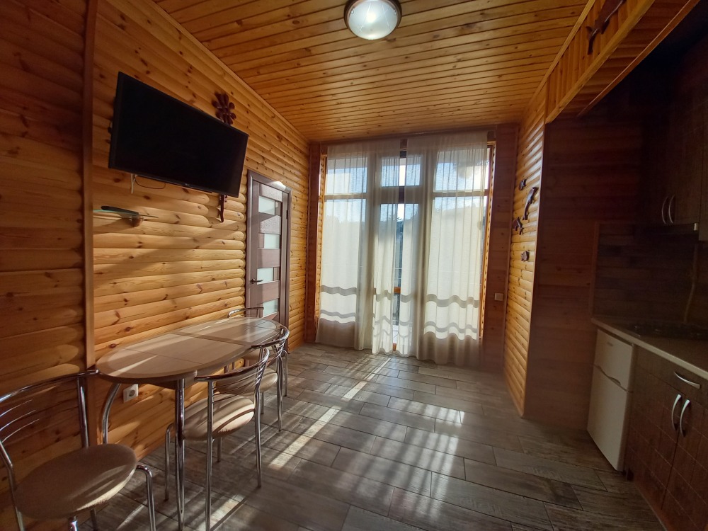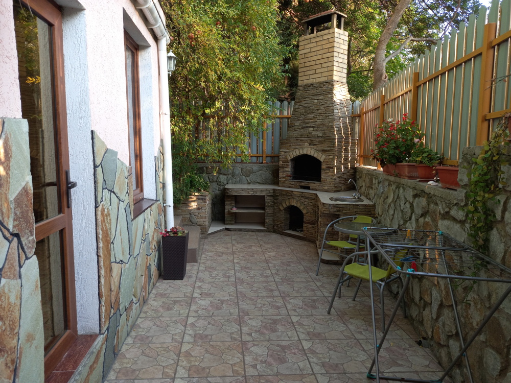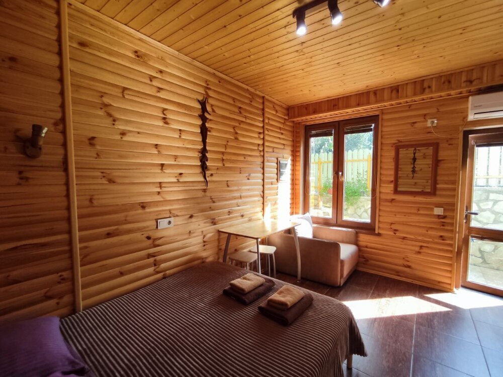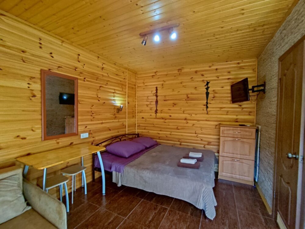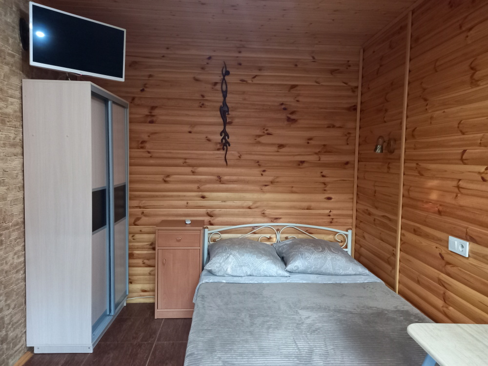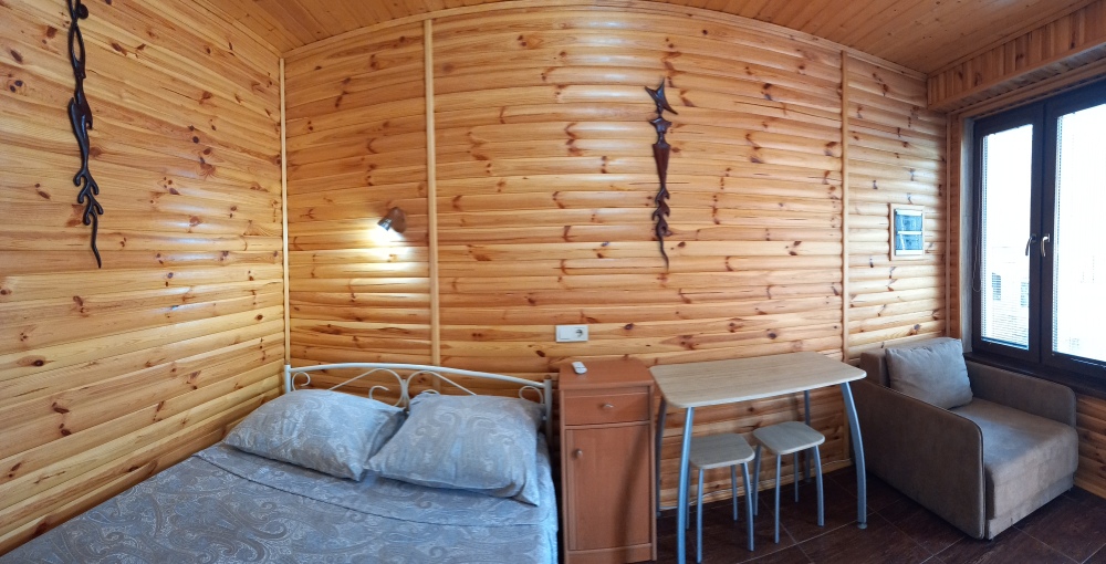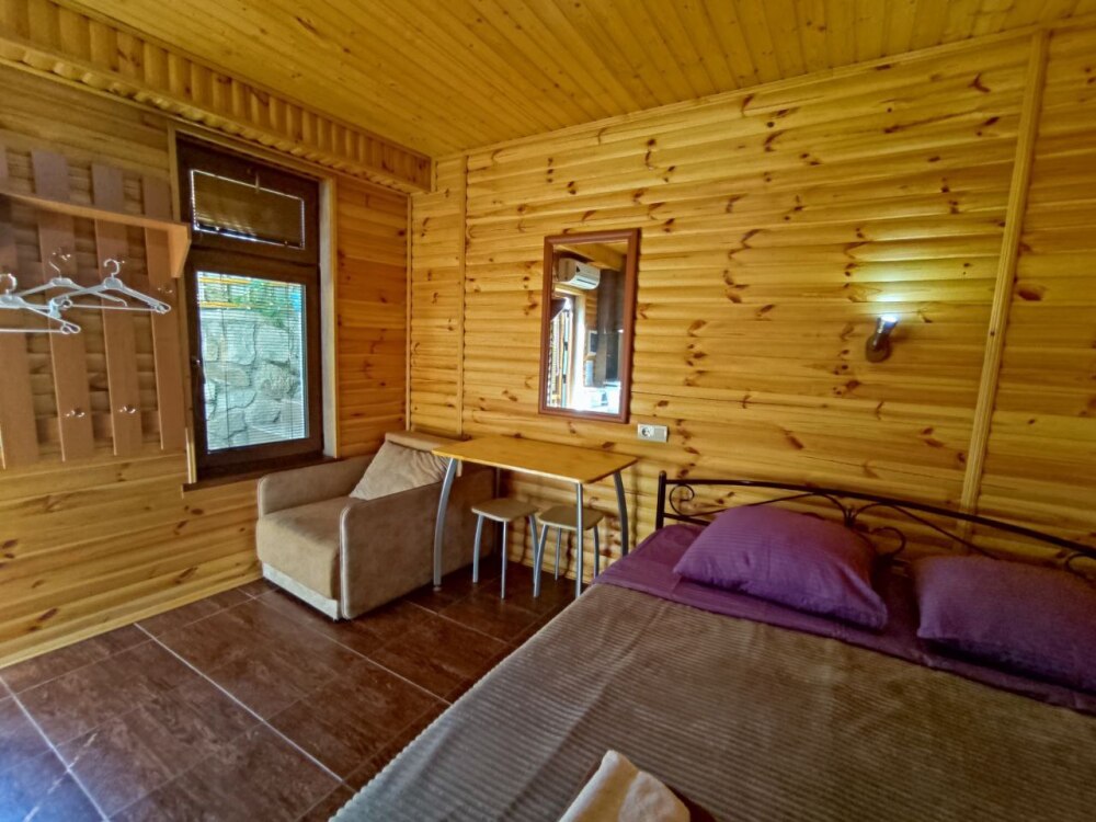 Есть дворик: столик и удобные кресла, сушилка для белья, которые относятся к данному номеру и их не занимают другие гости. В номере двуспальная кровать и кресло кровать, шкаф-купе, комод, кондиционер, теплый пол, телевизор, кабельное телевидение, санузел, фен, гладильная доска, утюг, мини-кухня: 2 конфорки, вытяжка, электрочайник, мойка для посуды, холодильник, посуда, WI-FI.