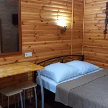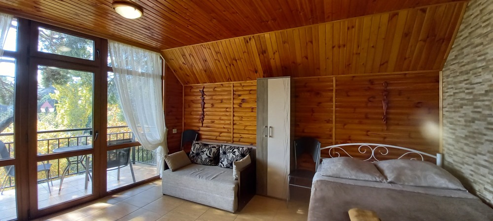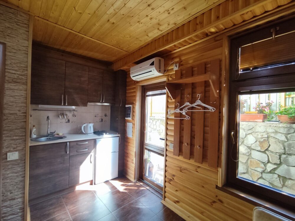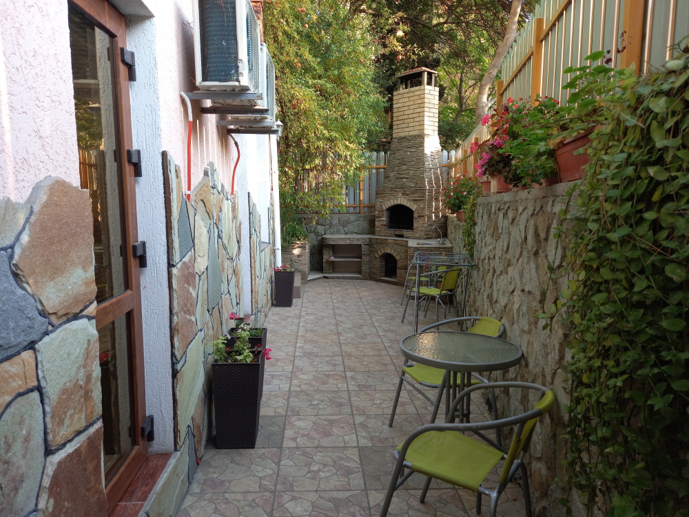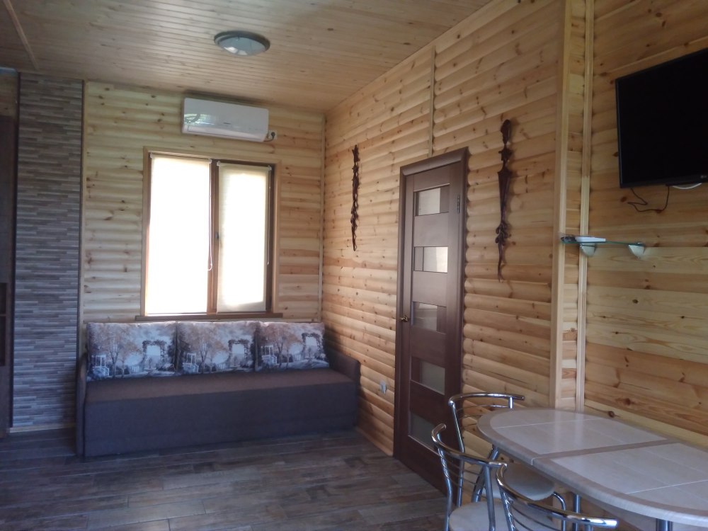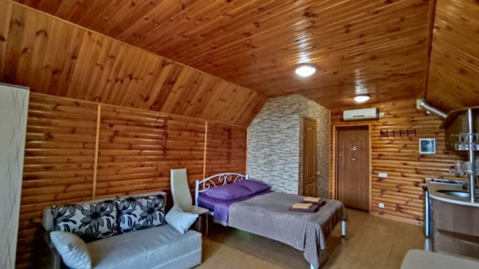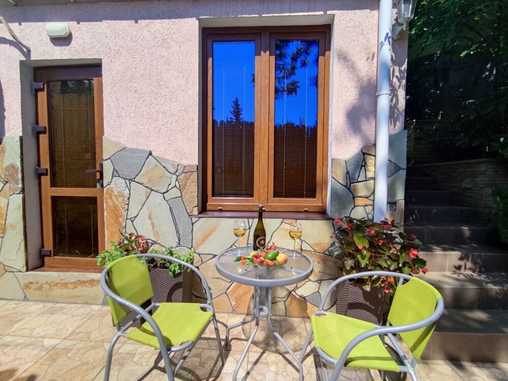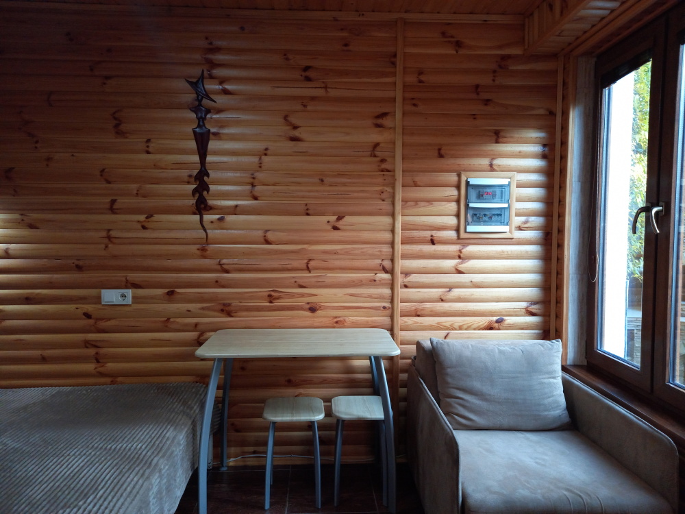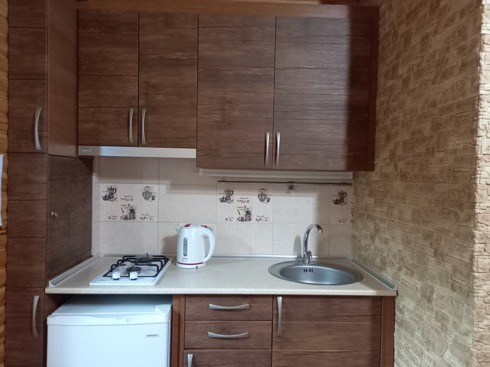 Есть дворик: столик и удобные кресла, сушилка для белья, которые относятся к данному номеру и их не занимают другие гости. В номере двуспальная кровать и кресло кровать, шкаф-купе, комод, кондиционер, теплый пол, телевизор, кабельное телевидение, санузел, фен, гладильная доска, утюг, мини-кухня: 2 конфорки, вытяжка, электрочайник, мойка для посуды, холодильник, посуда, WI-FI.