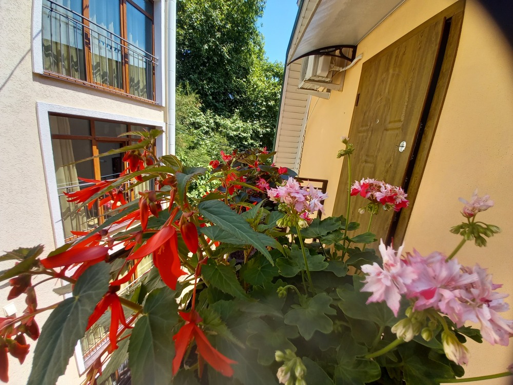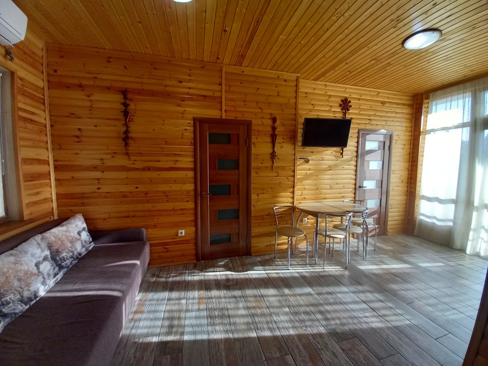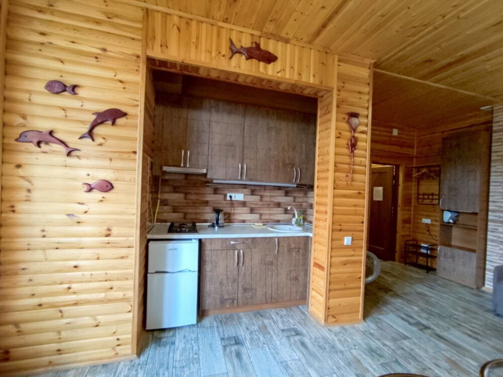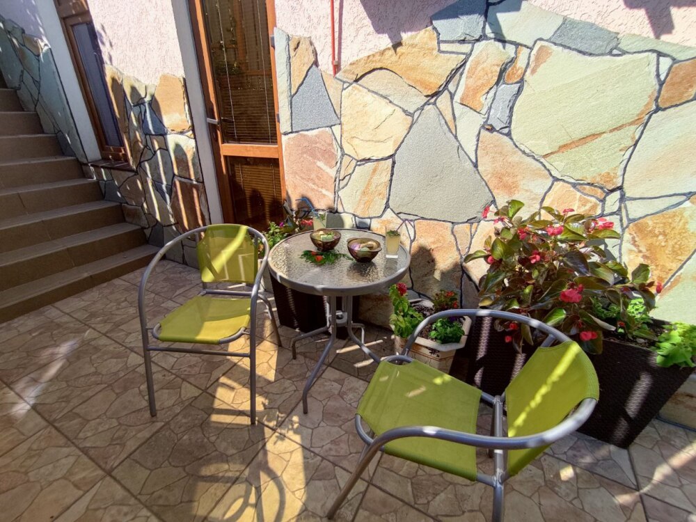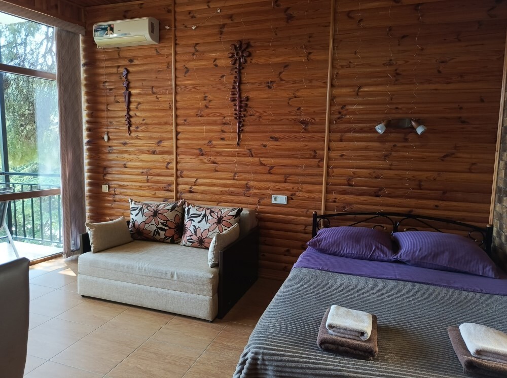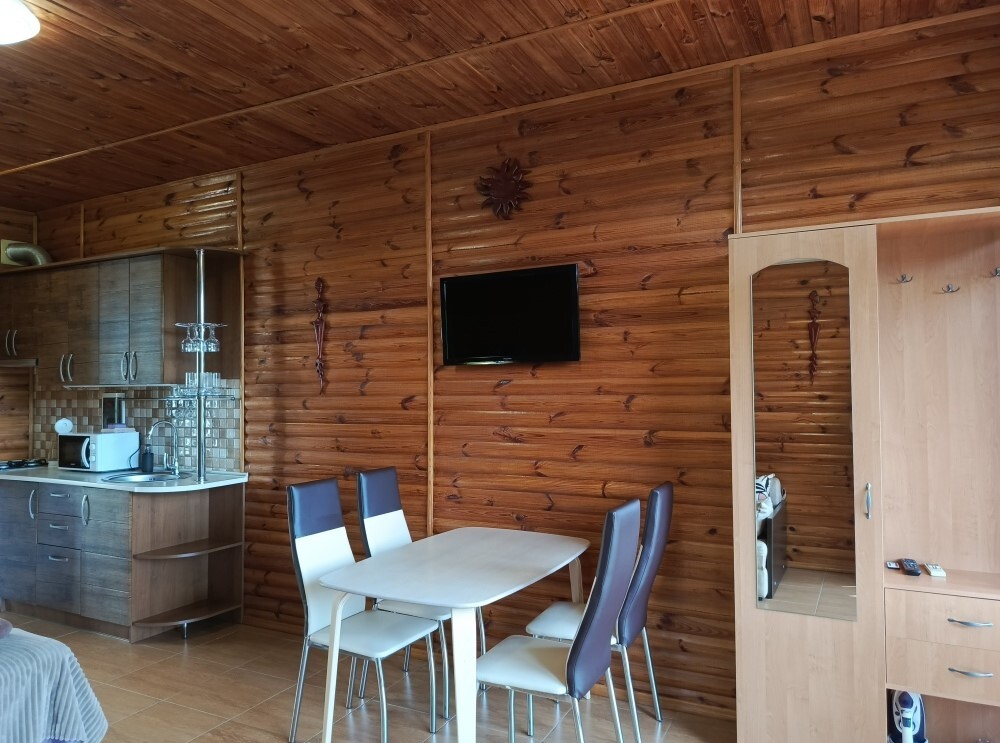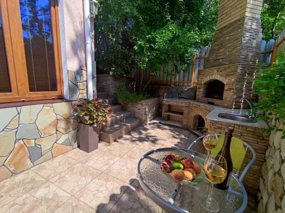 Есть дворик: столик и удобные кресла, сушилка для белья, которые относятся к данному номеру и их не занимают другие гости. В номере двуспальная кровать и кресло кровать, шкаф-купе, комод, кондиционер, теплый пол, телевизор, кабельное телевидение, санузел, фен, гладильная доска, утюг, мини-кухня: 2 конфорки, вытяжка, электрочайник, мойка для посуды, холодильник, посуда, WI-FI.