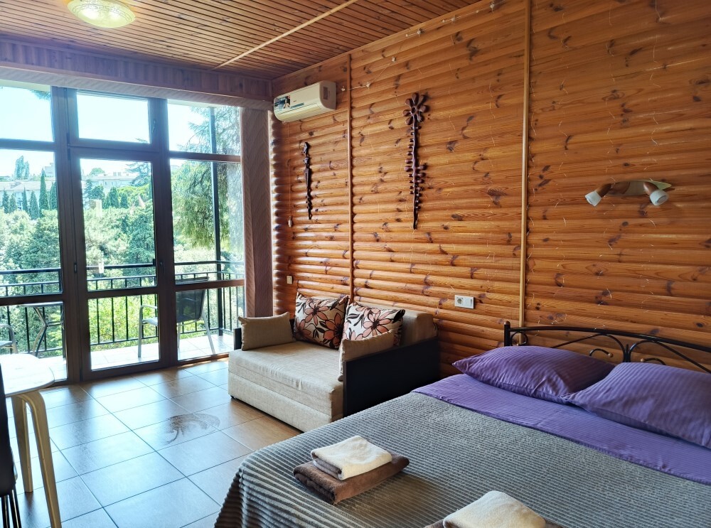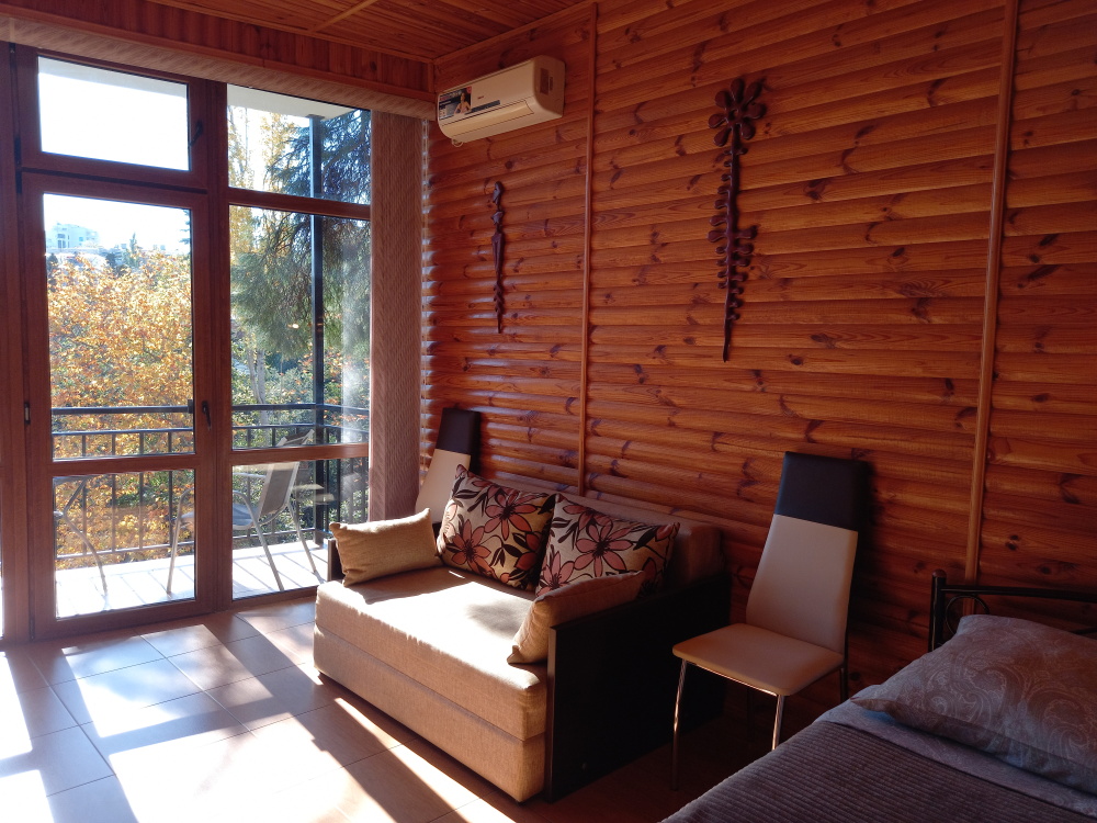 С балконами и панорамными окнами - вид на море и горы, балконы 4*1,8 м, площадь номера 30м2, количество человек - 2-4, для сна двуспальная кровать + раскладной двухместный диван.