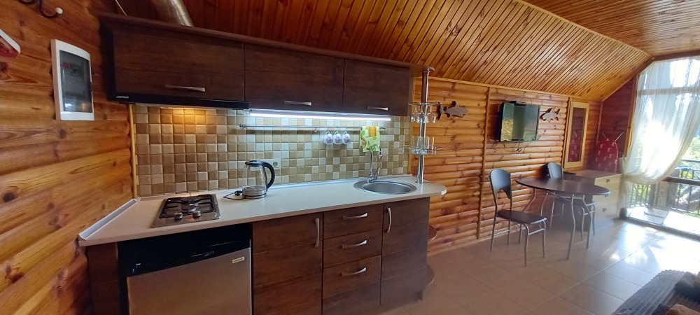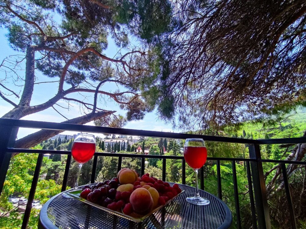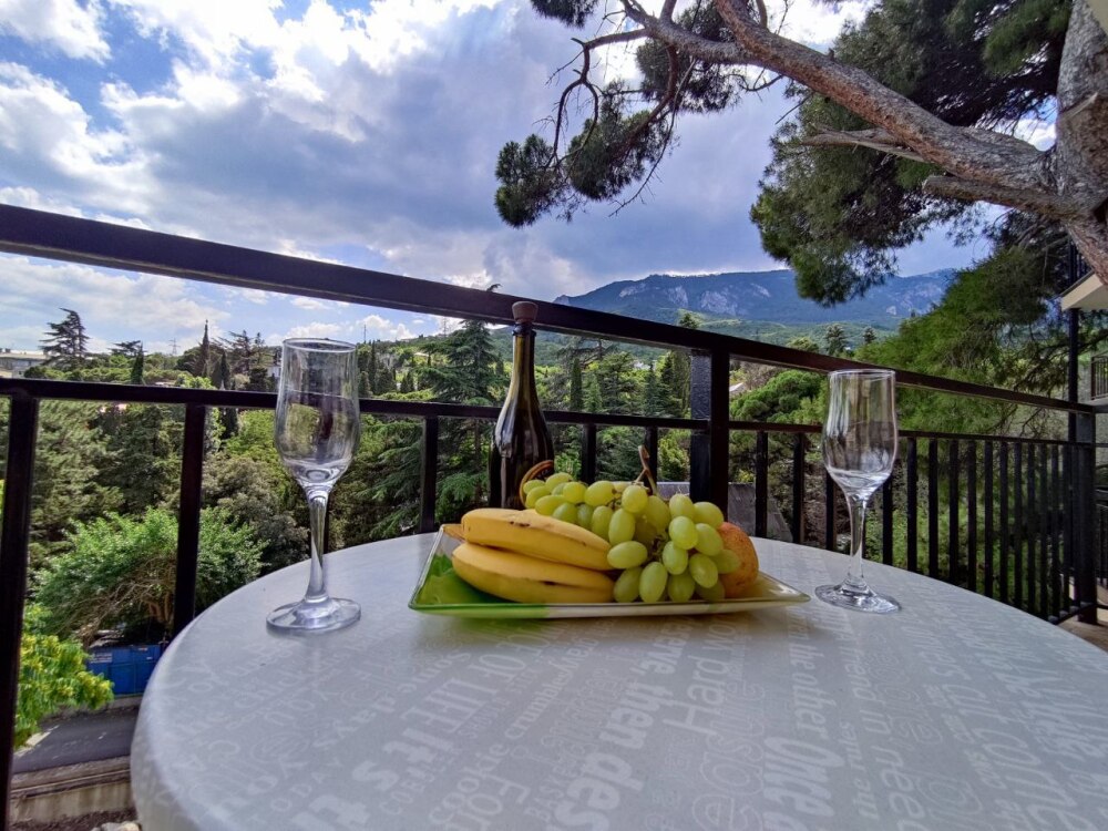 Вход в номер находится на 3 этаже по винтовой лестнице, но подъем компенсируется прекрасным видом на море и горы, панорамные окна дадут возможность насладиться красотой южного берега Крыма, балкон с удобными креслами и столиком - на уровне 5 этажа, его размеры - 4*1,8 м. Спальные места: двуспальная кровать и двуспальный диван, мебель и техника: вешалка, шкаф, комод, кондиционер, теплый пол, телевизор, кабельное телевидение, санузел, гладильная доска, утюг, фен, мини-кухня: 2 газовые конфорки, вытяжка, электрочайник, мойка, холодильник, набор посуды, WI-FI.
