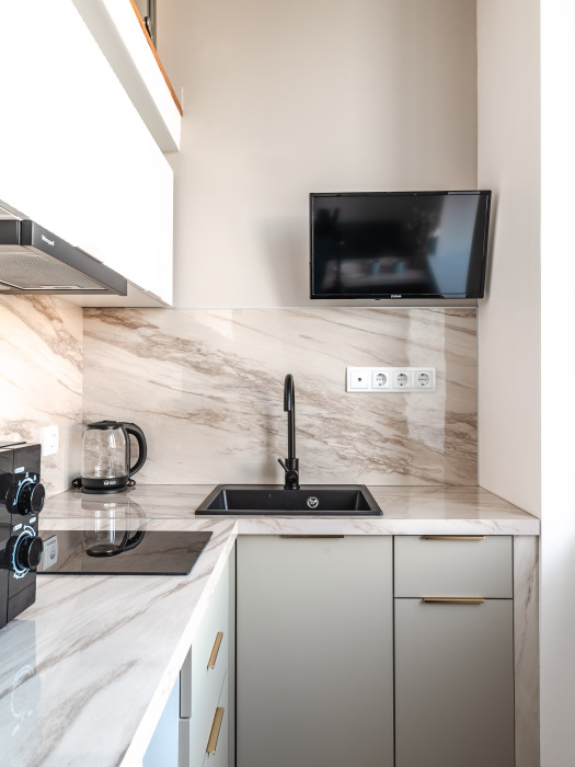 В квартире есть все необходимое для комфортного проживания: двуспальная кровать, раскладное кресло, телевизор, кухонная зона со всем необходимым, совмещенный санузел с ванной.