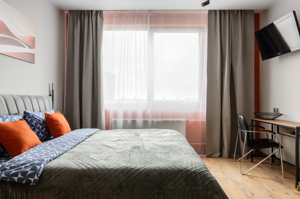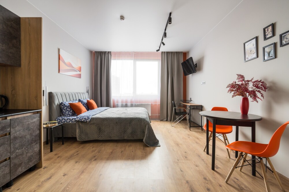 Двухспальная кровать 160х200 с ортопедическим матрасом, прикроватные тумбы. Современный ЖК-телевизор со SmаtrТV для просмотра любимых программ и фильмов, застекленный балкон.