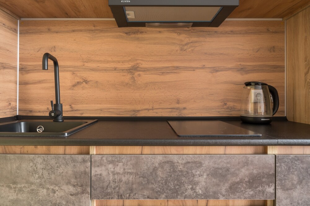 Кухонная зона: полностью оборудованный кухонный гарнитур с электрическим чайником, микроволновкой, холодильником и всей необходимой посудой для приготовления, также обеденный стол и стулья.