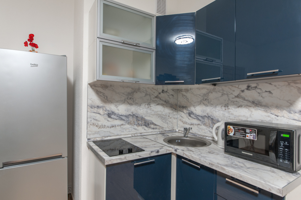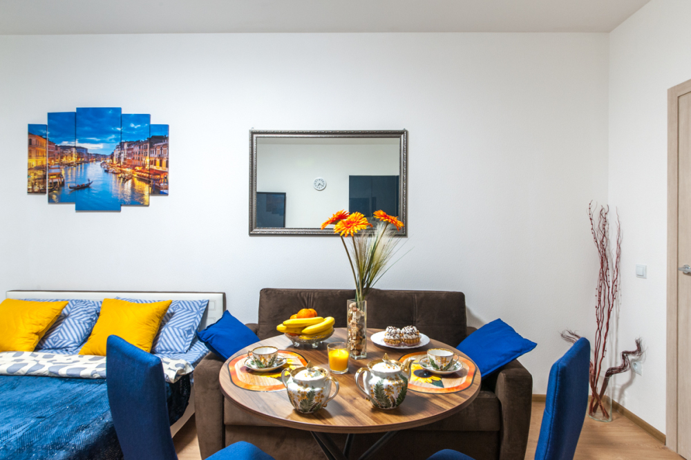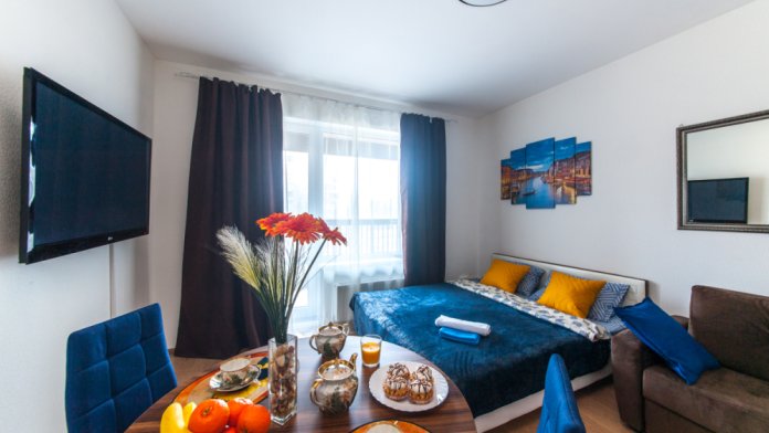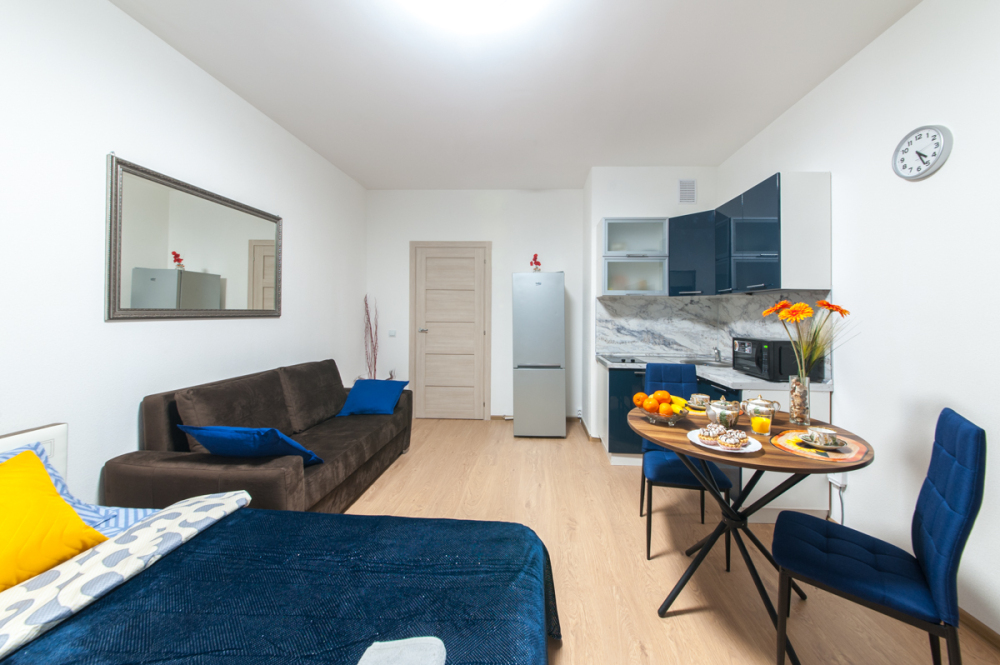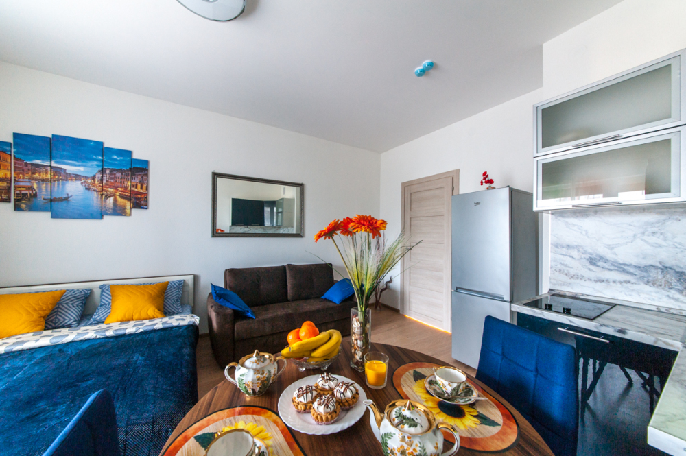 В квартире есть балкон и все необходимое для комфортного проживания: двуспальный раскладной диван, телевизор, кухонная зона со всем необходимым, совмещенный санузел.